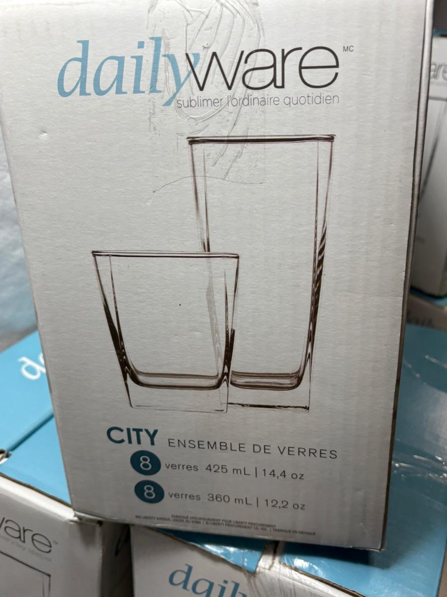 New in box glassware sets. Each box contains eight 14-oz. & eight 12.2-oz. glasses.