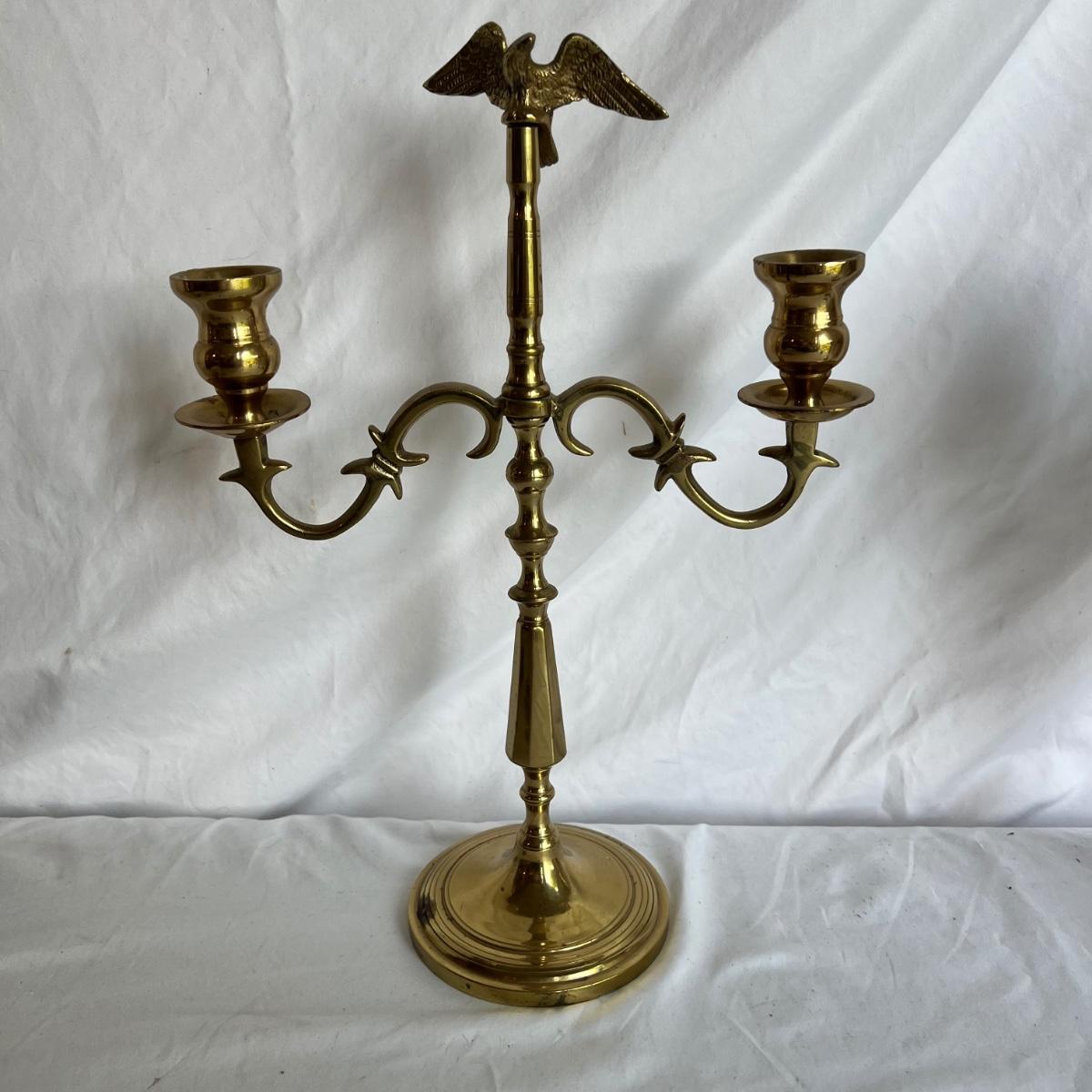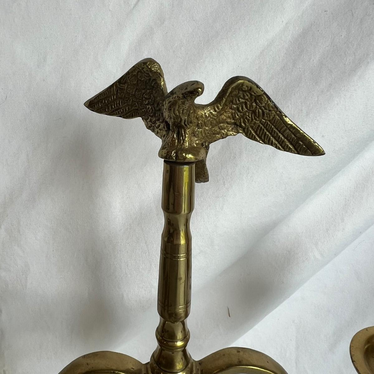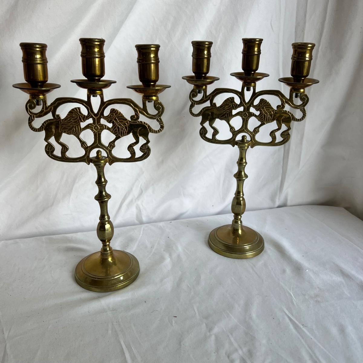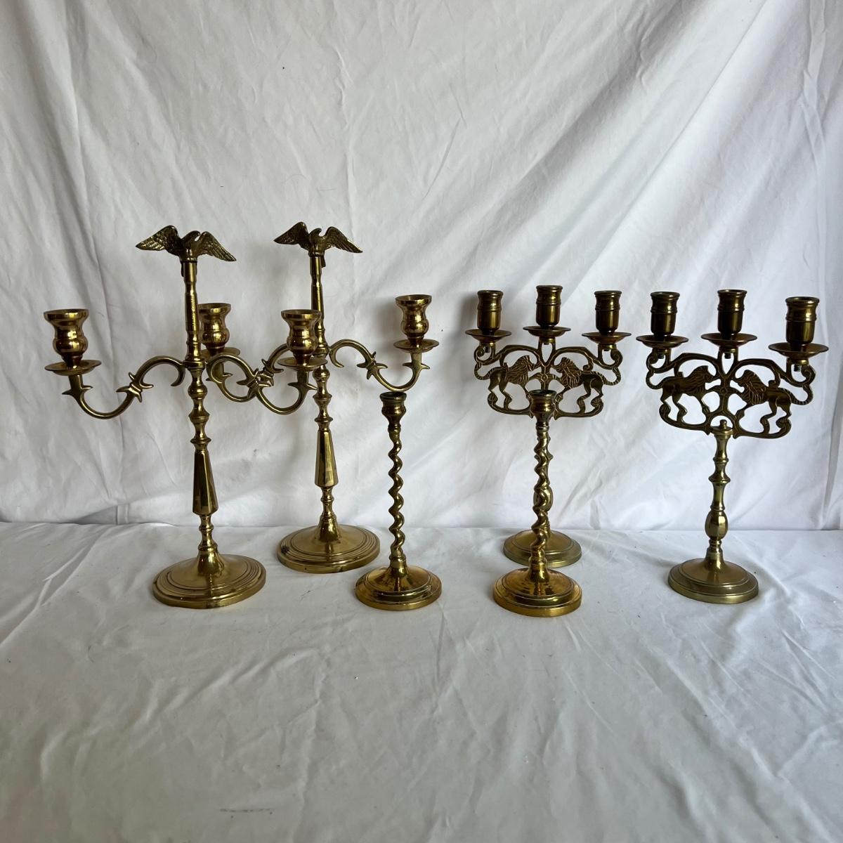 A pair of double candle candlesticks adorned with an eagle on top measure approximately 10” x 4” x 14”H each. A pair of cork screw style candlesticks measure approximately 3.5” D x 8”H. and a pair of what appear to be dragons that each have three candles measure approximately 7” x 3.5” x 11 H. All three pairs are heavy and appear to be brass.