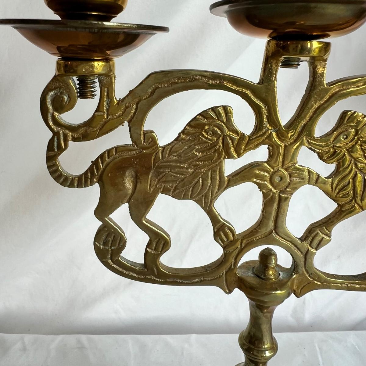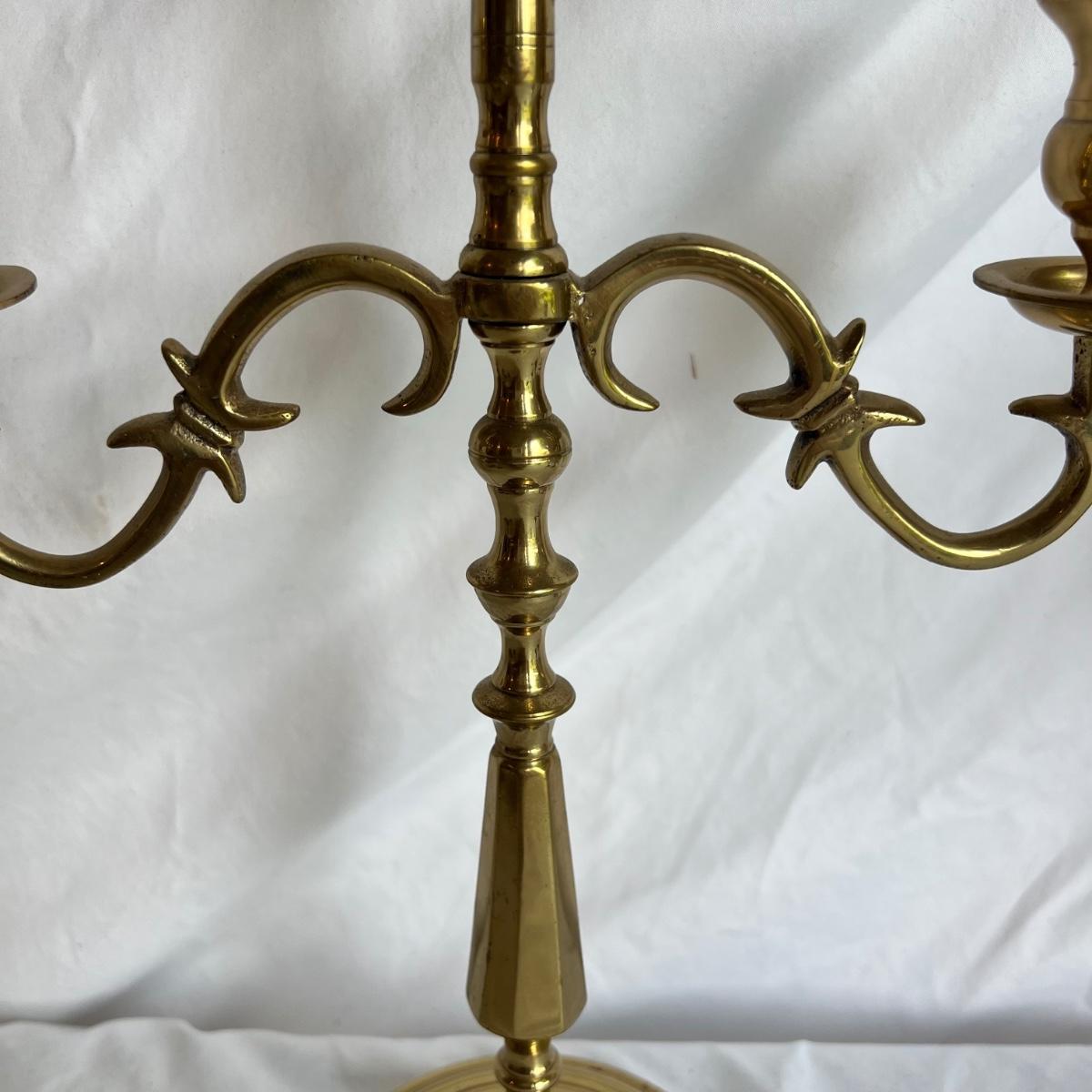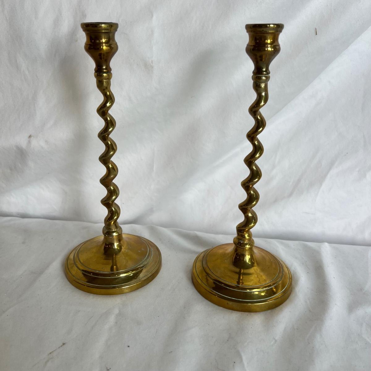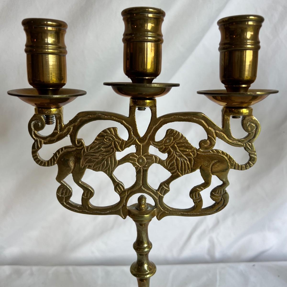A pair of double candle candlesticks adorned with an eagle on top measure approximately 10” x 4” x 14”H each. A pair of cork screw style candlesticks measure approximately 3.5” D x 8”H. and a pair of what appear to be dragons that each have three candles measure approximately 7” x 3.5” x 11 H. All three pairs are heavy and appear to be brass.