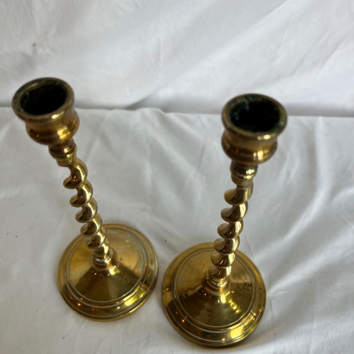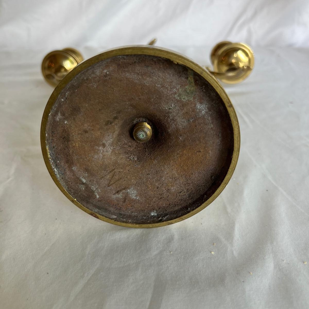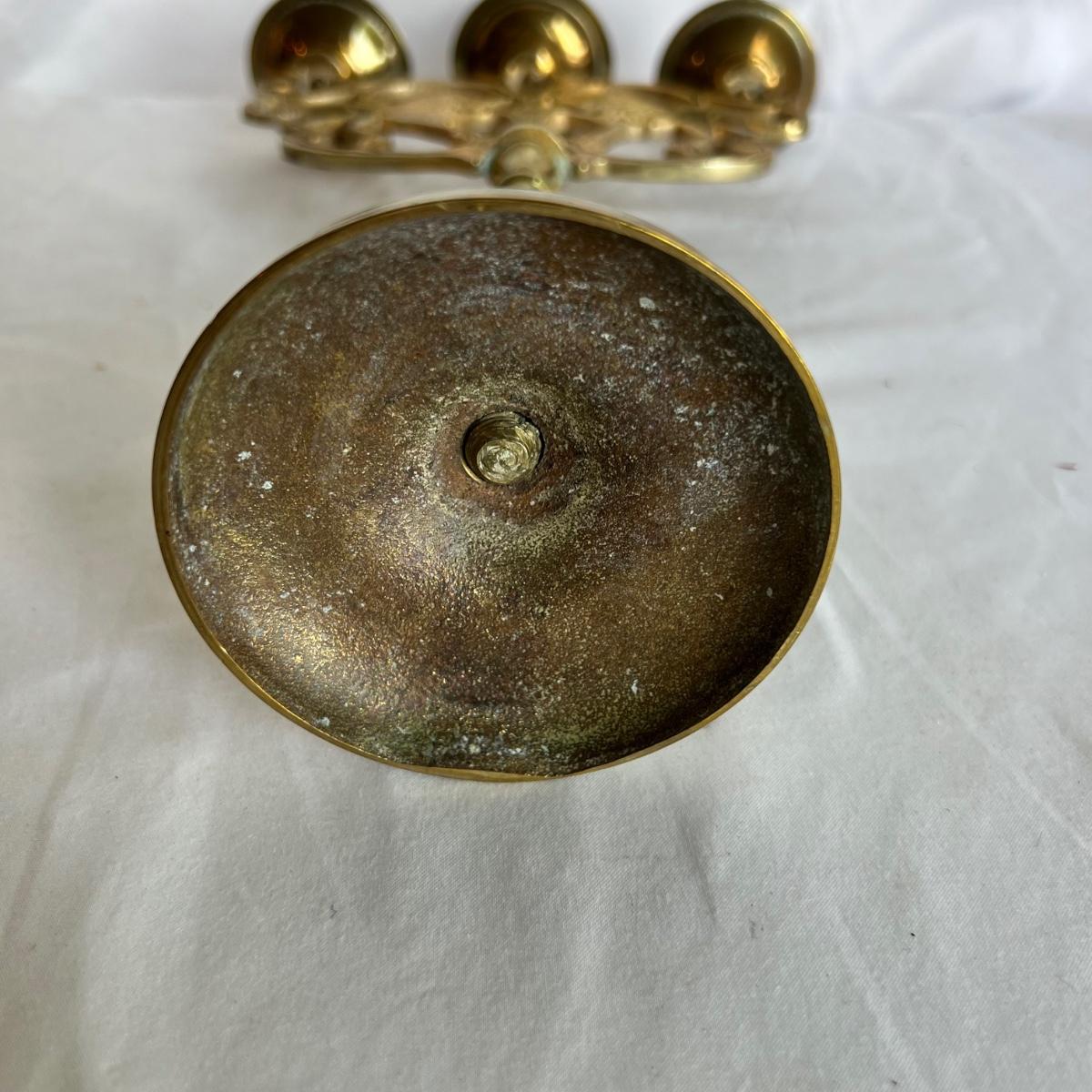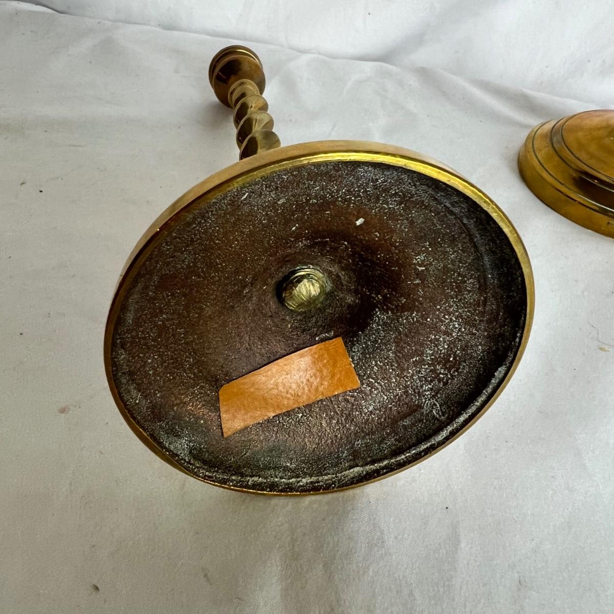 A pair of double candle candlesticks adorned with an eagle on top measure approximately 10” x 4” x 14”H each. A pair of cork screw style candlesticks measure approximately 3.5” D x 8”H. and a pair of what appear to be dragons that each have three candles measure approximately 7” x 3.5” x 11 H. All three pairs are heavy and appear to be brass.
