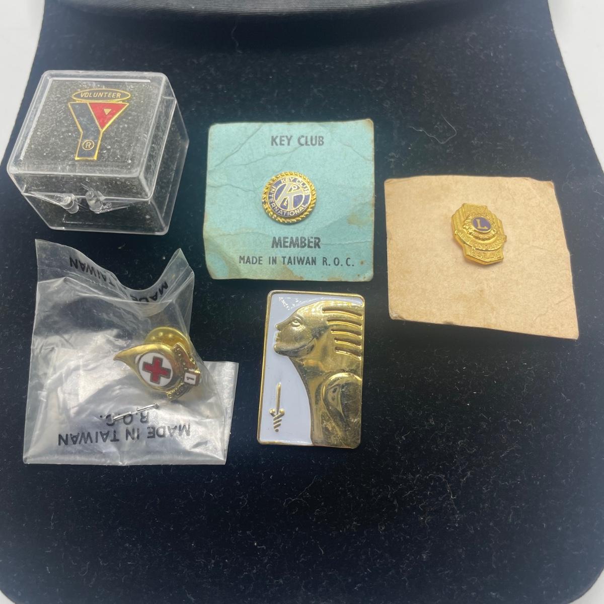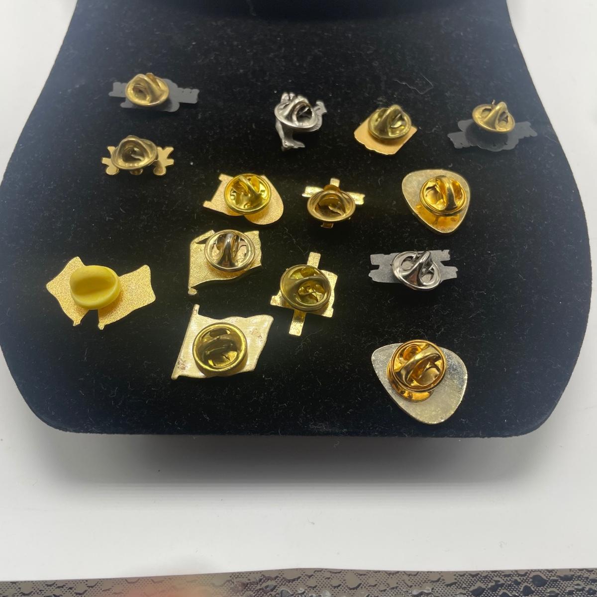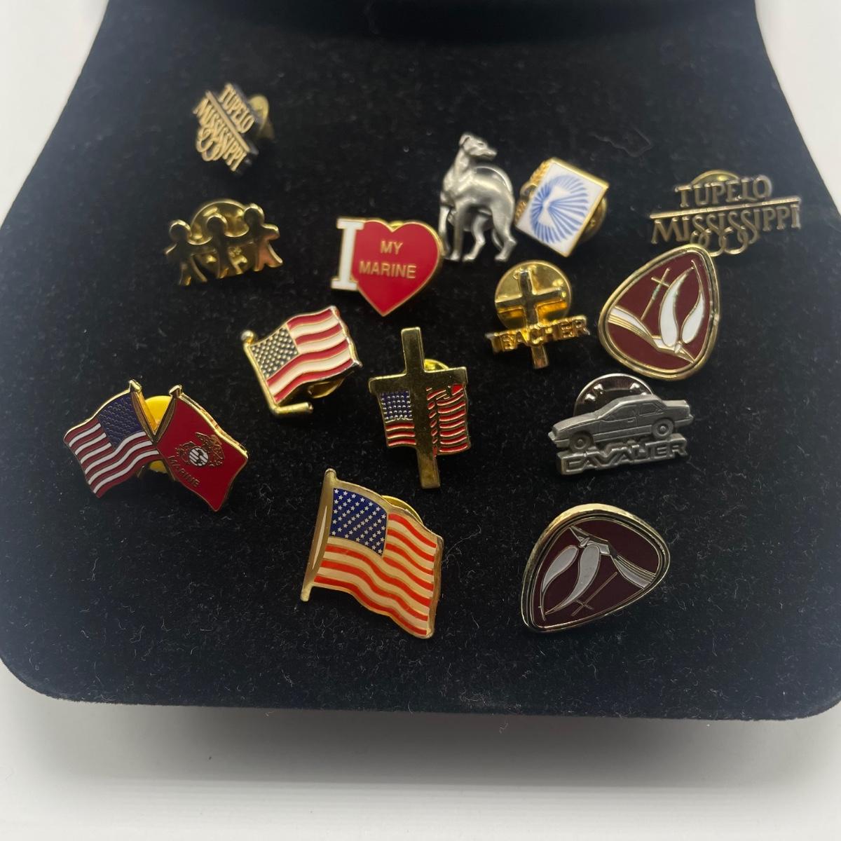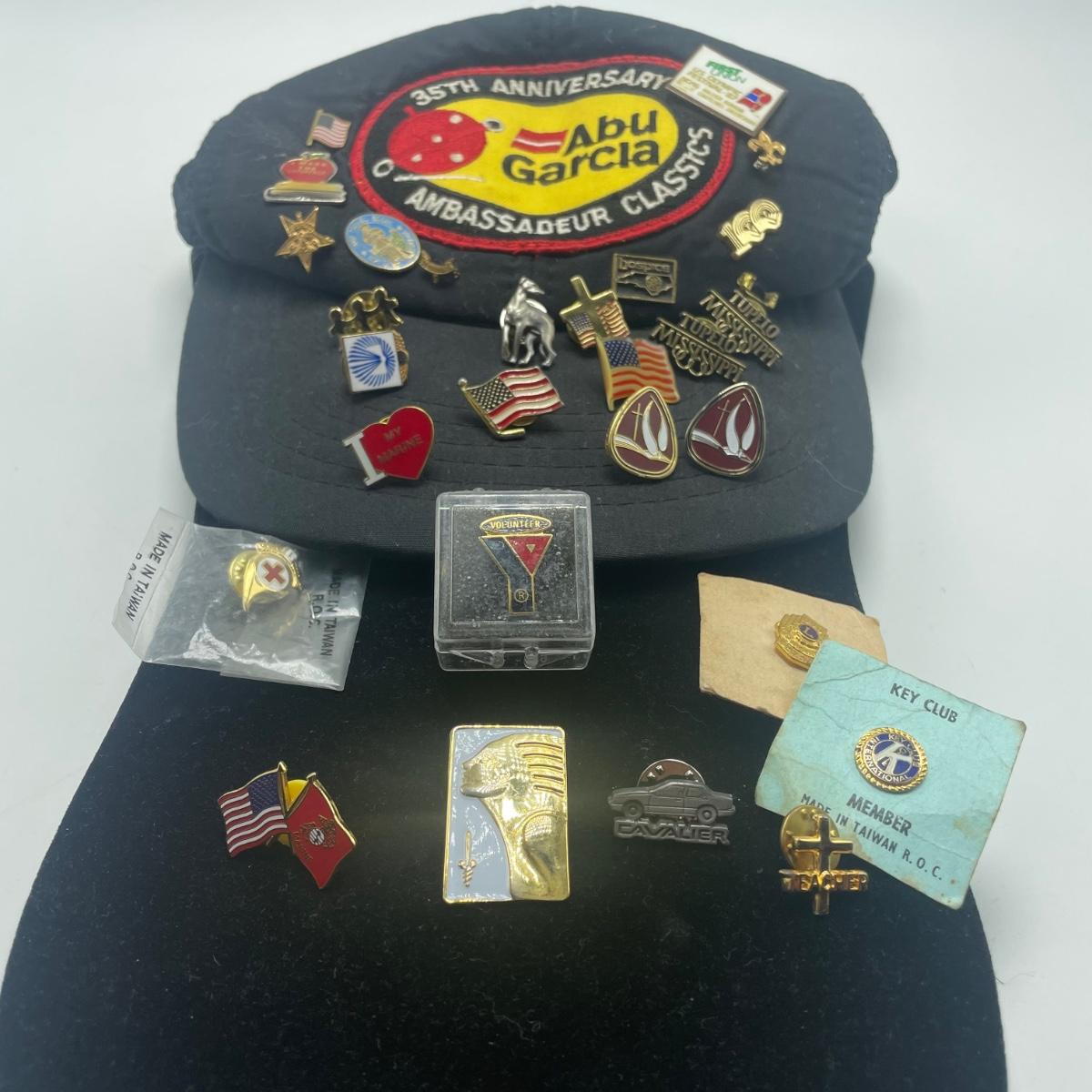 Six brooches and twenty four pins altogether here plus a black baseball cap.