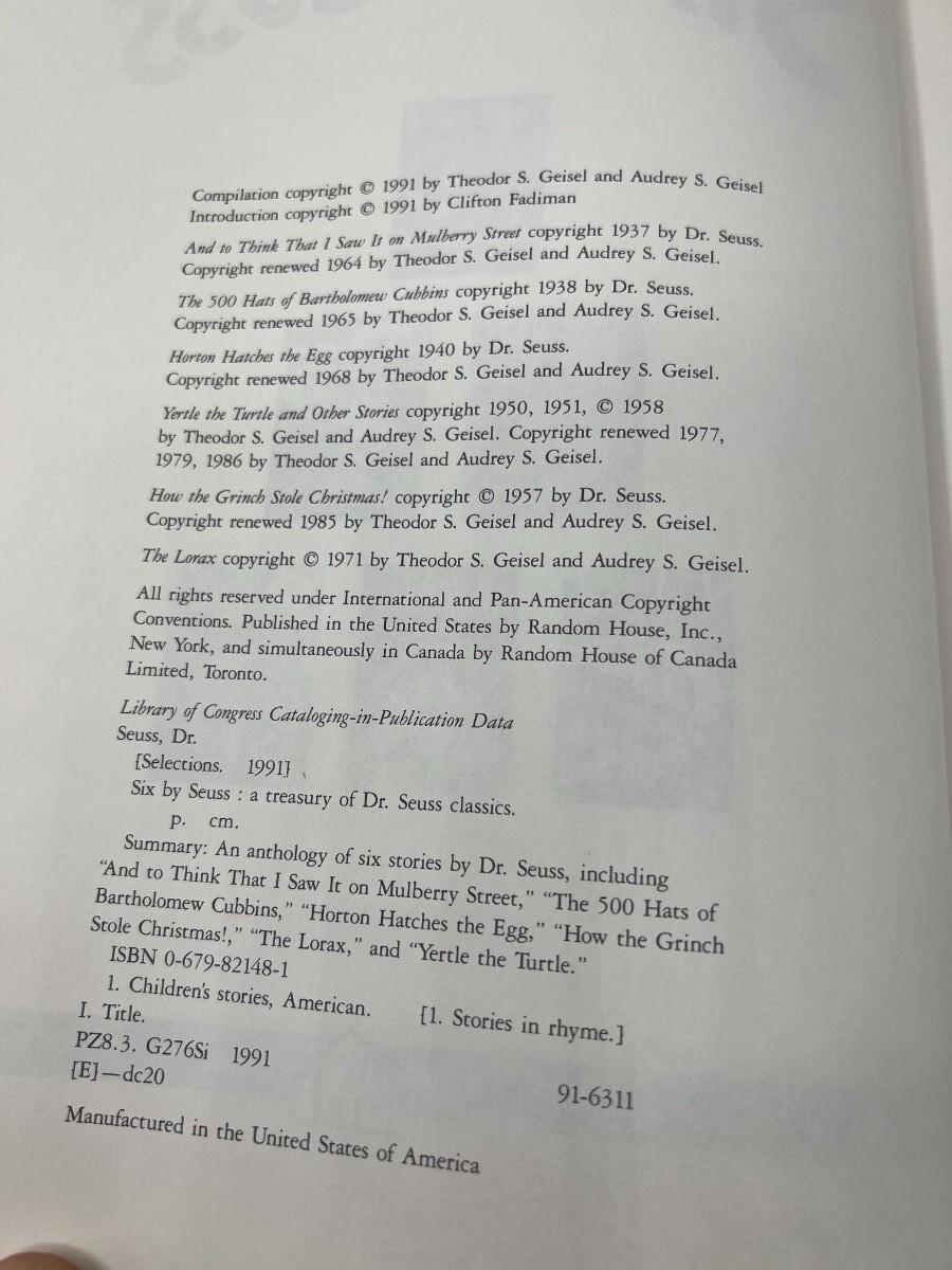 Six by Seuss A Treasury of Dr. Seuss Classics - All in One Hardback Book. Good Condition, light signs of use.