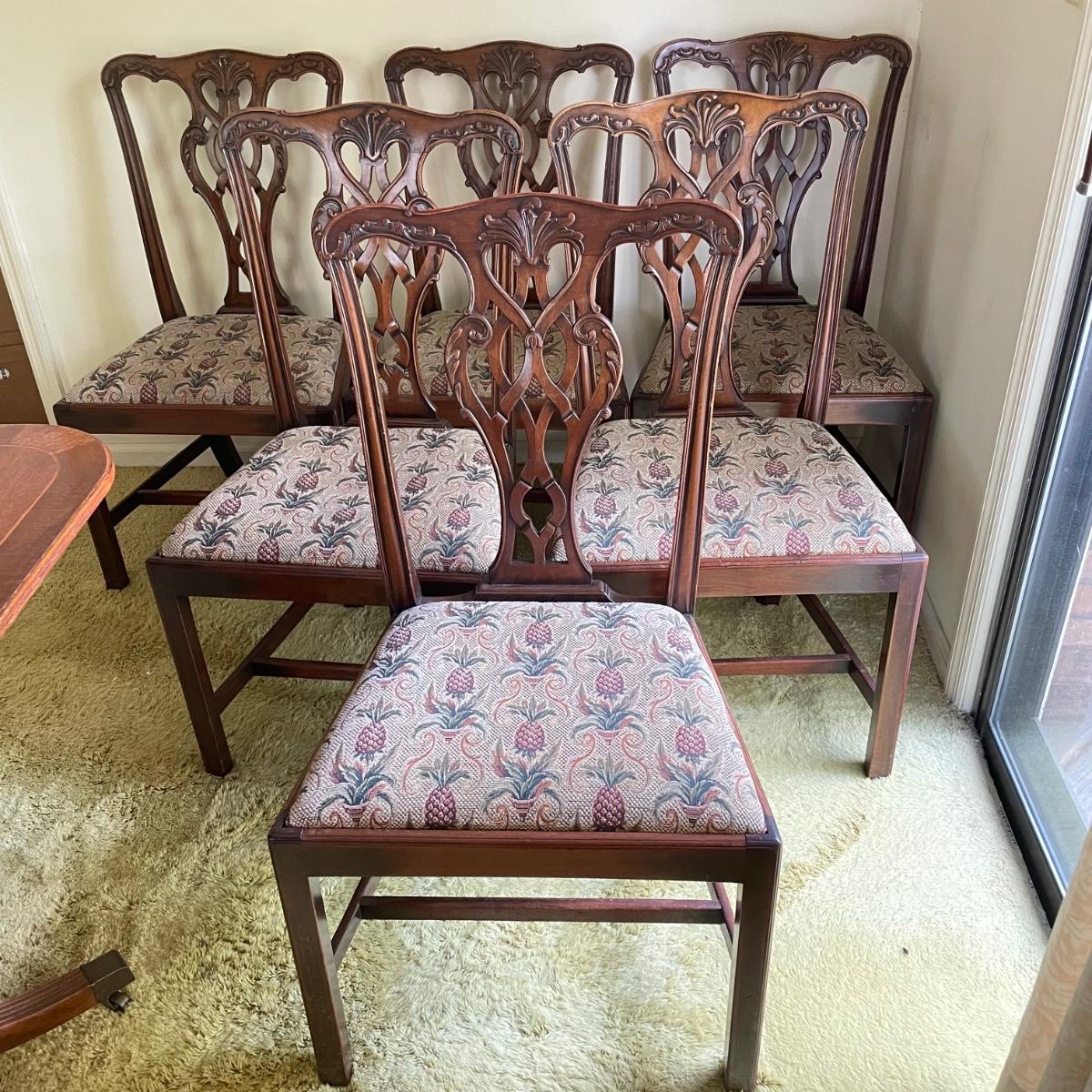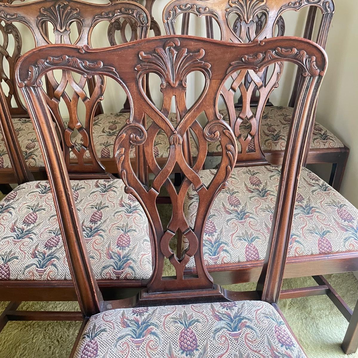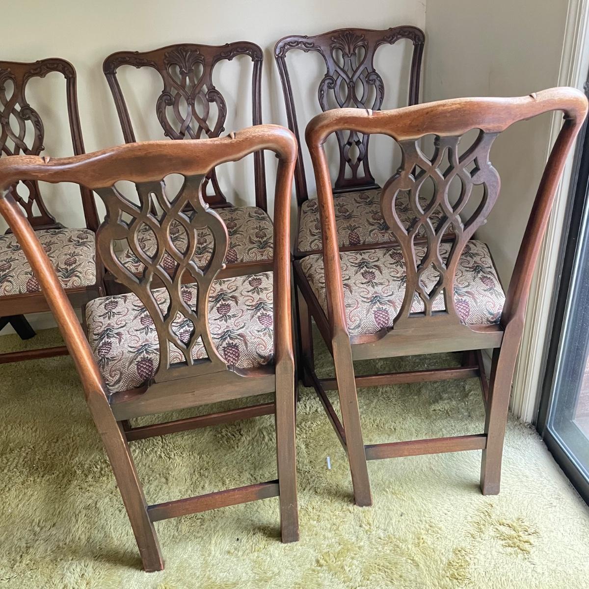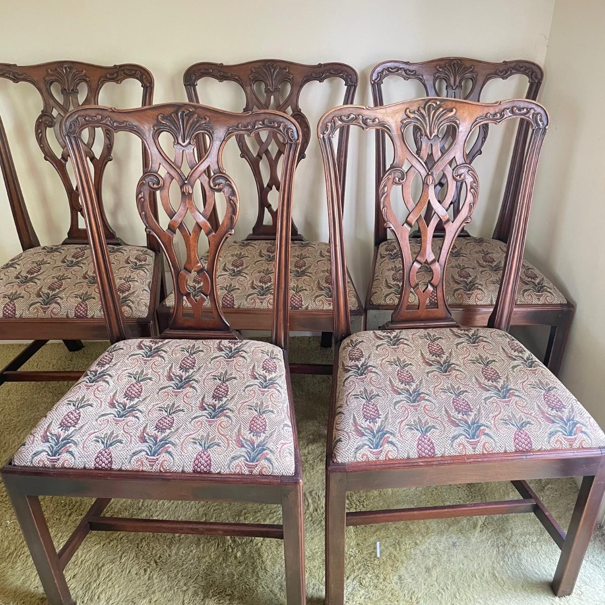 Six beautiful Chippendale reproduction chairs. Chairs have a nice finish and intricate carvings. They show some wear, but they are in great shape. The cushions are removed easily. Chairs measure 19” x 20” x 37.5” with a seat height at 18”. See images. Local pick up only.
