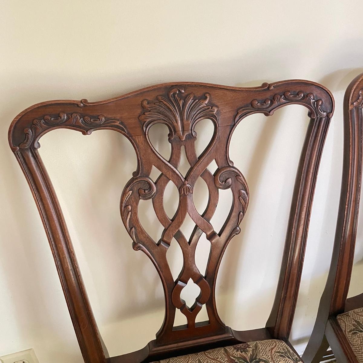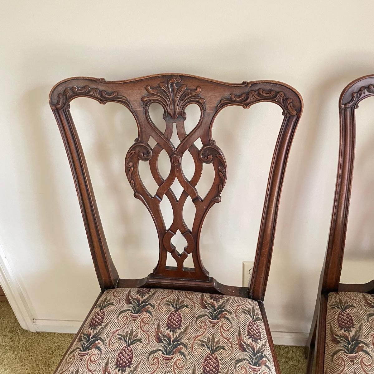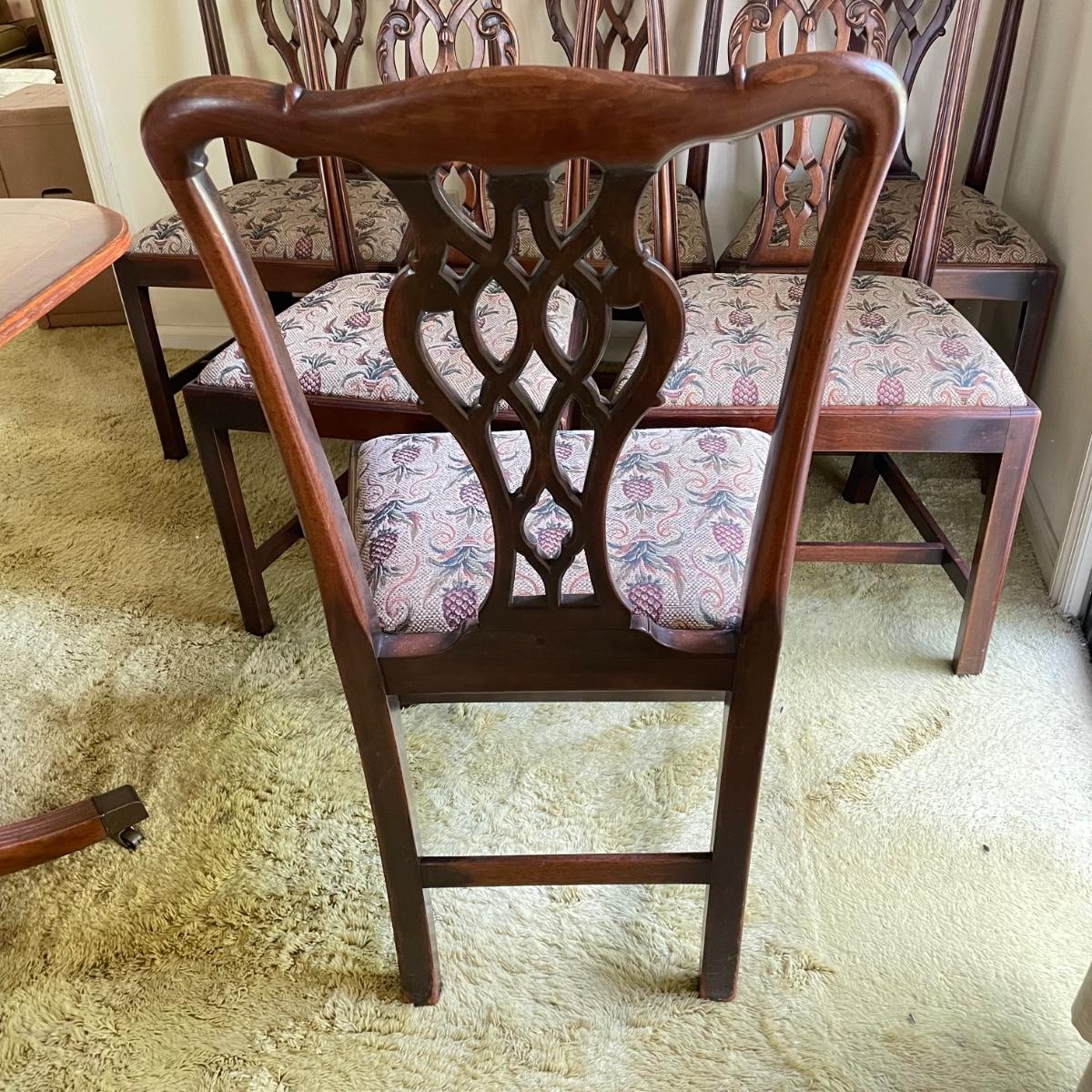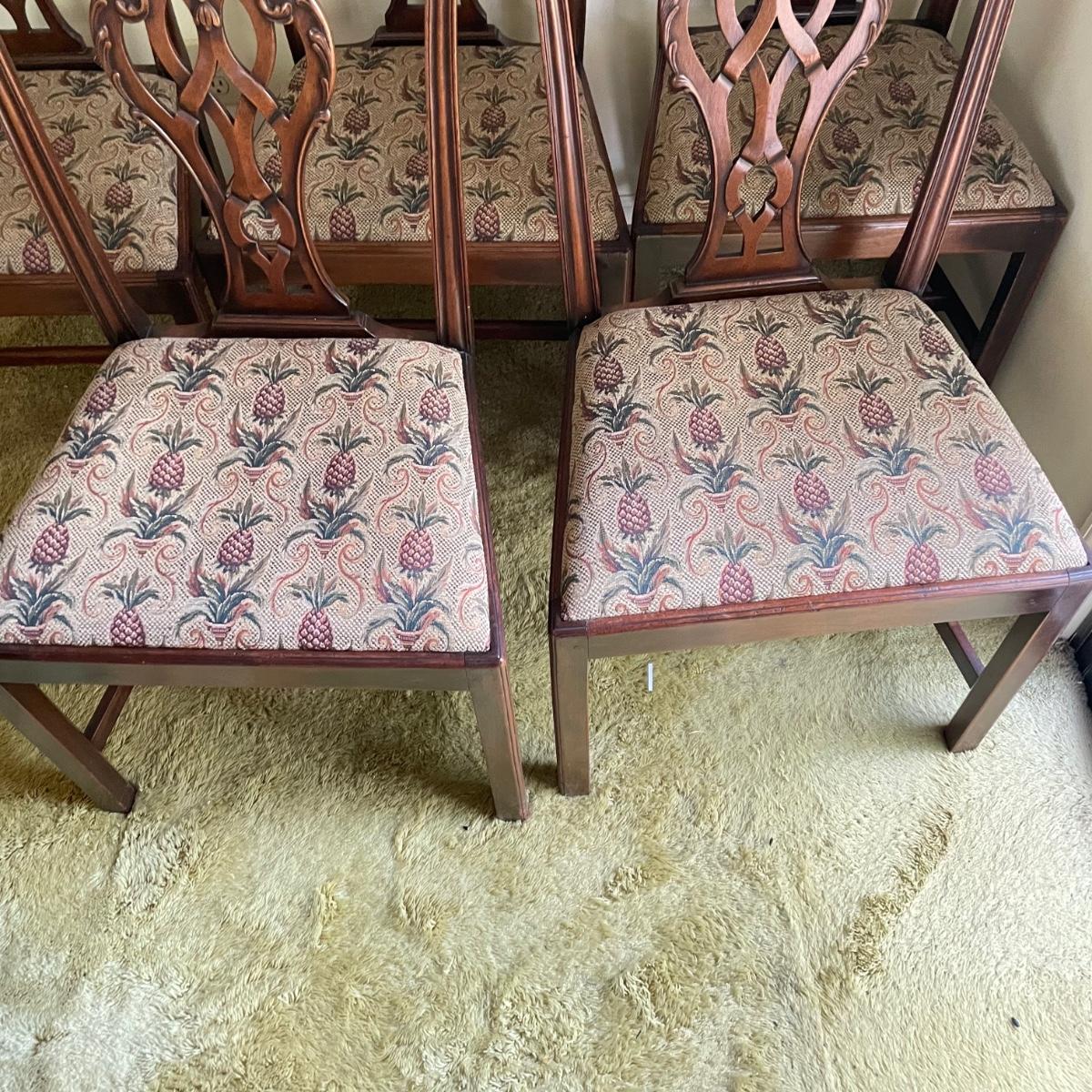 Six beautiful Chippendale reproduction chairs. Chairs have a nice finish and intricate carvings. They show some wear, but they are in great shape. The cushions are removed easily. Chairs measure 19” x 20” x 37.5” with a seat height at 18”. See images. Local pick up only.