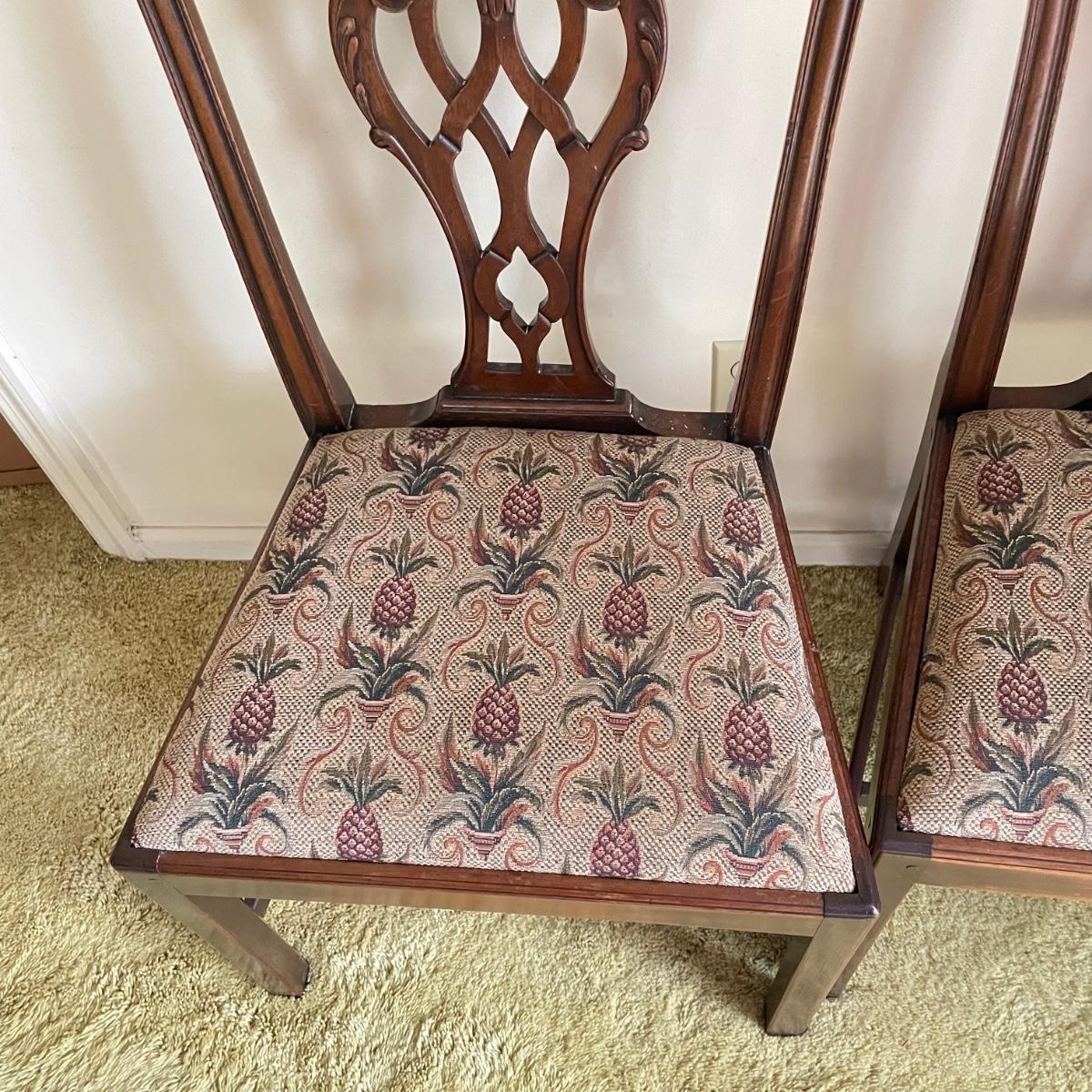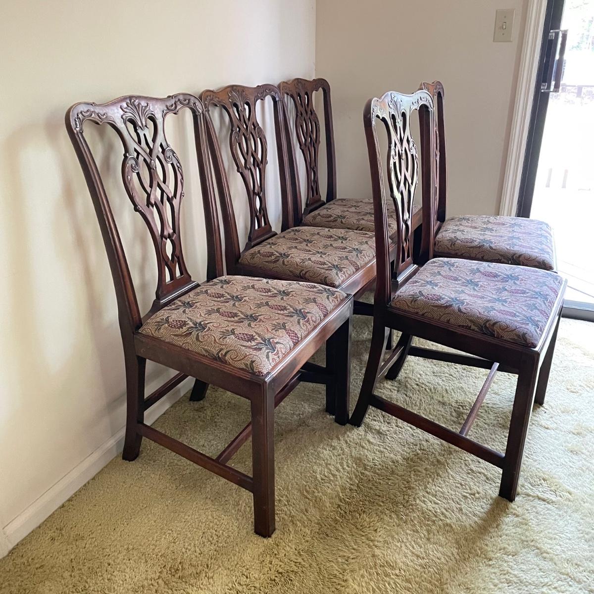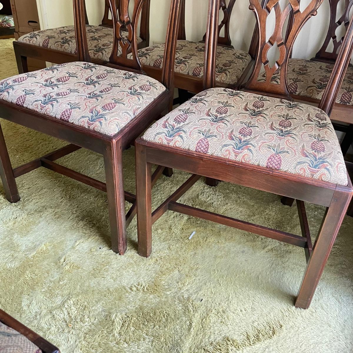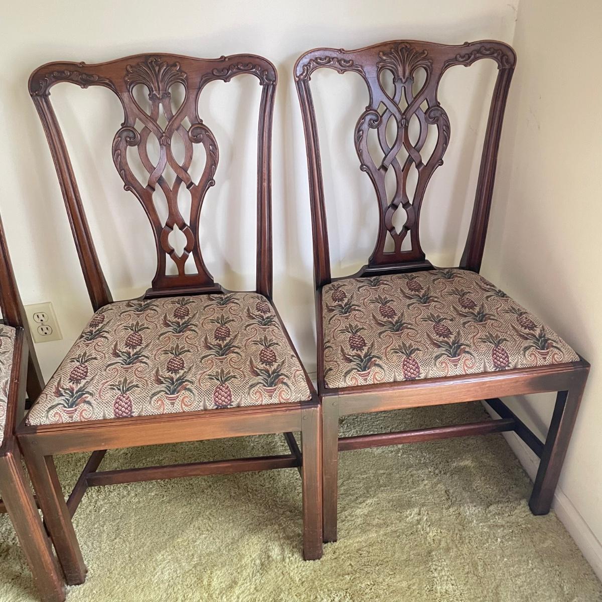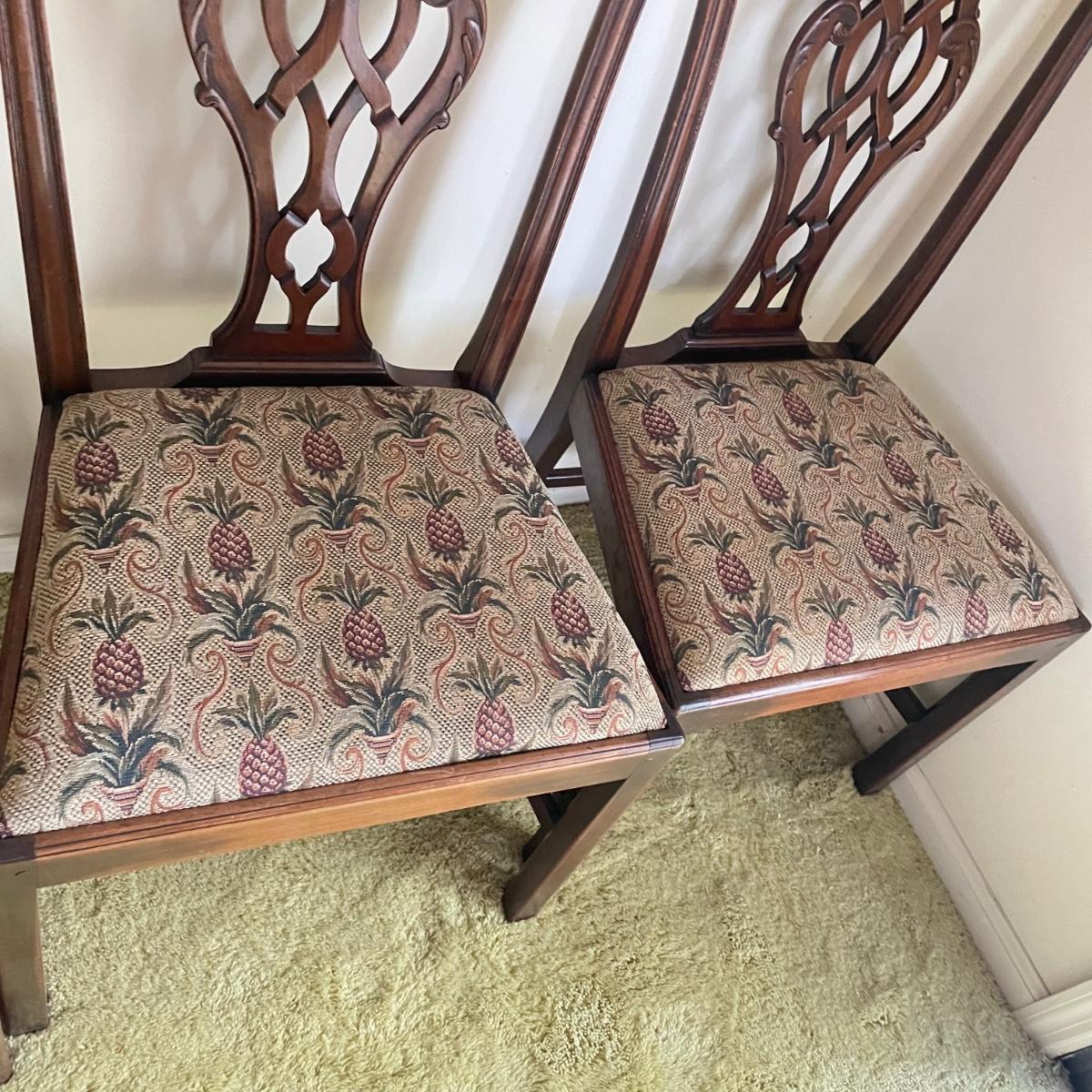 Six beautiful Chippendale reproduction chairs. Chairs have a nice finish and intricate carvings. They show some wear, but they are in great shape. The cushions are removed easily. Chairs measure 19” x 20” x 37.5” with a seat height at 18”. See images. Local pick up only.
