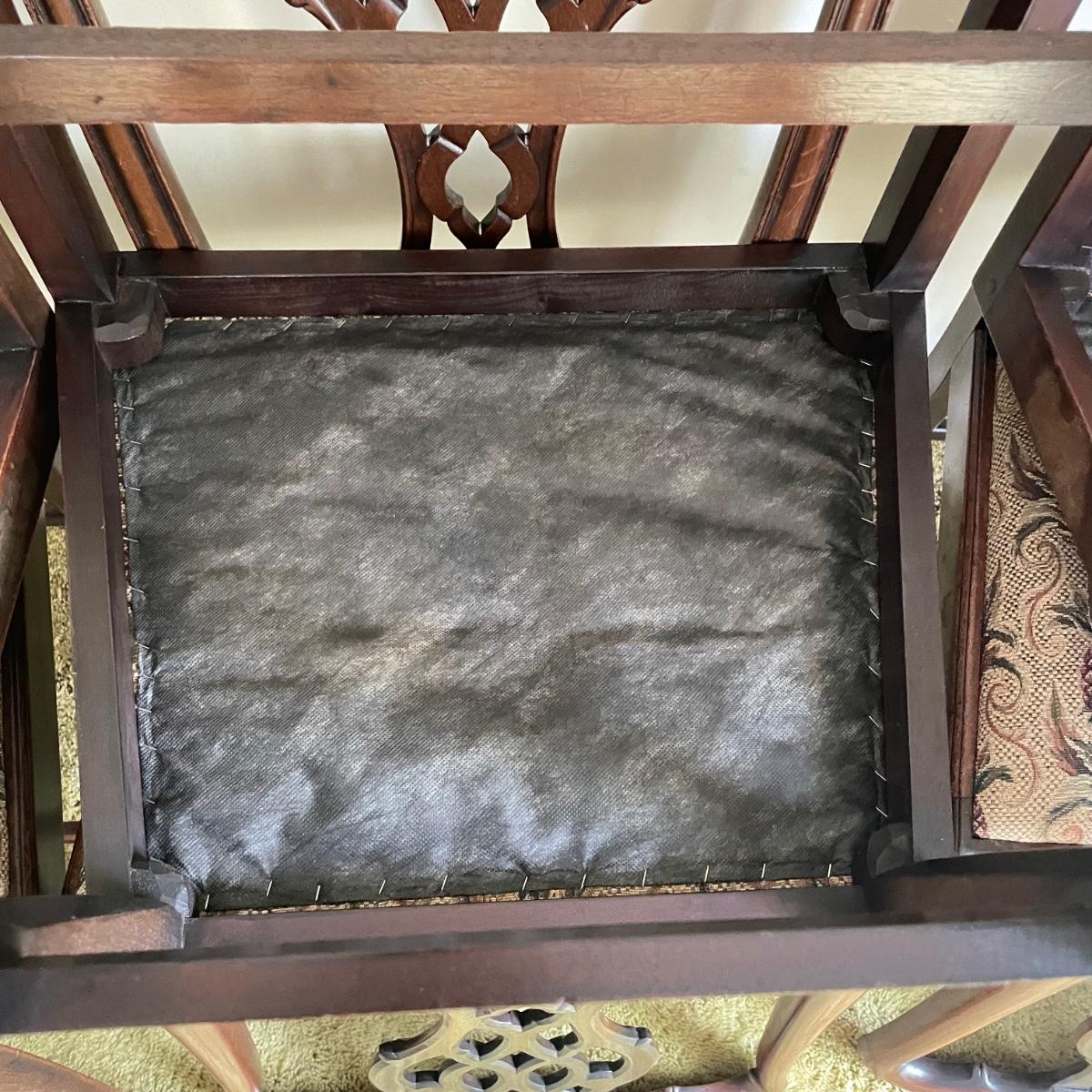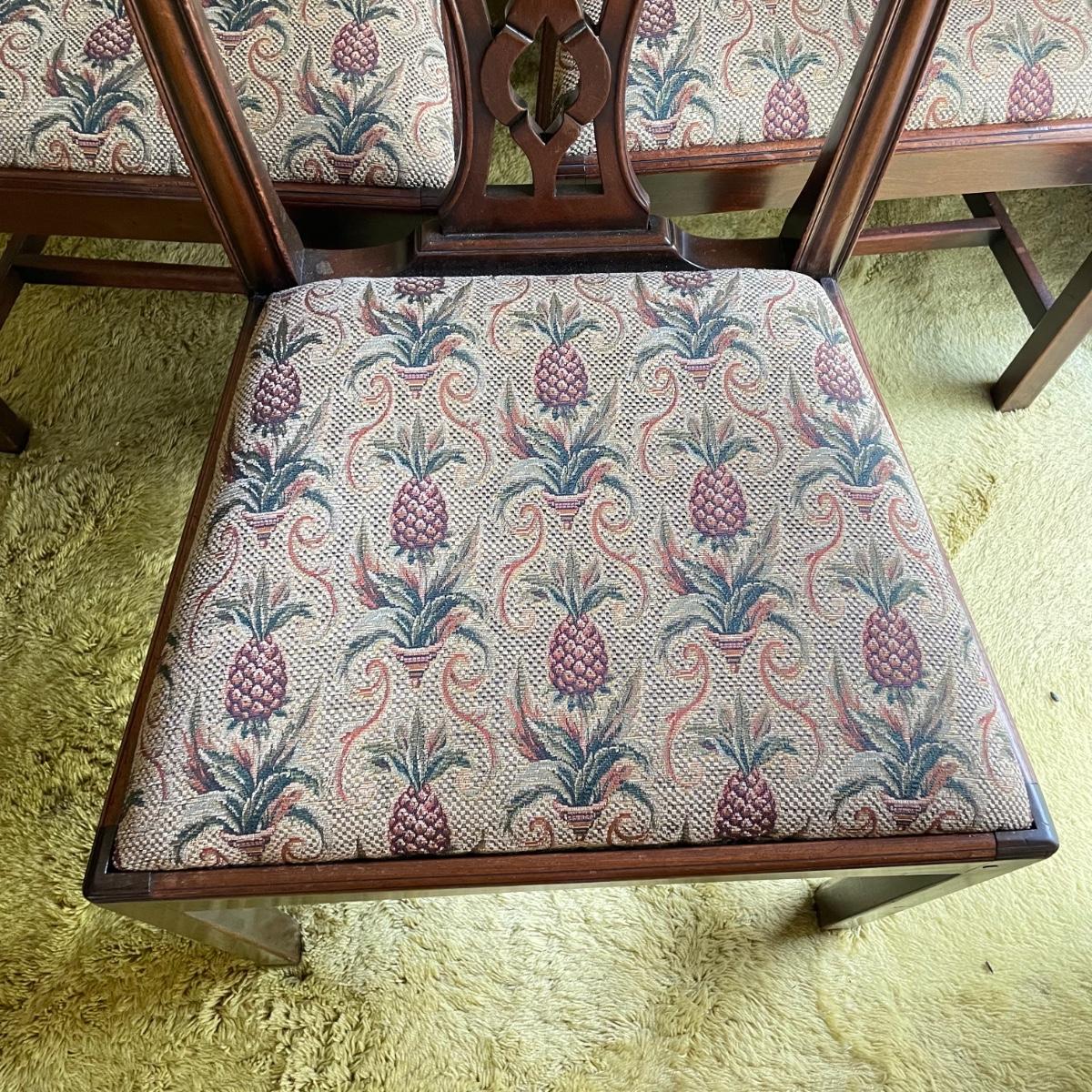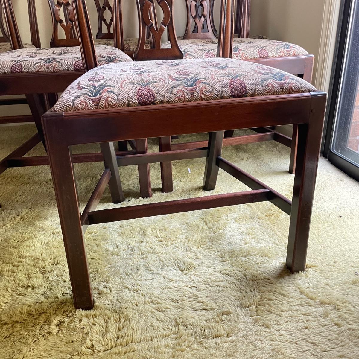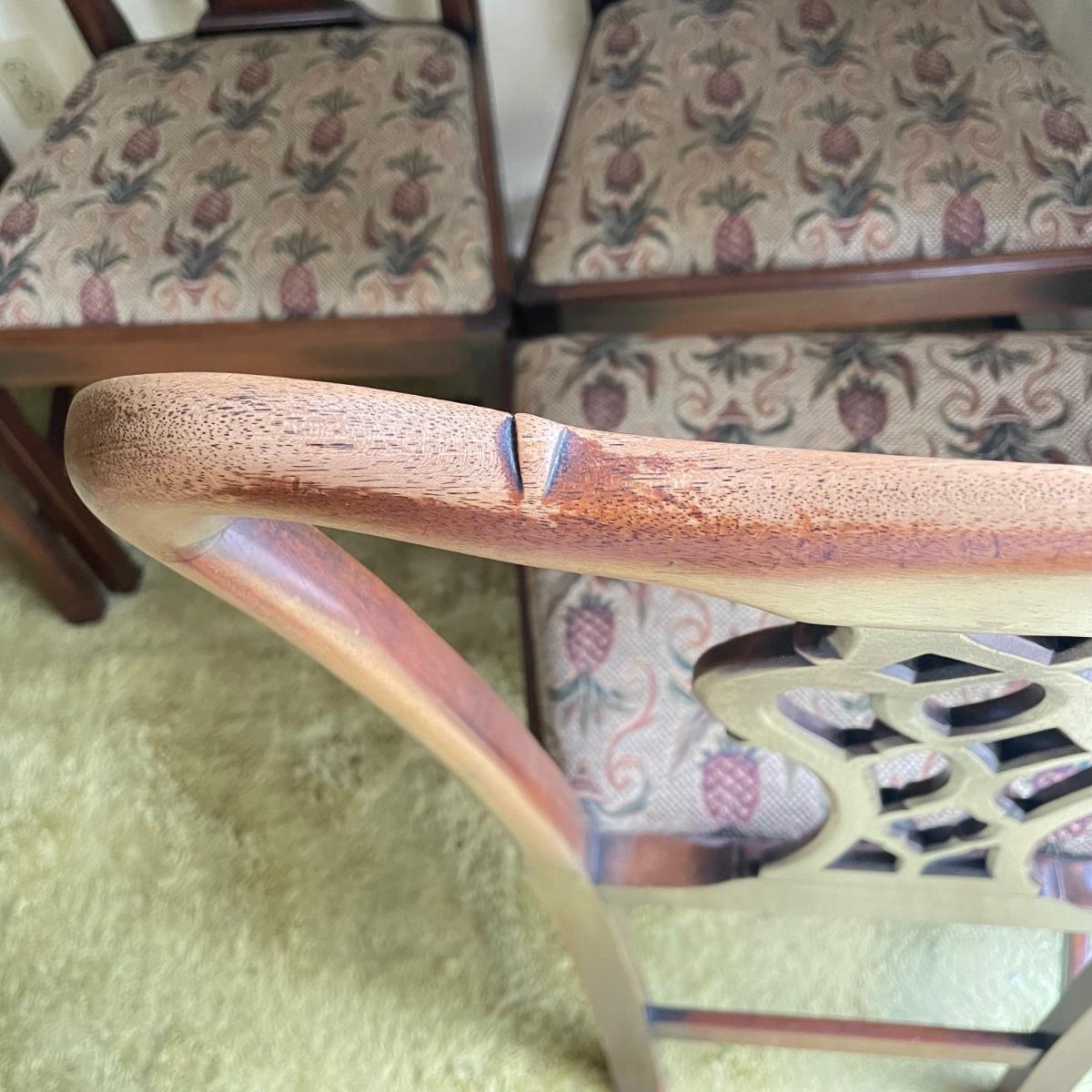 Six beautiful Chippendale reproduction chairs. Chairs have a nice finish and intricate carvings. They show some wear, but they are in great shape. The cushions are removed easily. Chairs measure 19” x 20” x 37.5” with a seat height at 18”. See images. Local pick up only.