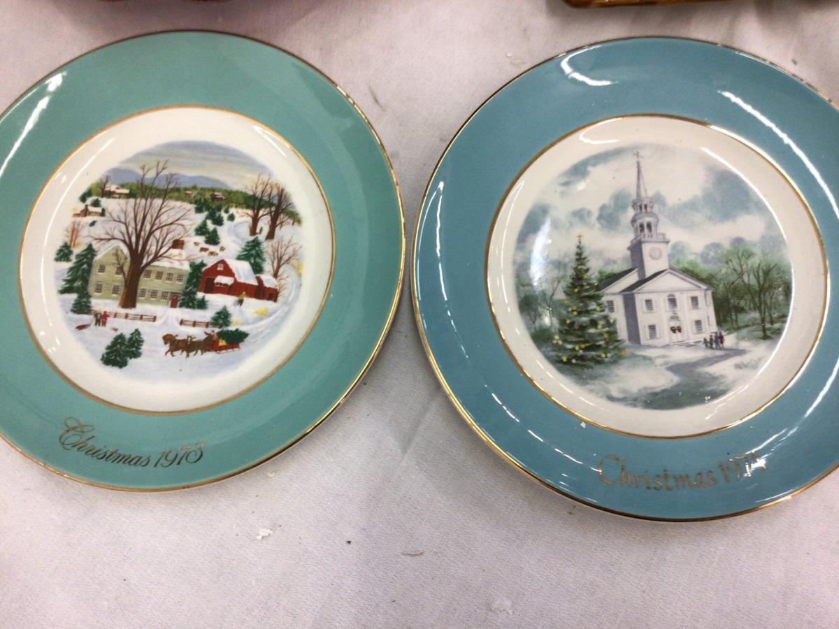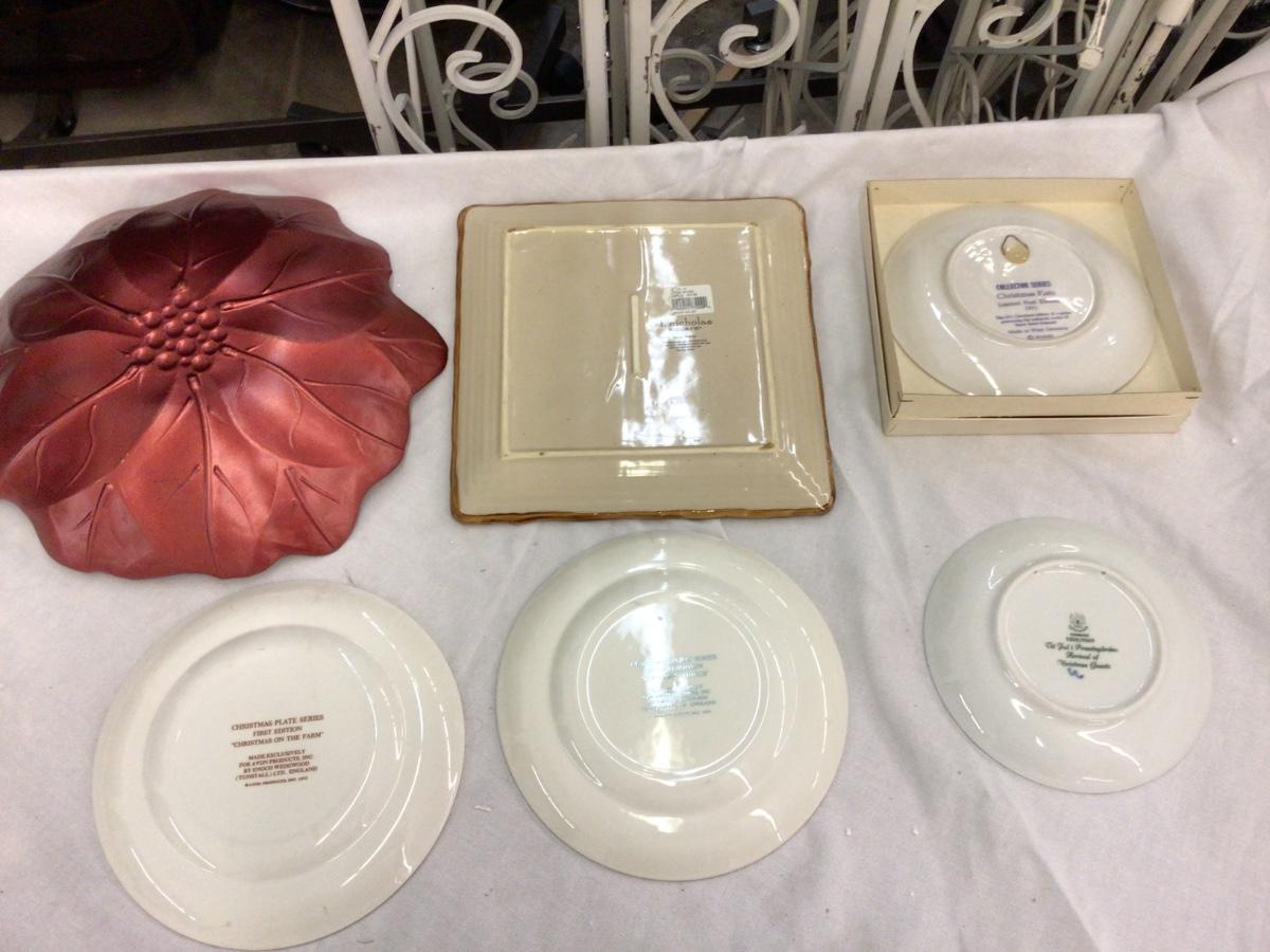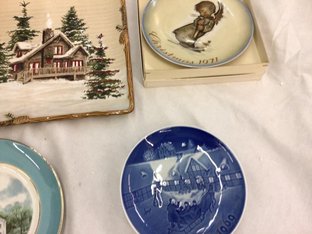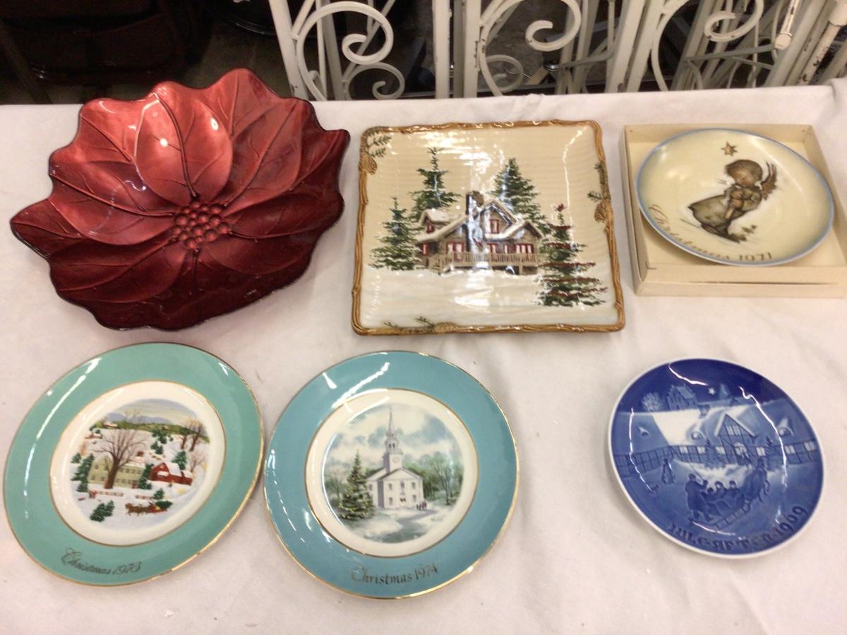 You get a poinsettiaplate, winter scene plate, Hummel Collectible plate Two Avon Christmas plates and a Denmark Christmas plate.