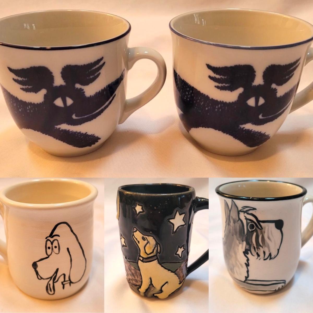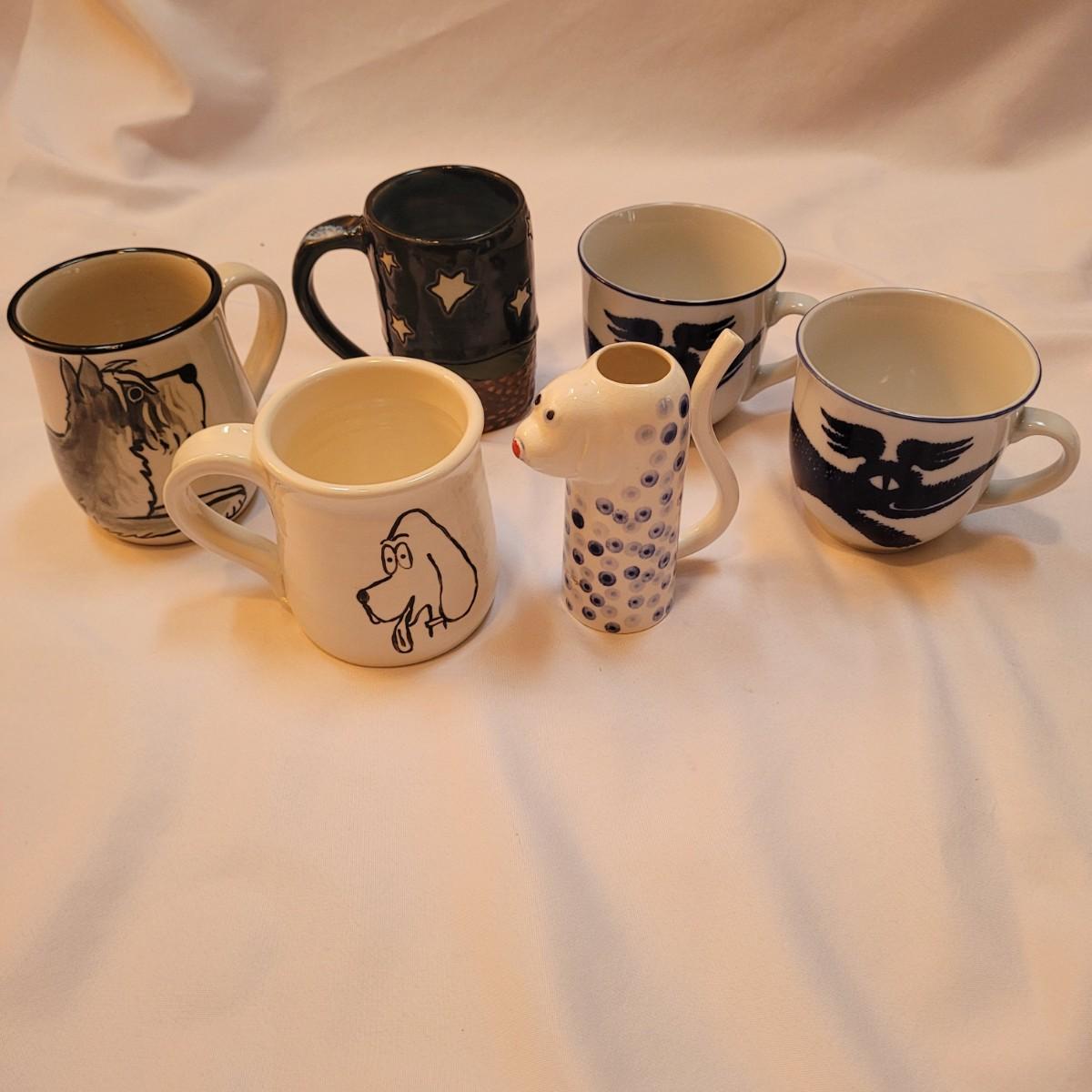 This lot includes six dog themed coffee mugs, two of which match and the rest are unique. None of the mugs appear to be damaged. Most have markings on the bottom indicating origin. All mugs are ceramic and porcelain. Perfect for a coffee or dog lover!