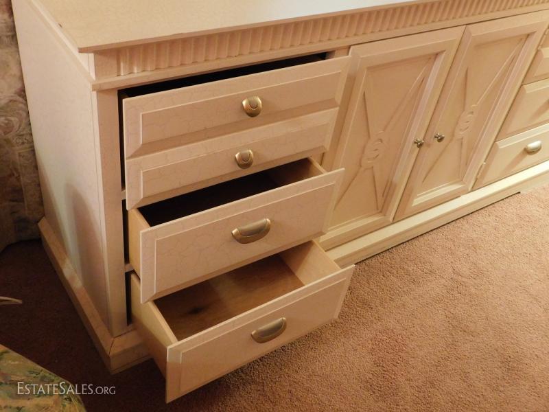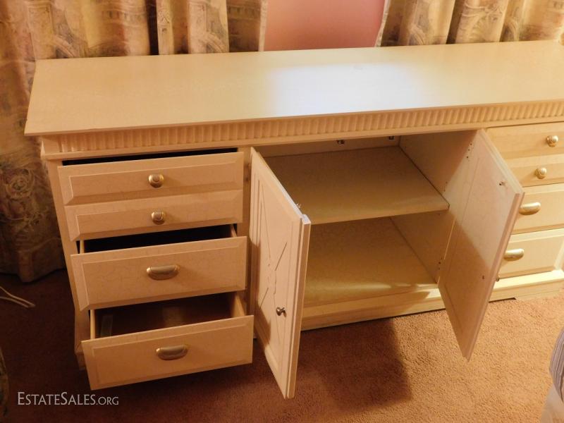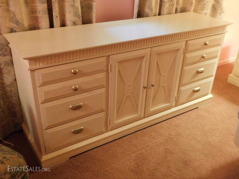 Nice, large six drawer dresser with double door front. Contemporary finish. In very good condition. One small ring spot on top as shown.