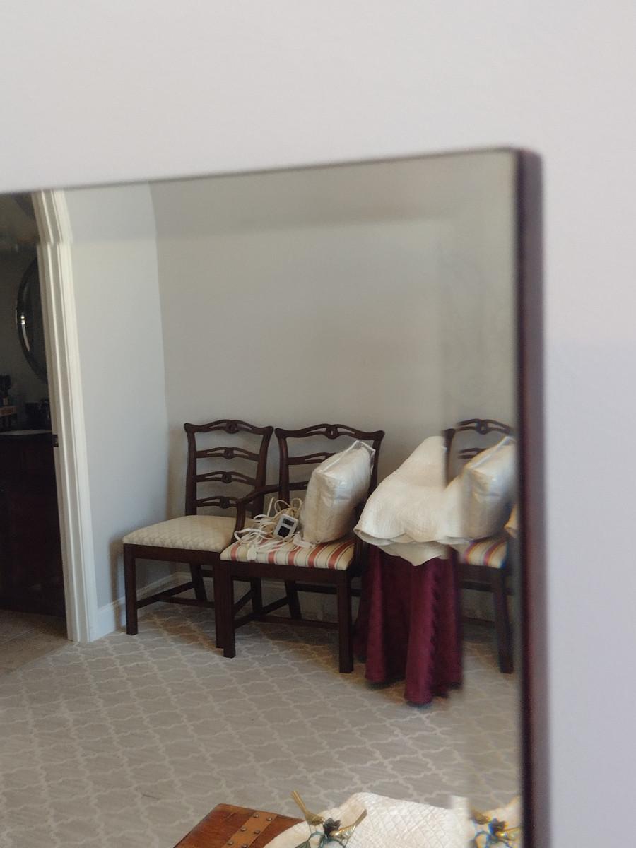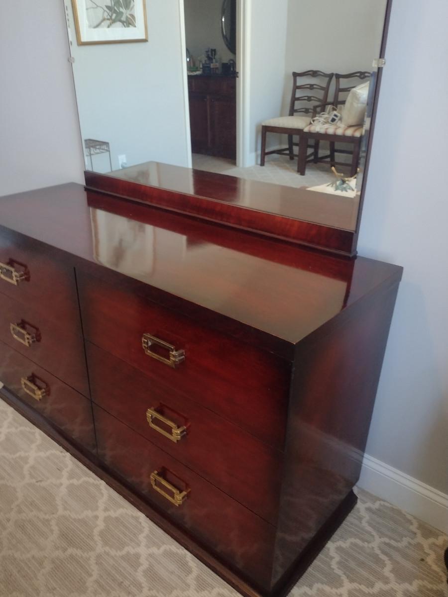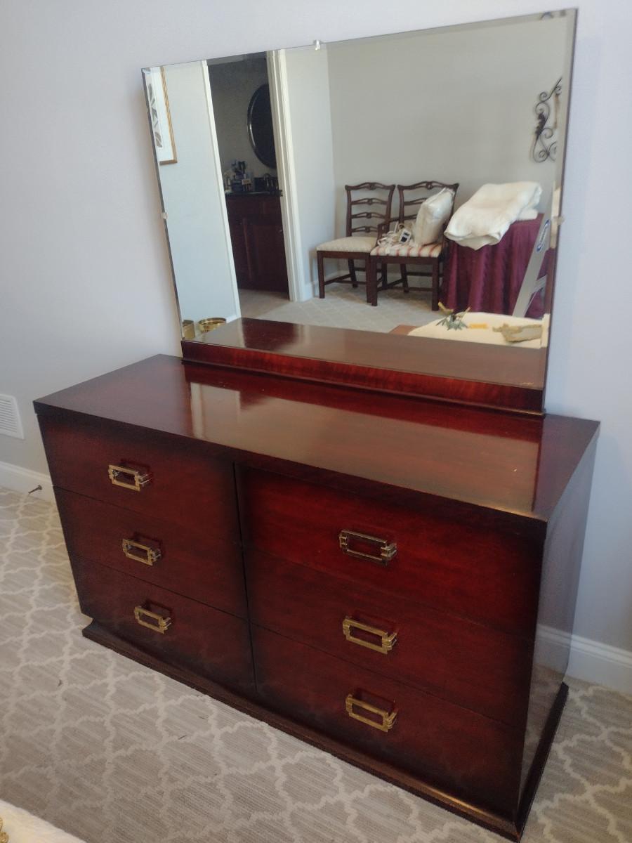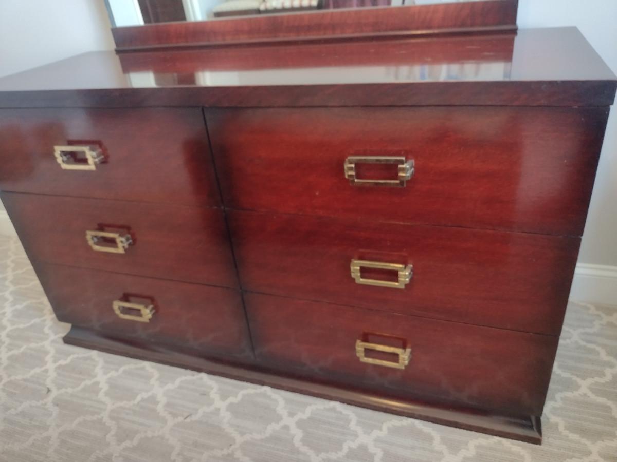 Six Drawer Dresser with Mirror- Approx 54 1/4" Long, 19" Deep, 32" Tall. Mirror is approx 44" x 32 1/2" tall. Please bring tools to remove mirror.