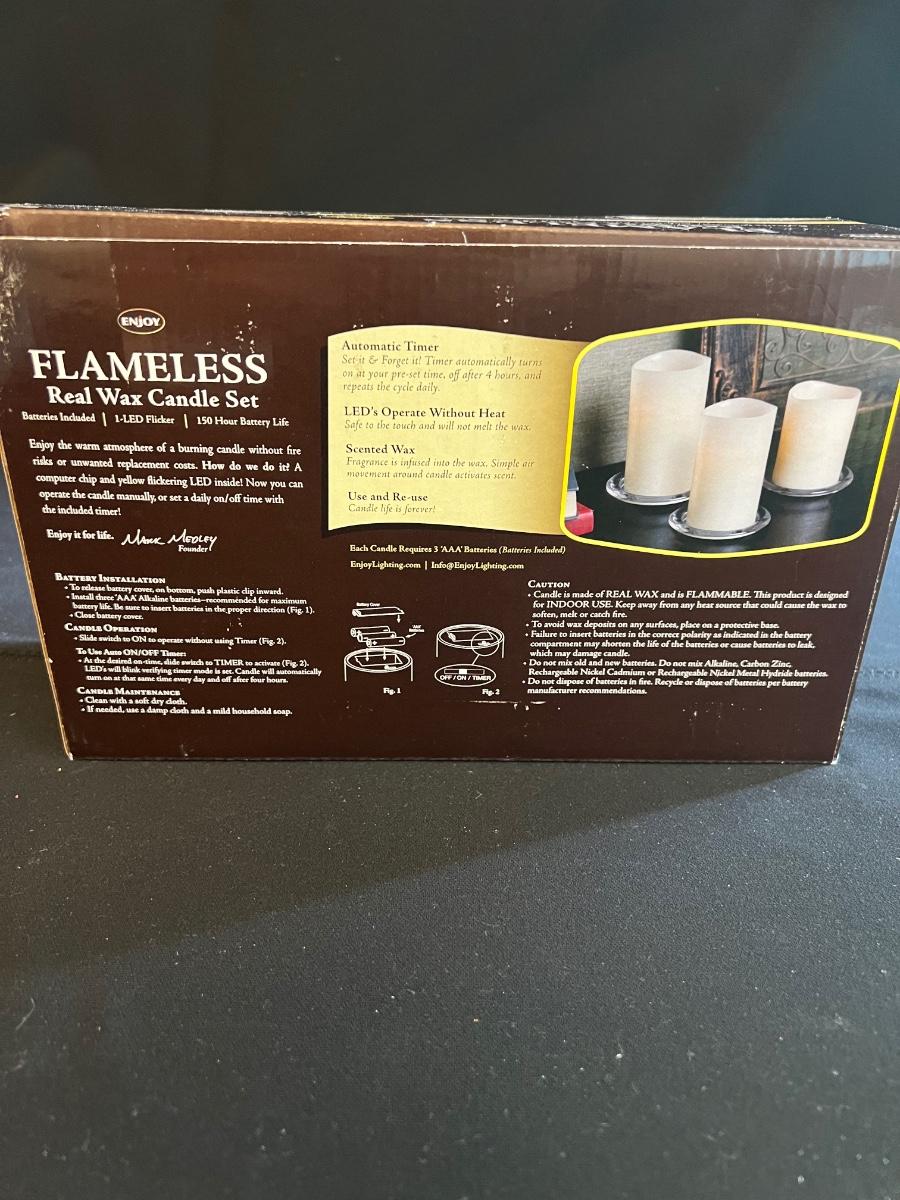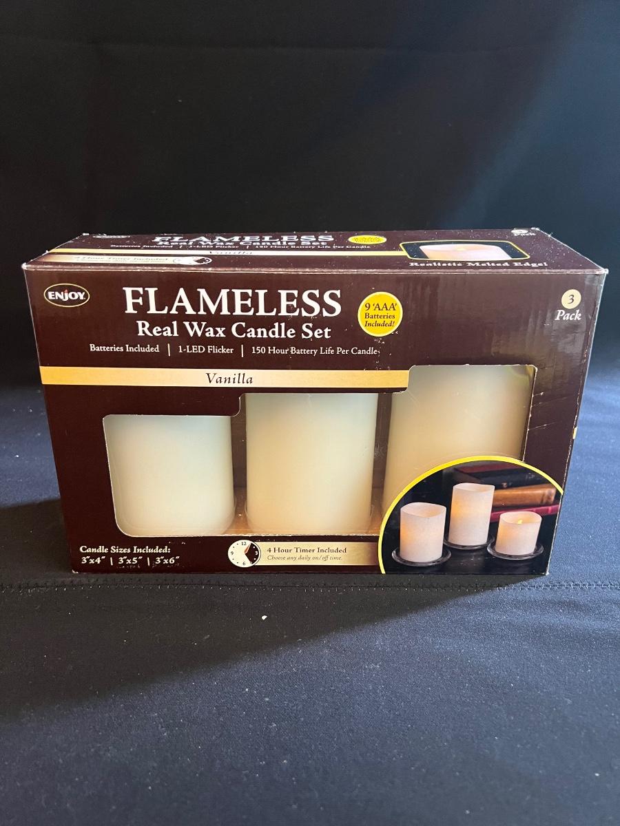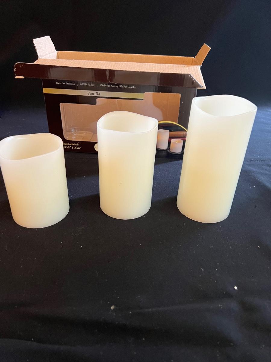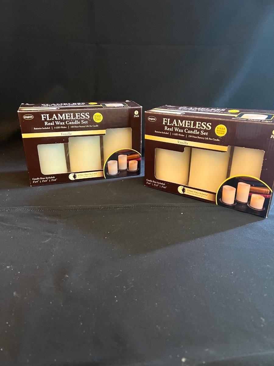 Two three-candle set boxes of ivory colored flameless candles. The smallest in each box measures 2.75”D x 4”H and the largest 2.75”D x 6”H.