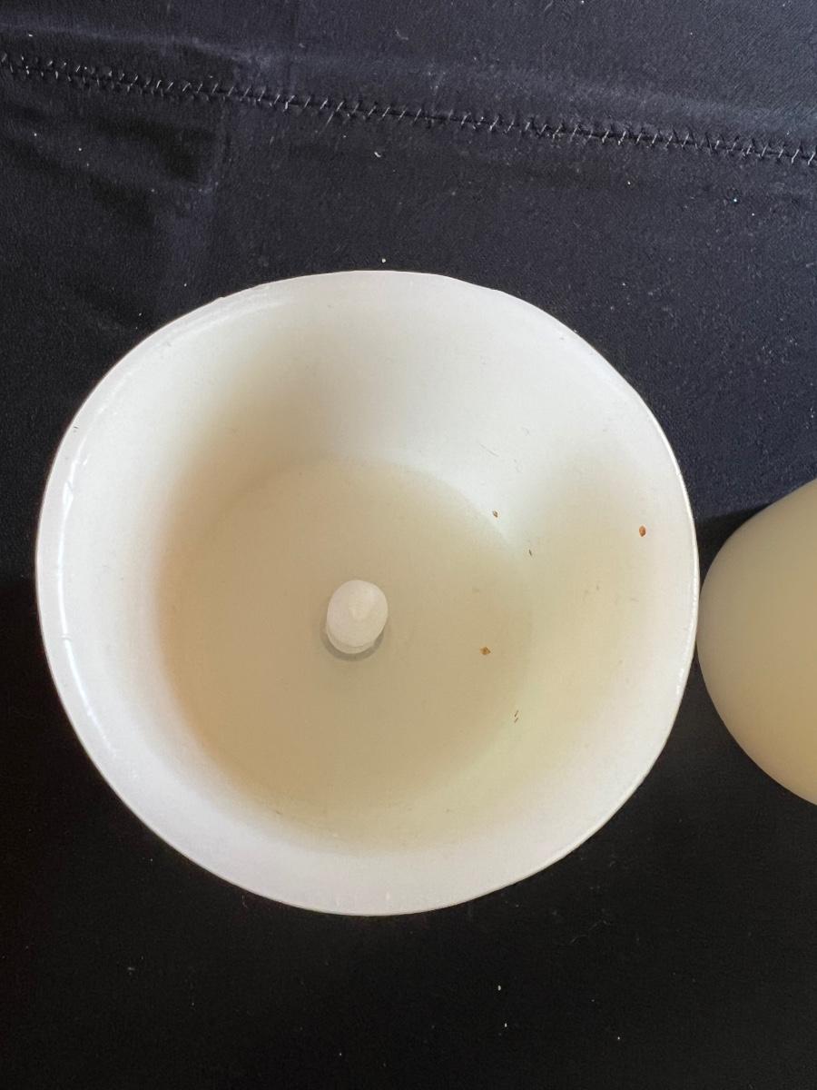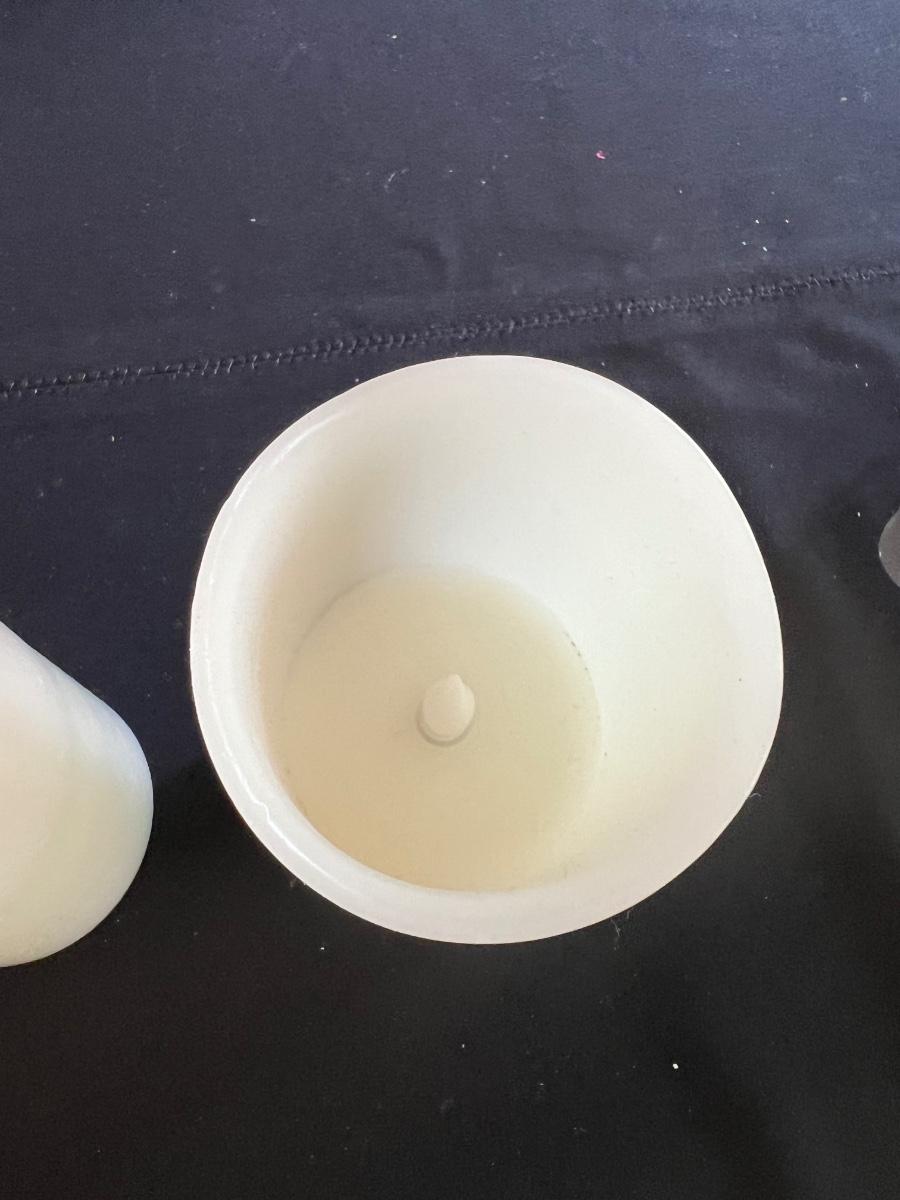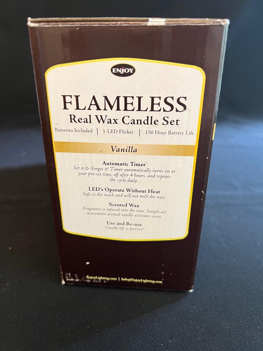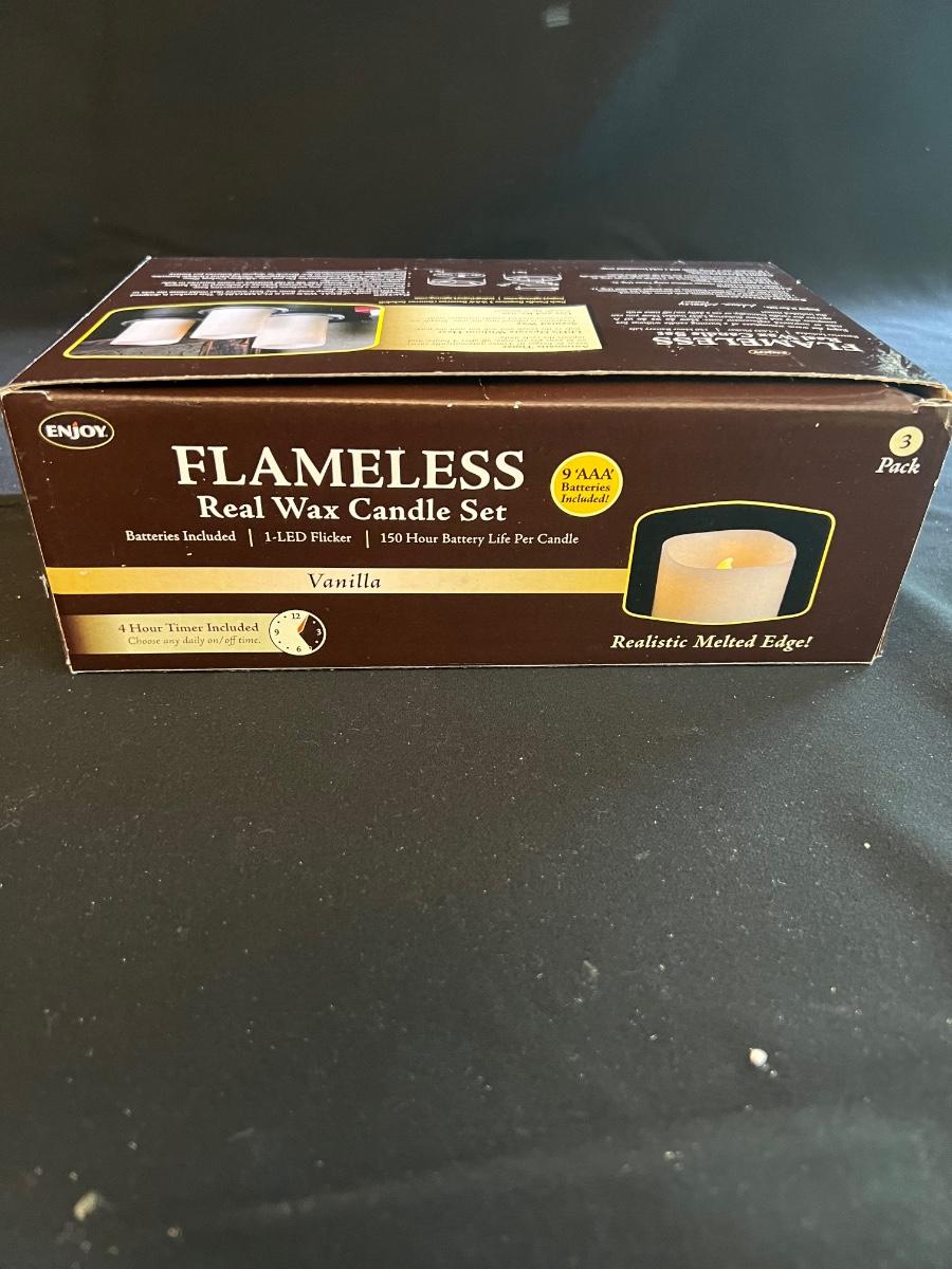 Two three-candle set boxes of ivory colored flameless candles. The smallest in each box measures 2.75”D x 4”H and the largest 2.75”D x 6”H.