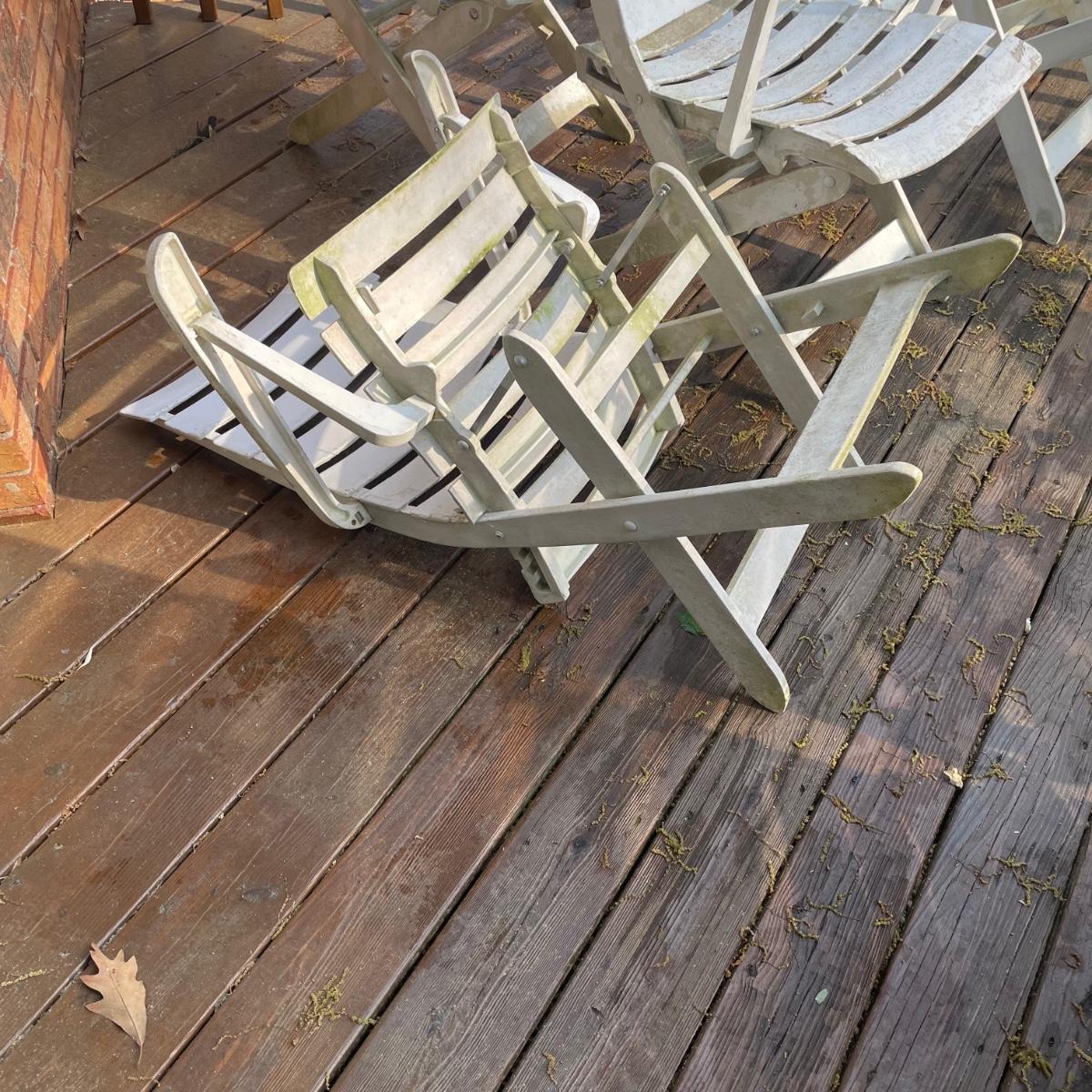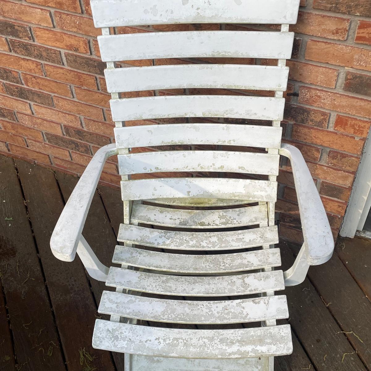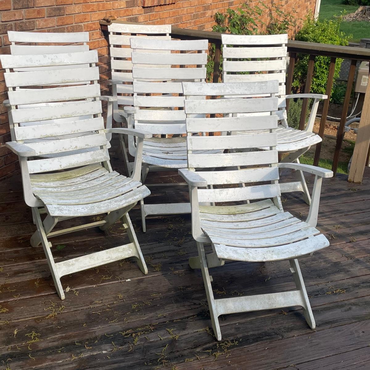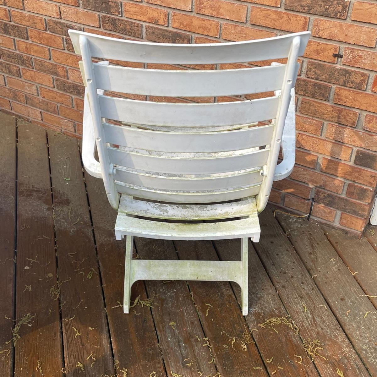 These six sturdy patio chairs are composite and measure 24” x 24” x 35” with 15” seat height. They have multiple height settings that can take them from very low 9” to 15”. They were made in France by Grosfillex. The plastic was painted white at one time and they could do with being repainted. Two of the six fold down, the others will only partially fold, see images.