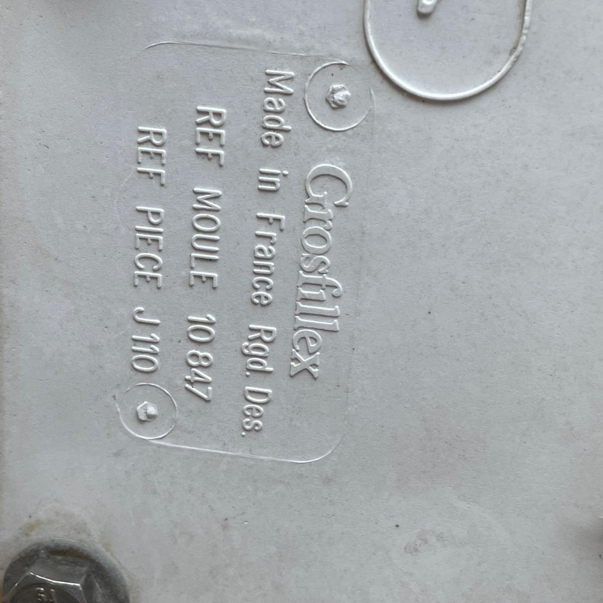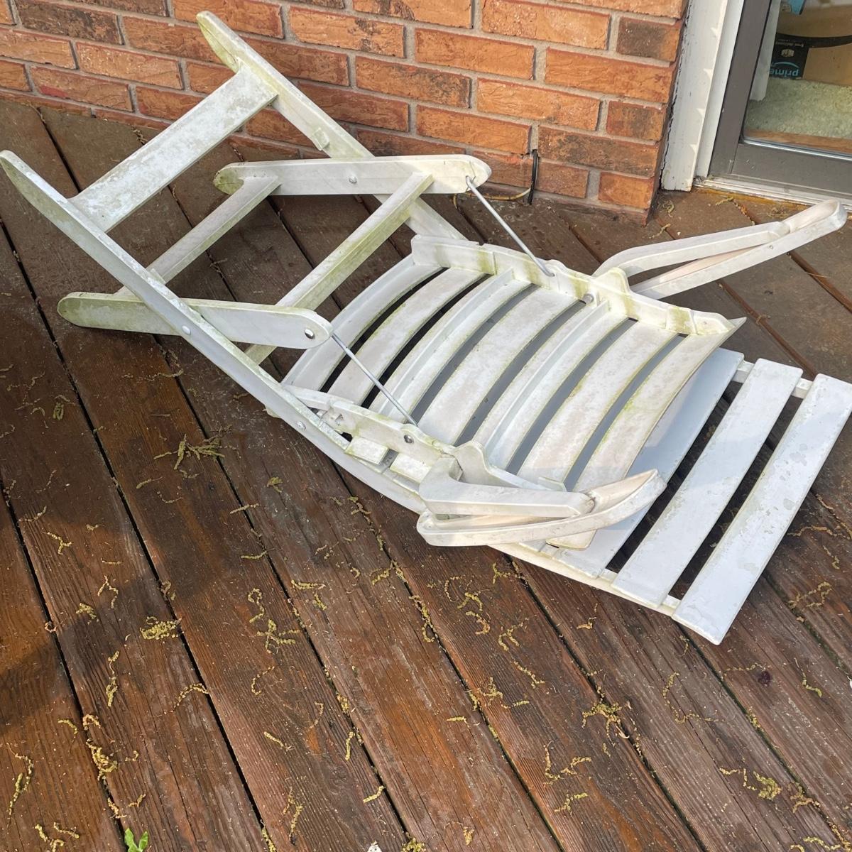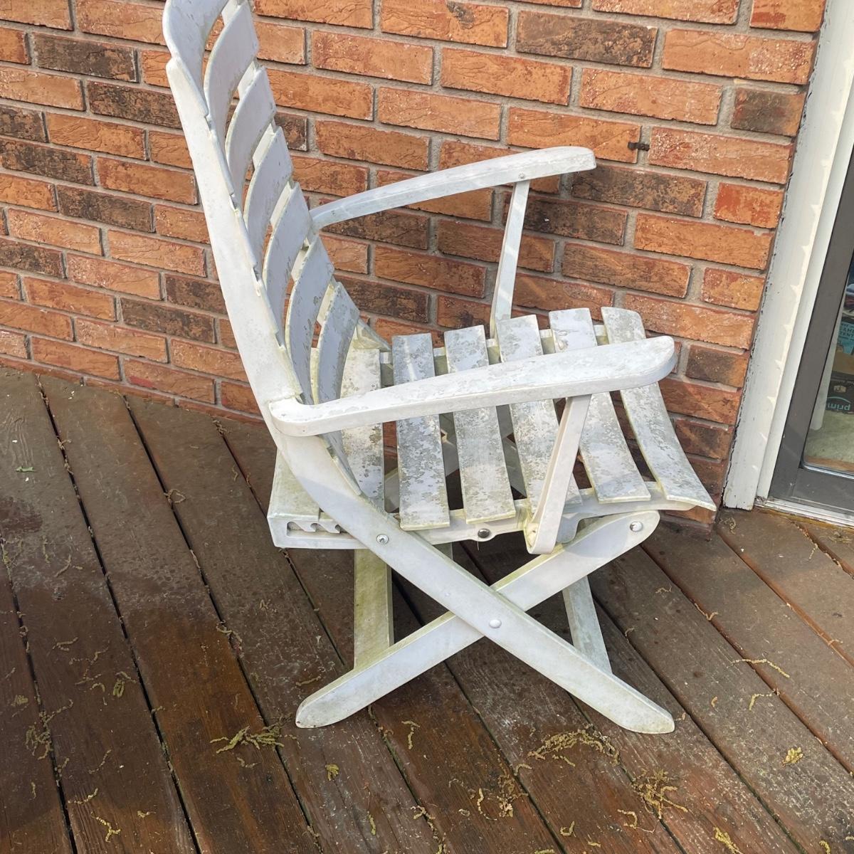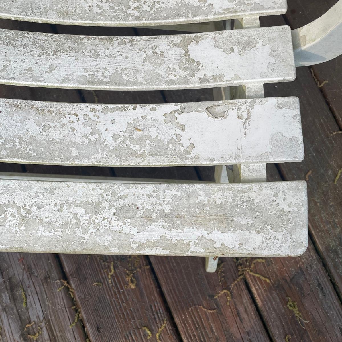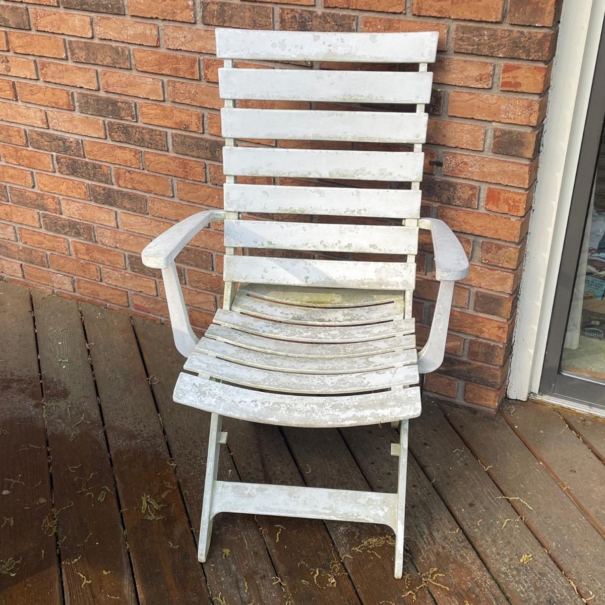These six sturdy patio chairs are composite and measure 24” x 24” x 35” with 15” seat height. They have multiple height settings that can take them from very low 9” to 15”. They were made in France by Grosfillex. The plastic was painted white at one time and they could do with being repainted. Two of the six fold down, the others will only partially fold, see images.