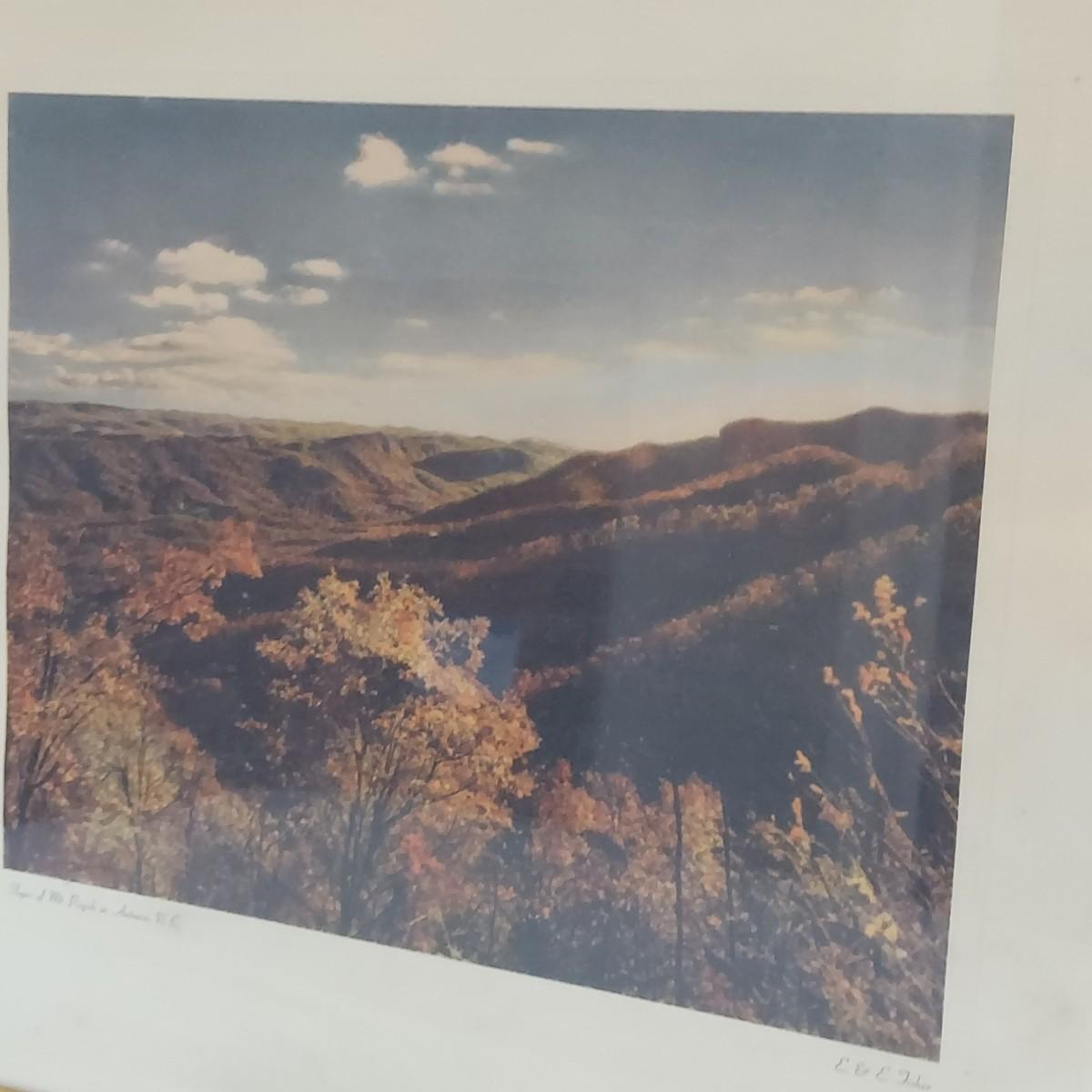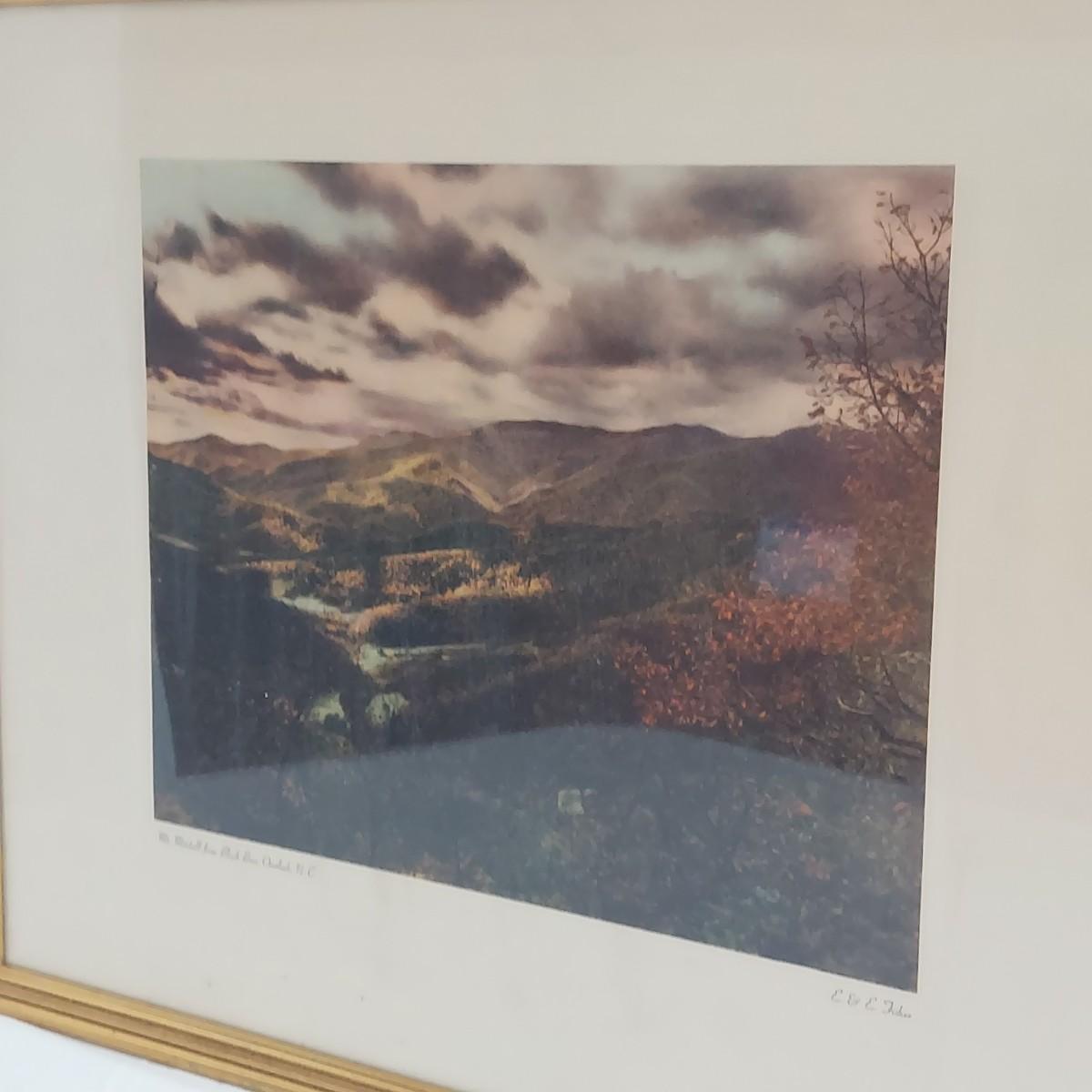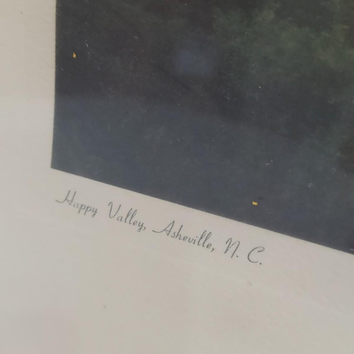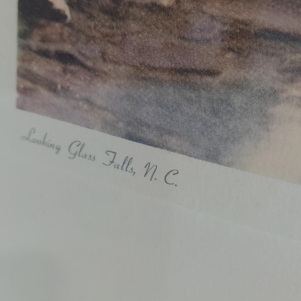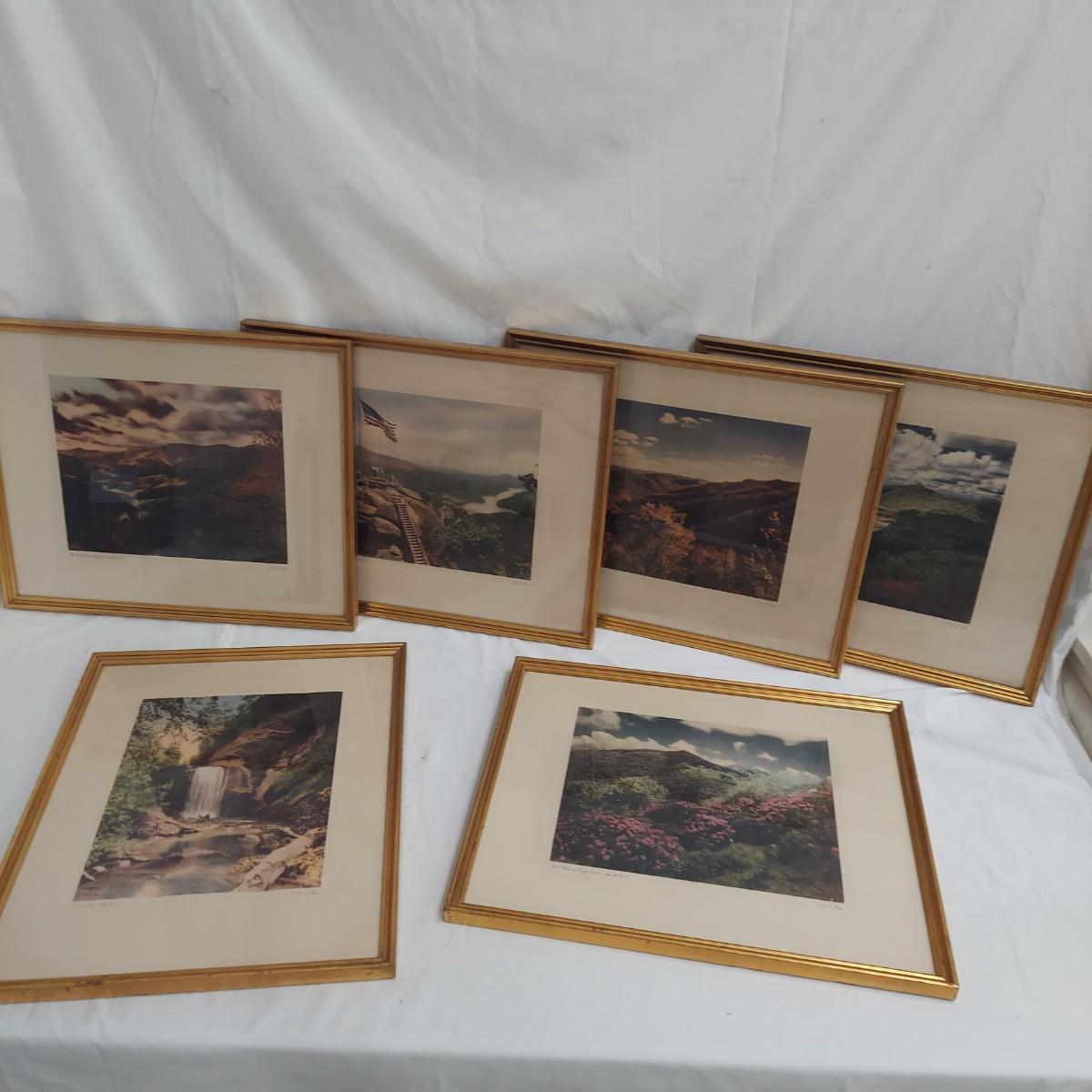 Lot includes six framed prints of different areas of Western North Carolina. Frames measure 16” x 13"H and prints are under glass. Prints include Craggy Gardens, Looking Glass Falls, Mt. Mitchell, Chimney Rock and Lake Lure, Mt. Pisgah and Happy Valley. Some condition issues. Please see photos for details. Shipping available. Shipping can be costly. We suggest contacting our preferred local shipping provider, Postage Express, with dimensions and getting an estimate before bidding: 828-255-9250 or shipping@postageexpressnc.com