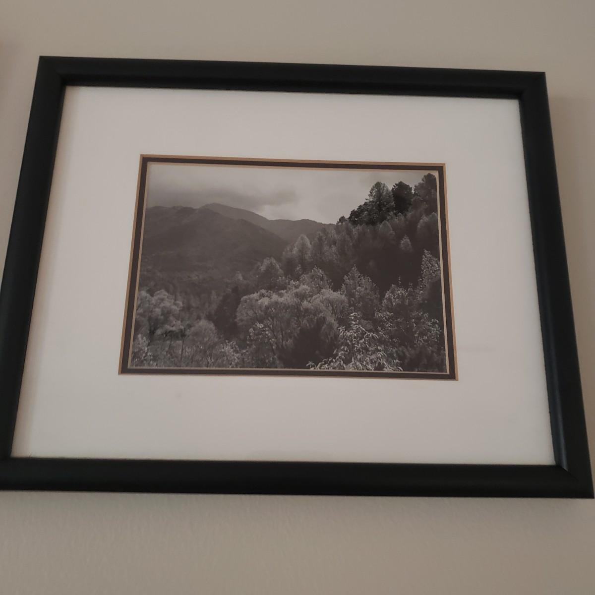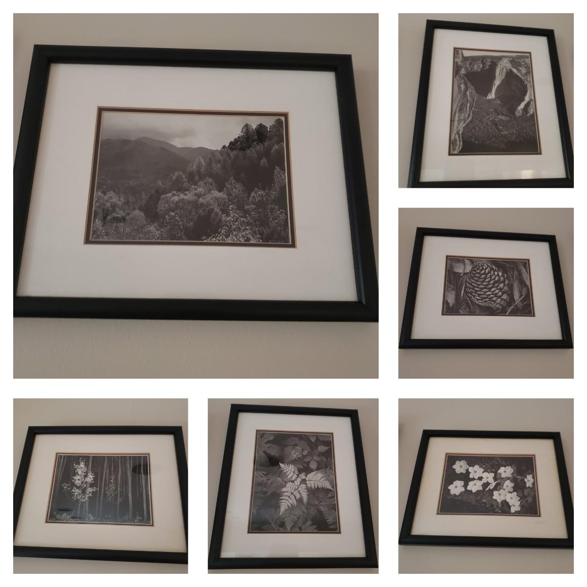 This six-piece lot contains black and white photographs of nature landscapes. The wooden black frames are double matted and behind glass. There are four frames the same size and two others the same. The smaller frame measures 9" x 10.5".