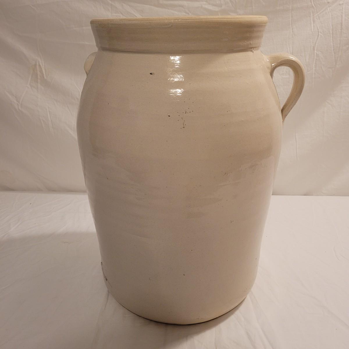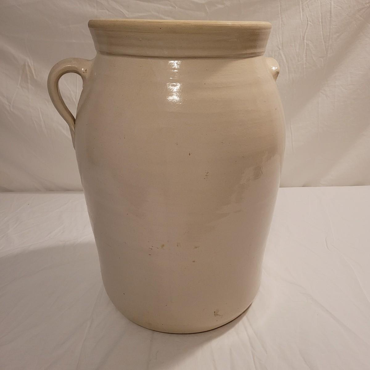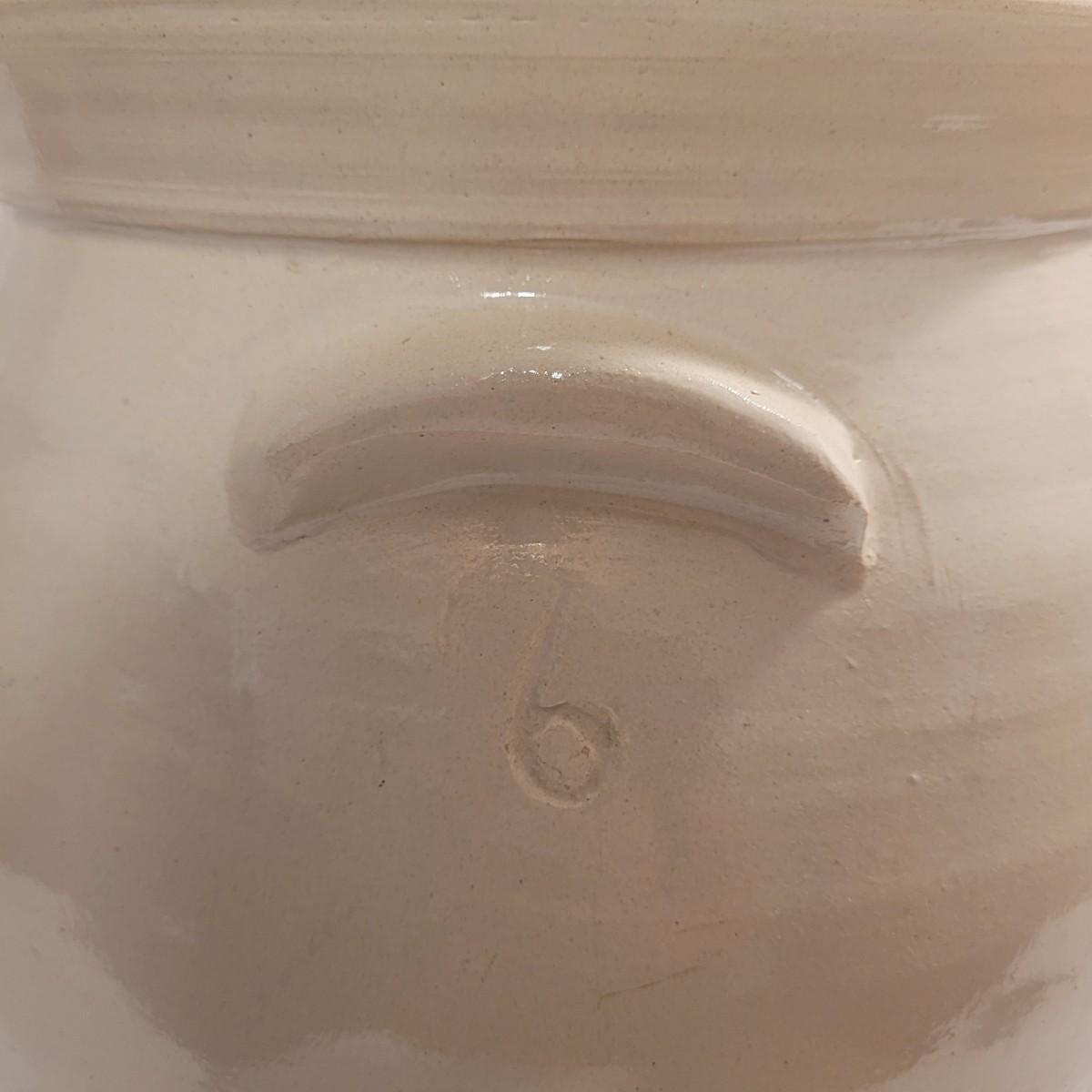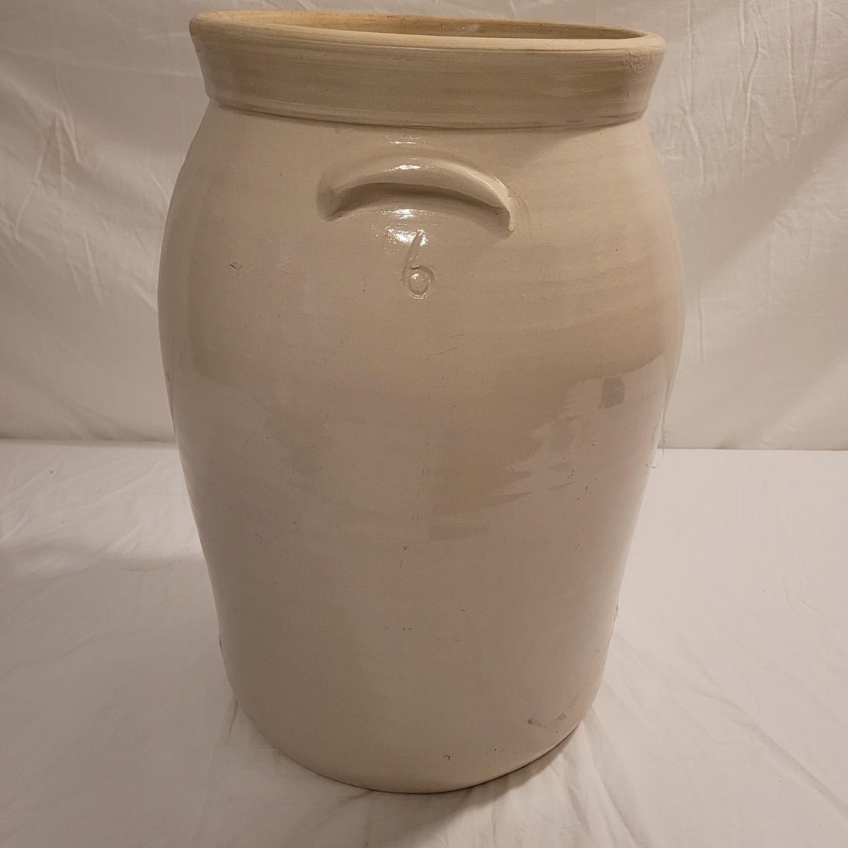 This large six gallon stoneware crock is vintage and potentially antique. Crock is a natural stoneware color with shiny glaze. It appears to be a butter churning crock with full handle on one side and a smaller handle. Does not have other wooden churning pieces. The number six is carved in the side seemingly indicating its size in gallons. The piece measures 13" x 13" x 18"H. There are no signatures or makers marks to be seen. Lid is not included.