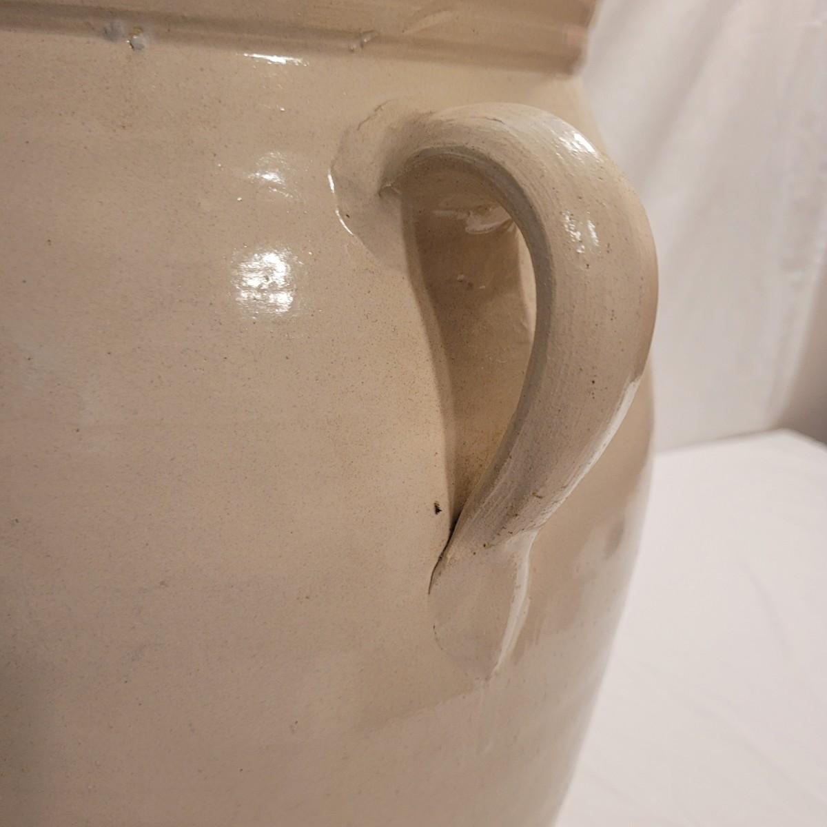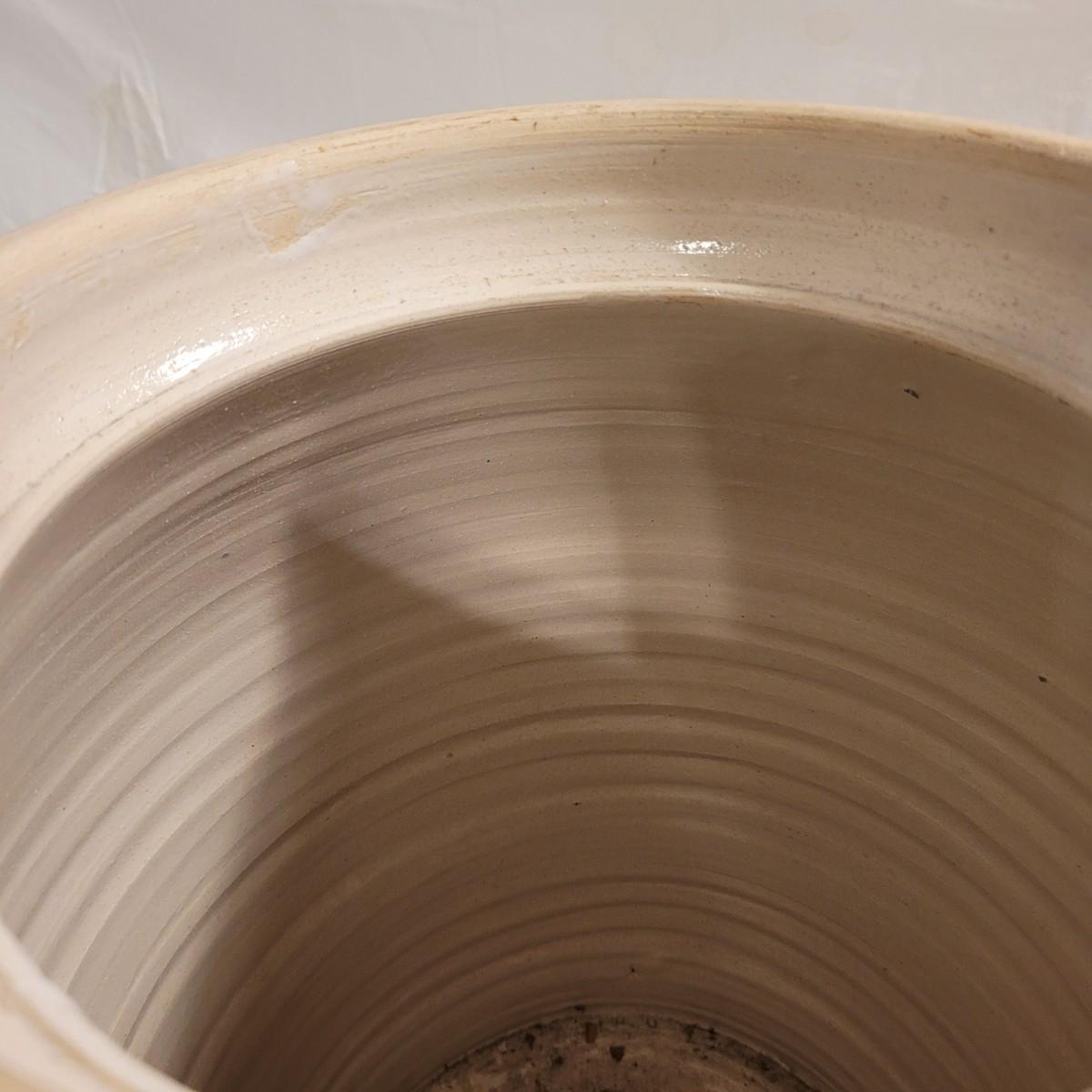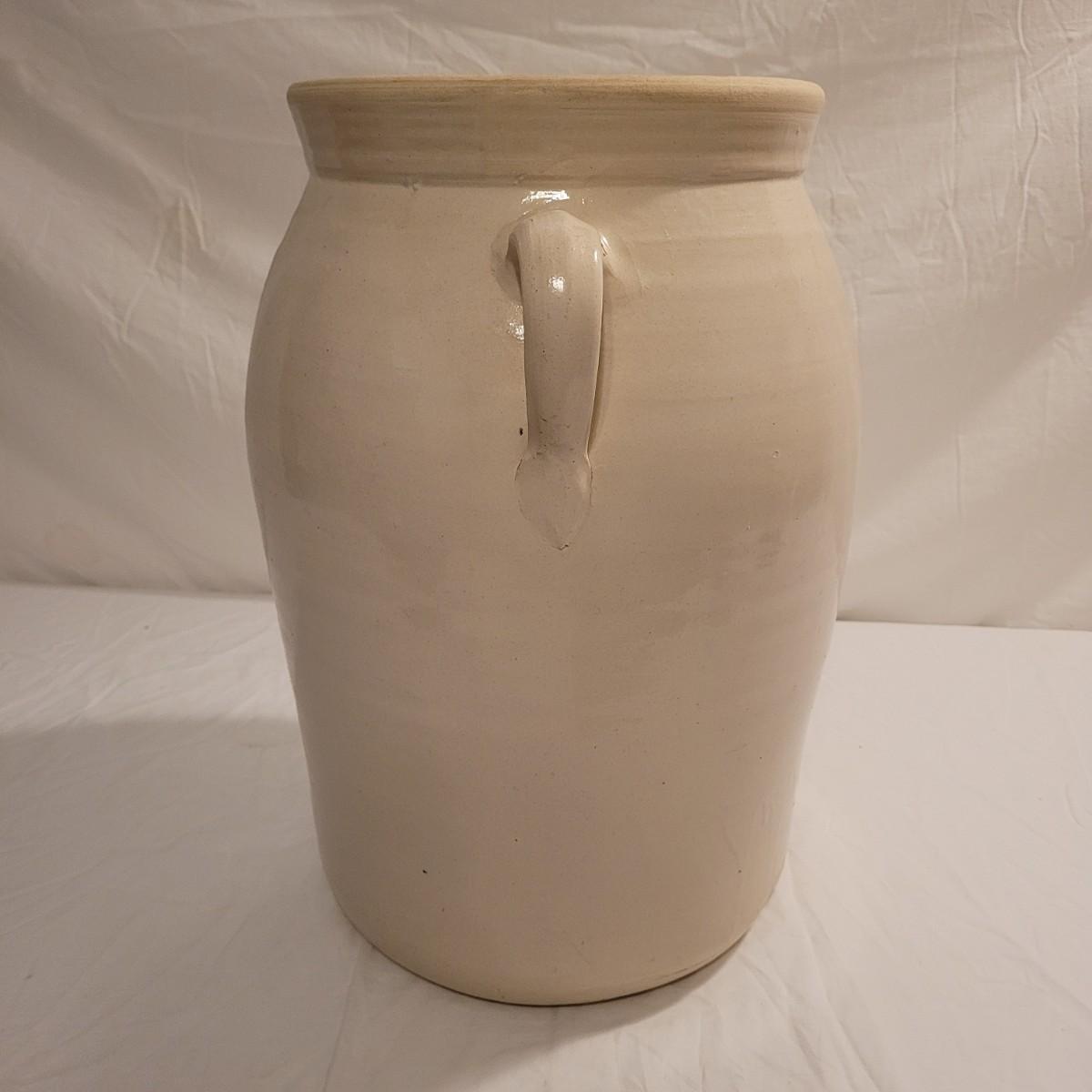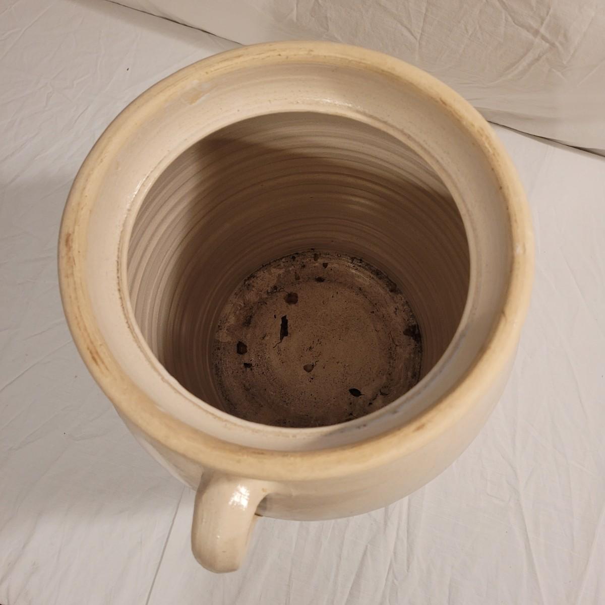 This large six gallon stoneware crock is vintage and potentially antique. Crock is a natural stoneware color with shiny glaze. It appears to be a butter churning crock with full handle on one side and a smaller handle. Does not have other wooden churning pieces. The number six is carved in the side seemingly indicating its size in gallons. The piece measures 13" x 13" x 18"H. There are no signatures or makers marks to be seen. Lid is not included.