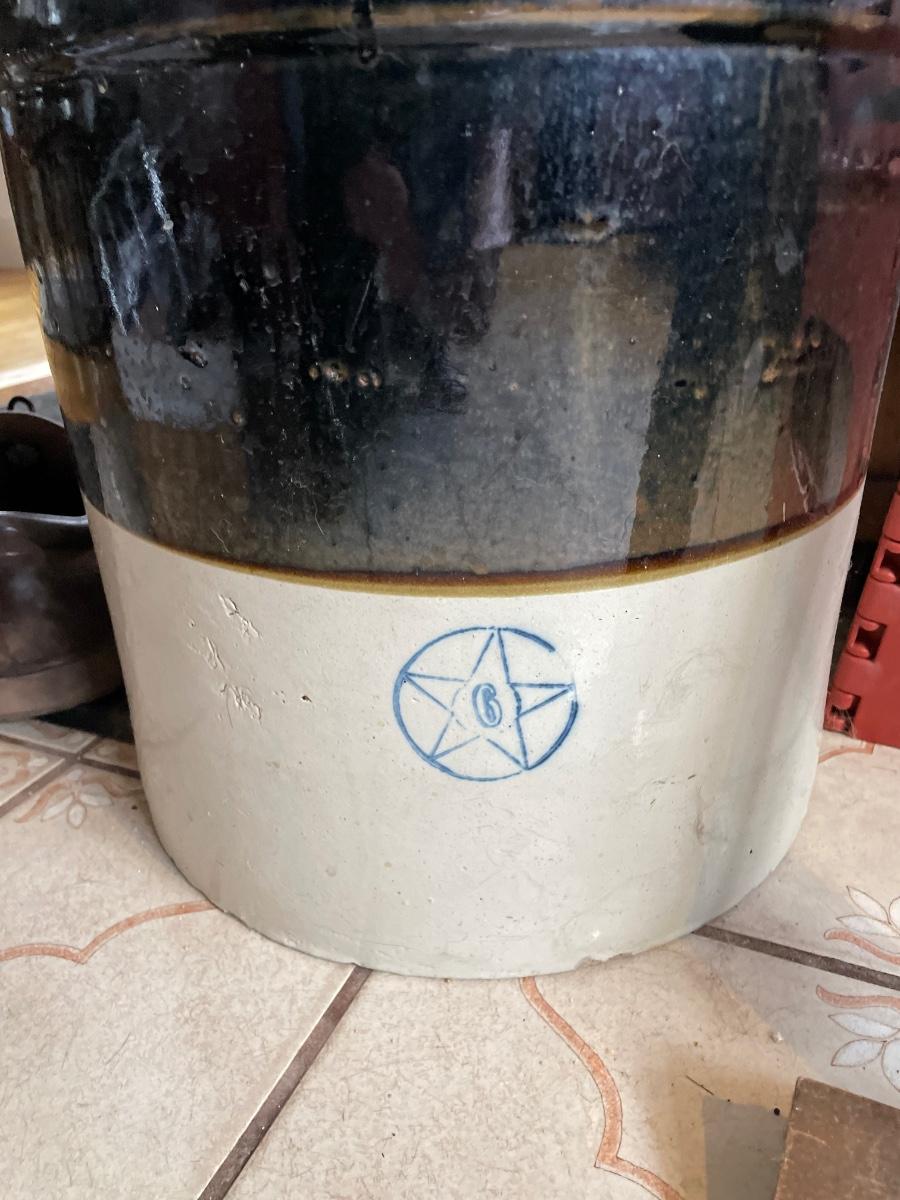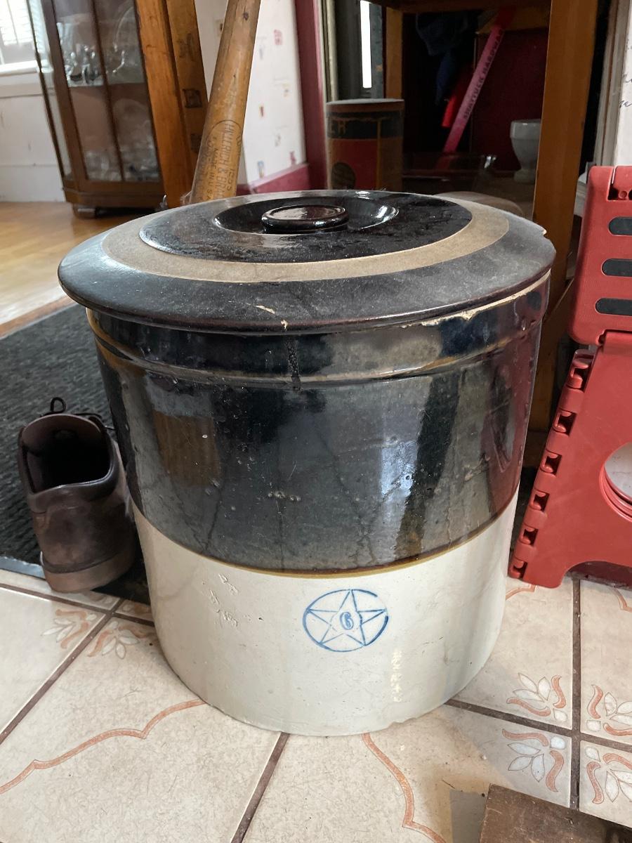 Six gallon crock with star. Lid has large chip and crack which may have been repaired.