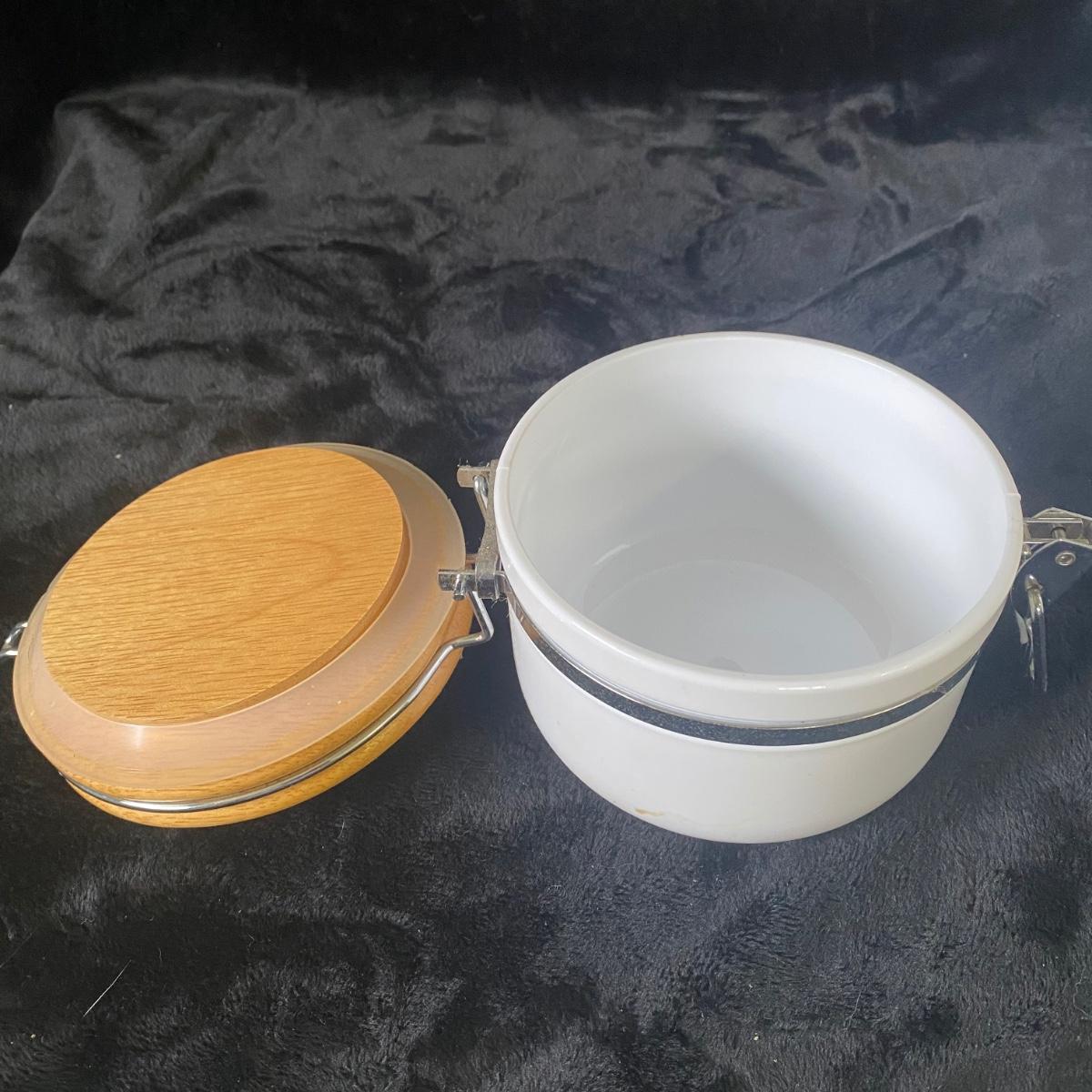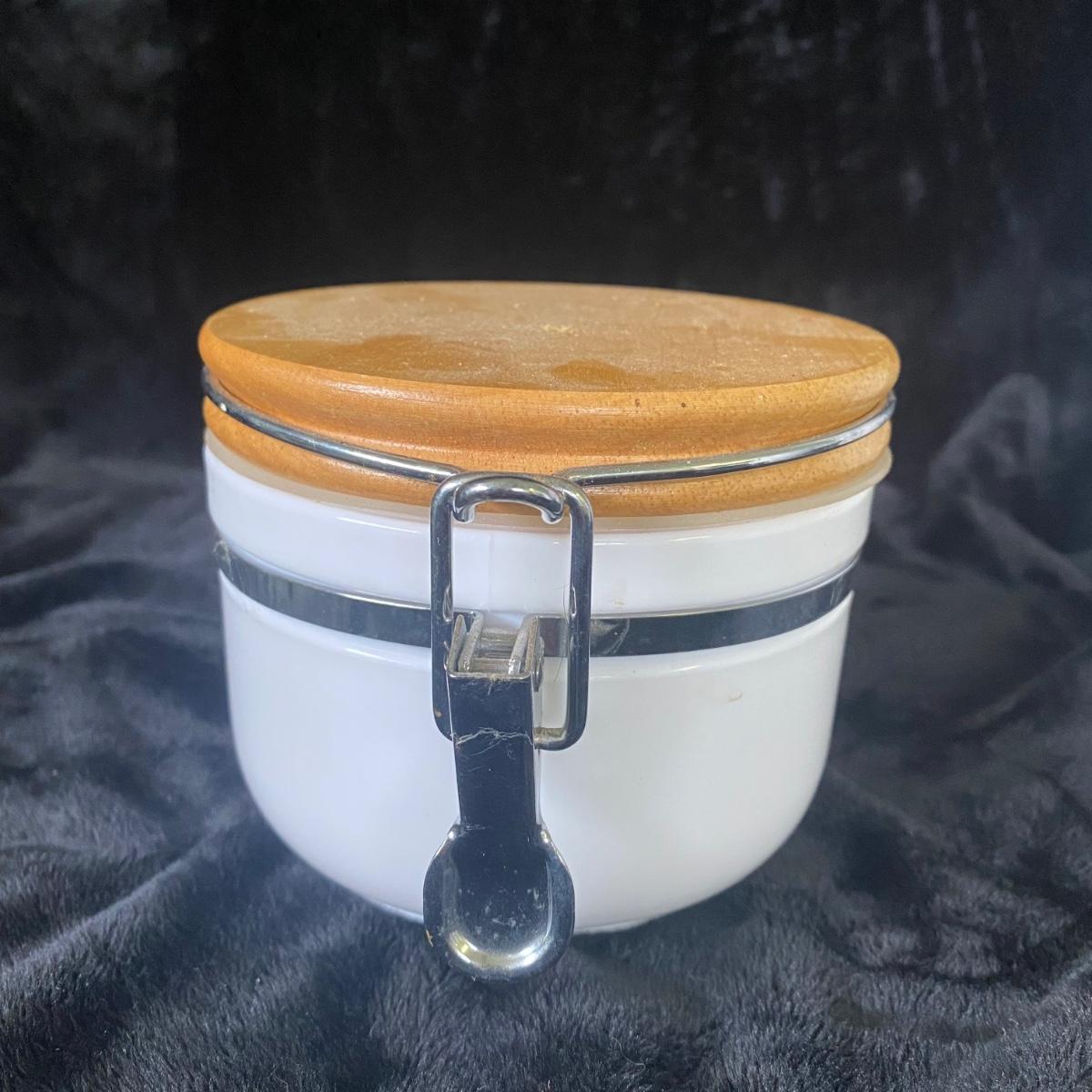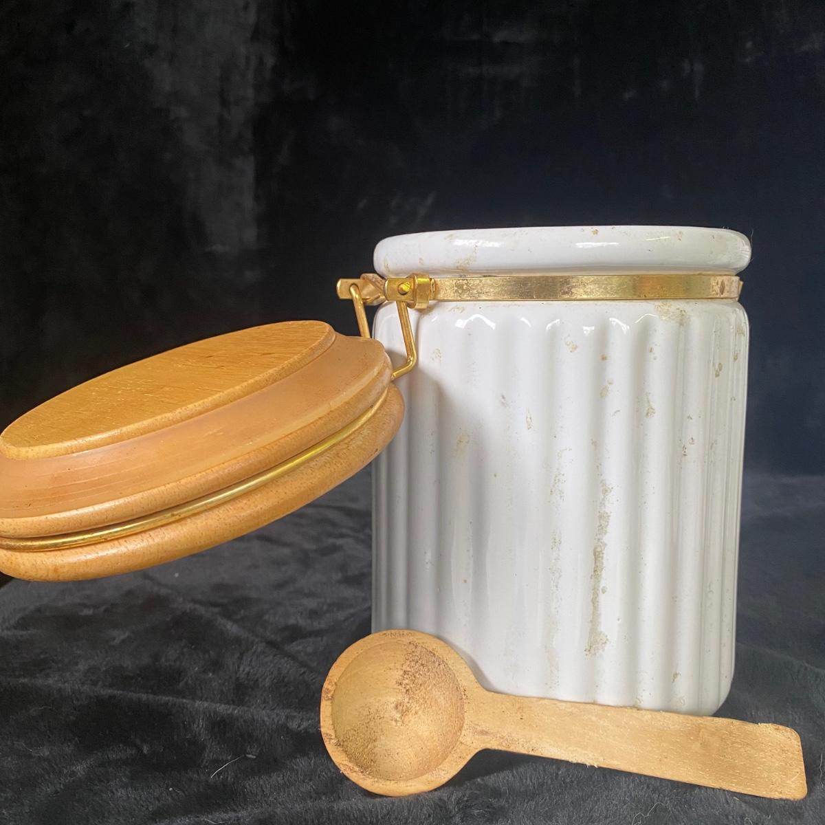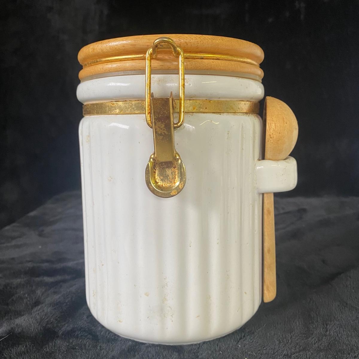 One large wood and glass container with wooden spoon and gold hardware. Measures 5” x 7.5” with a depth of 6”.