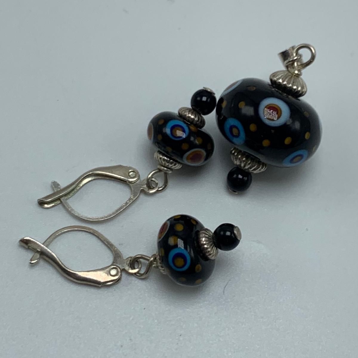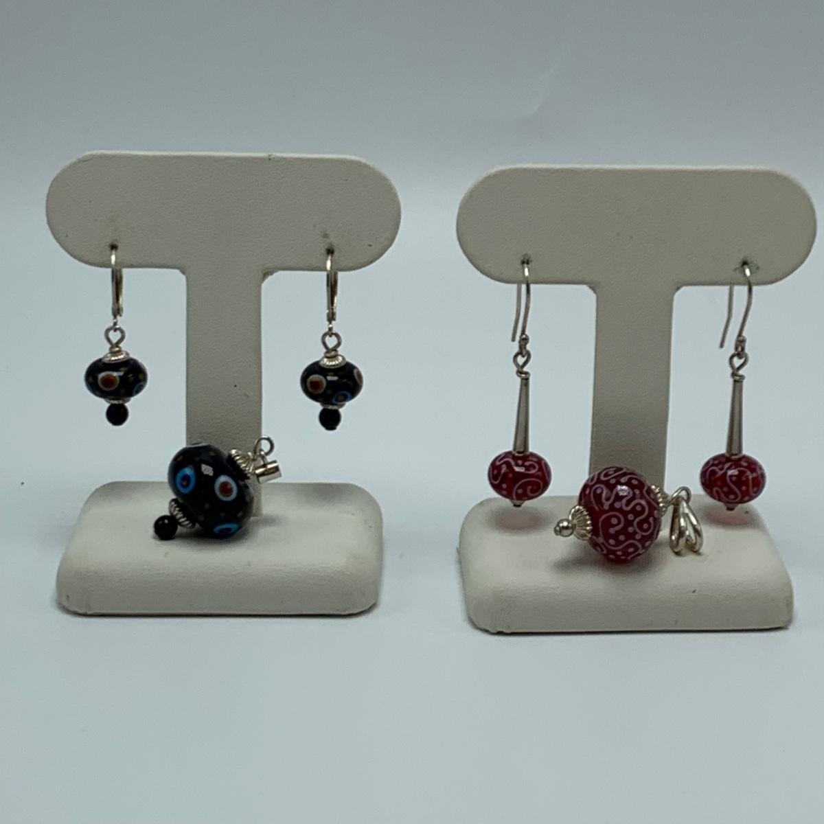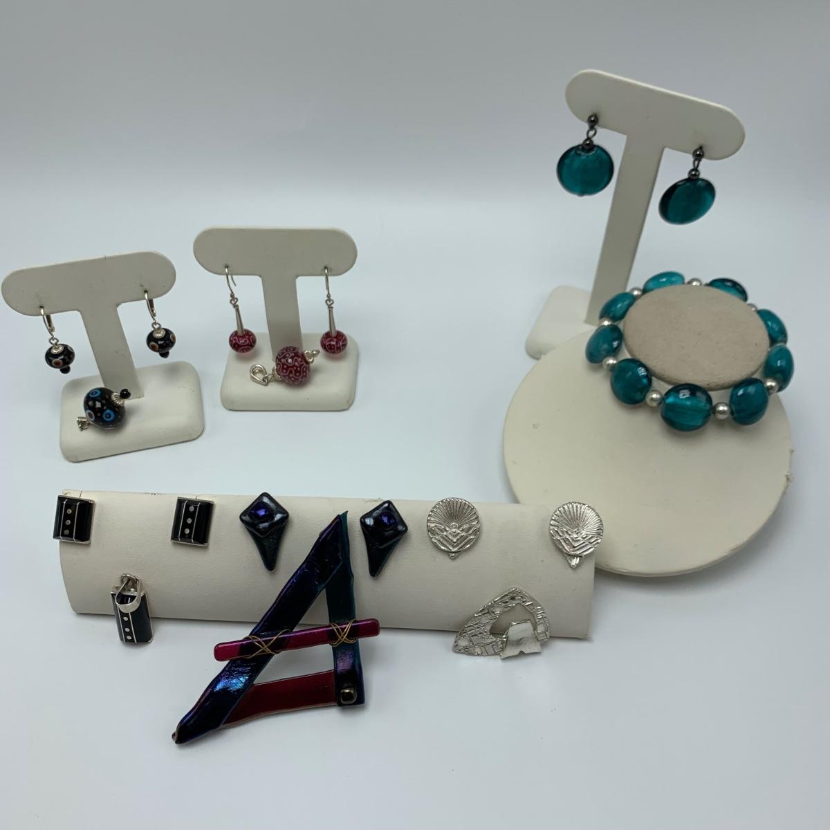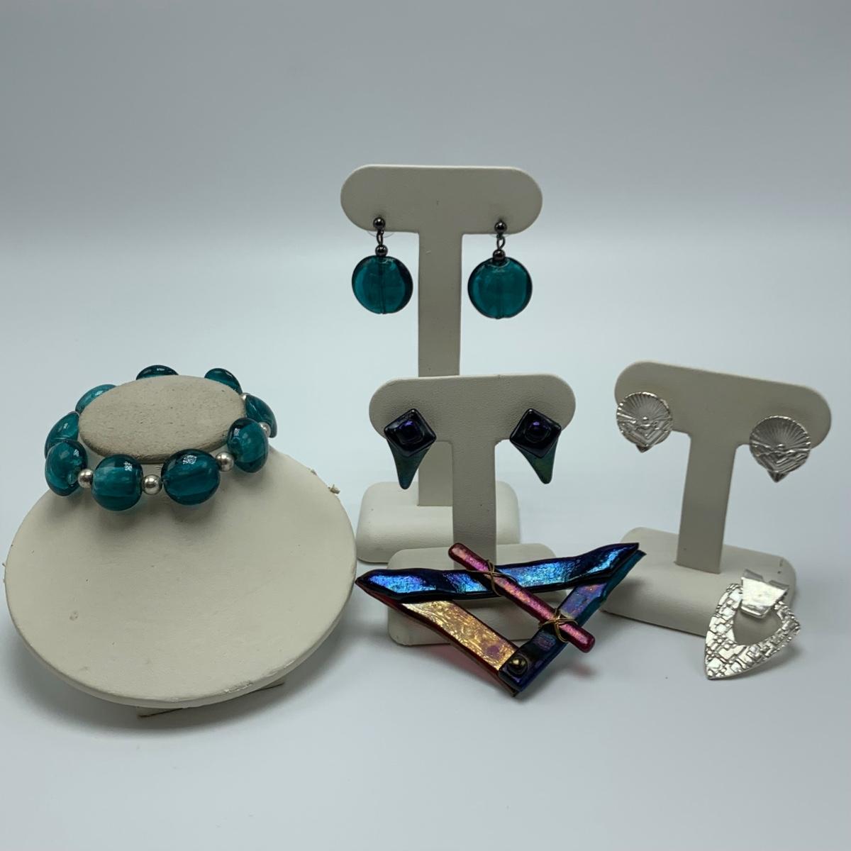 This collection of six jewelry sets has a pair of earrings for pierced ears included in each set. Four of the earring pairs have matching pendants, the fused glass pair has a matching fashion pin, and the teal glass pair has a matching bracelet. The fused glass earrings have a dark iridescent forest green base layer, topped with a diamond shaped black layer and an iridescent purple dot on top. The black set is marked “˜Mexico 925’ and the glass set with polka dots is also marked 925. All sales are final. No returns or refunds. Please bid accordingly.