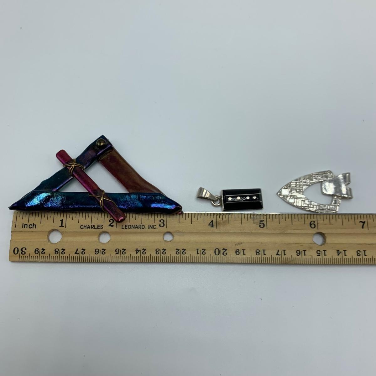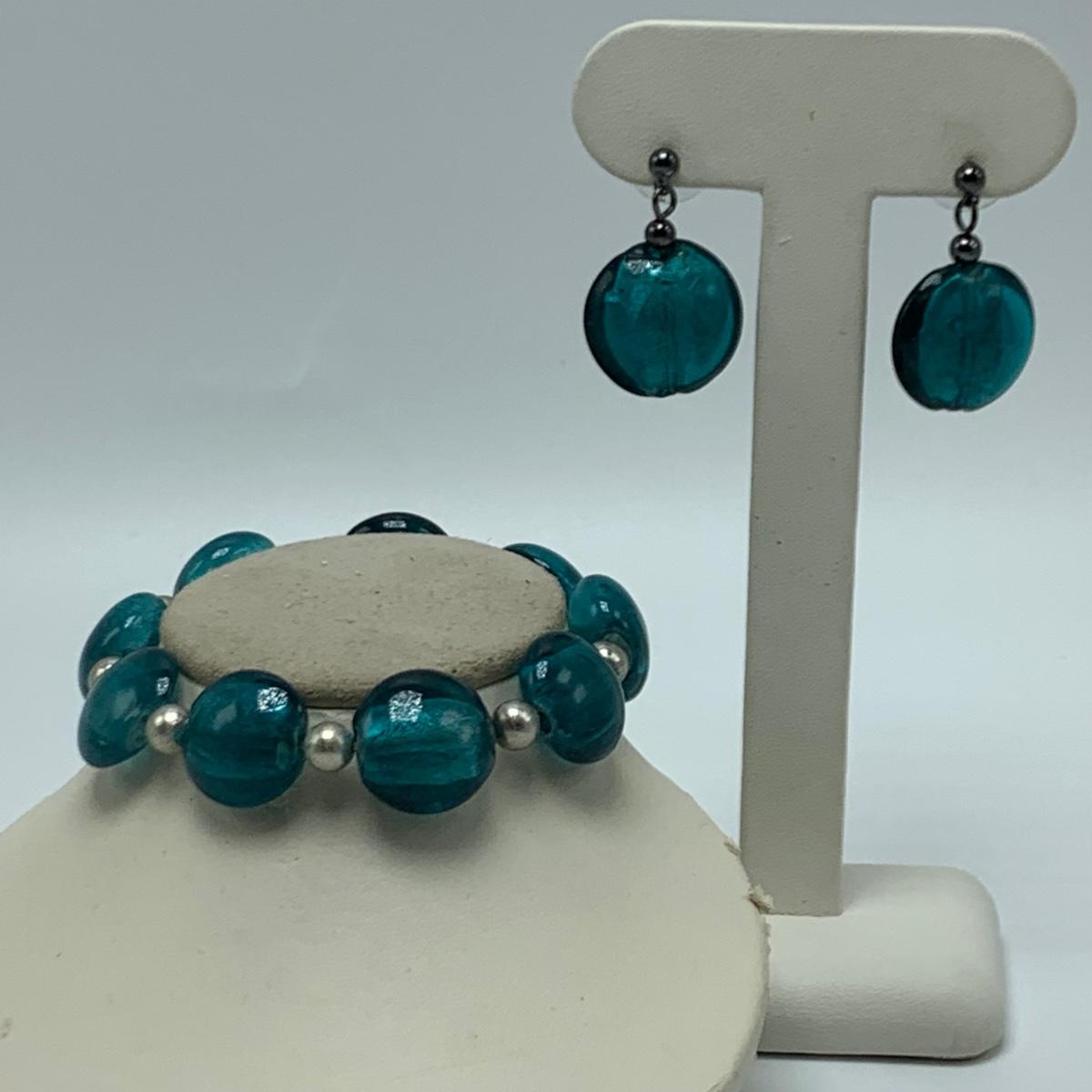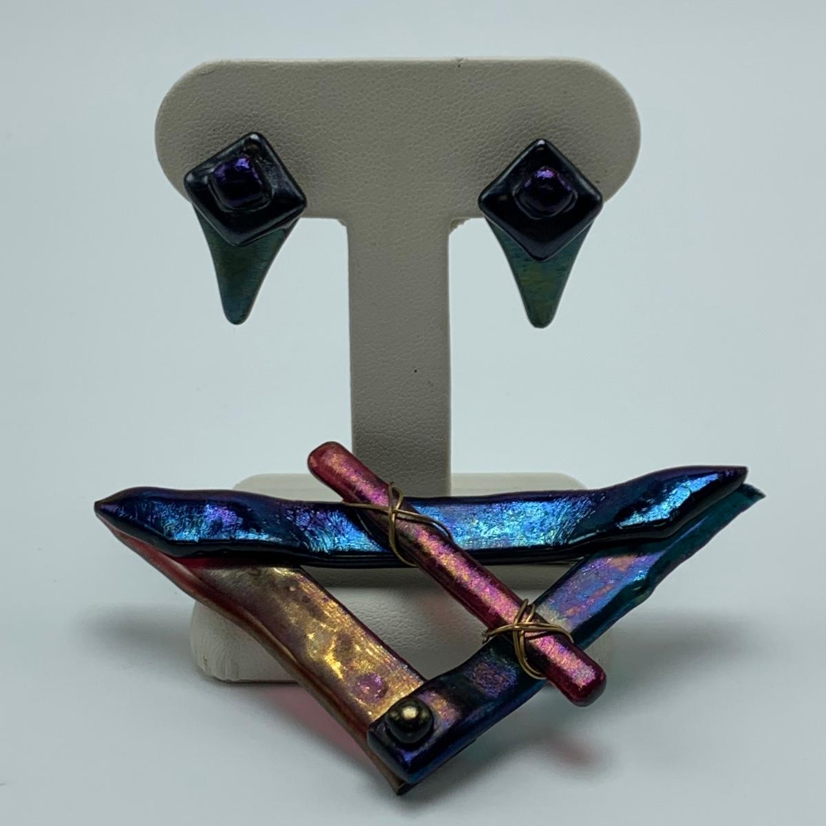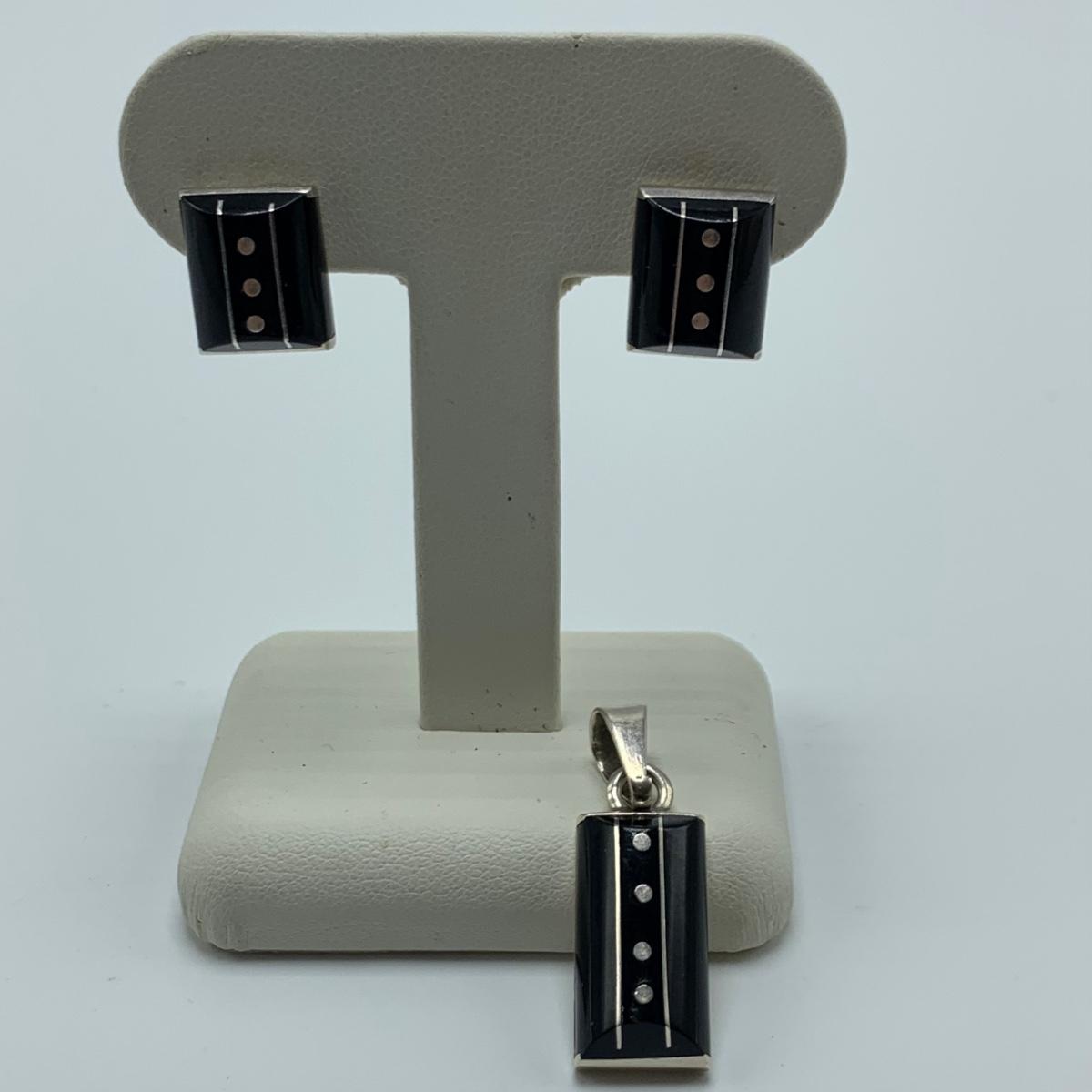 This collection of six jewelry sets has a pair of earrings for pierced ears included in each set. Four of the earring pairs have matching pendants, the fused glass pair has a matching fashion pin, and the teal glass pair has a matching bracelet. The fused glass earrings have a dark iridescent forest green base layer, topped with a diamond shaped black layer and an iridescent purple dot on top. The black set is marked “˜Mexico 925’ and the glass set with polka dots is also marked 925. All sales are final. No returns or refunds. Please bid accordingly.