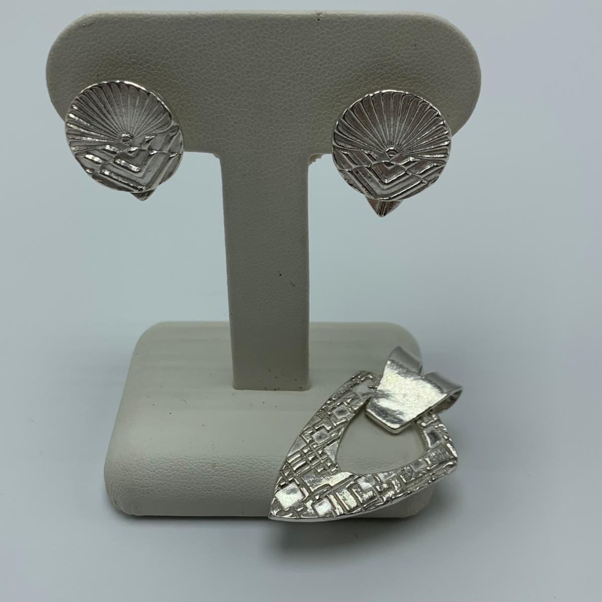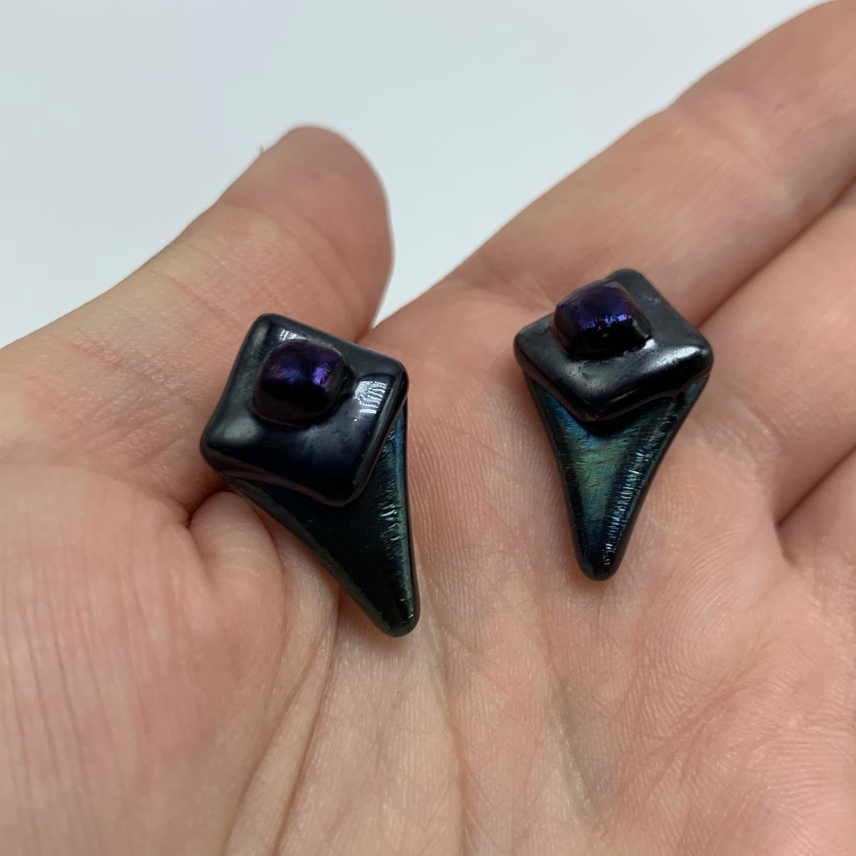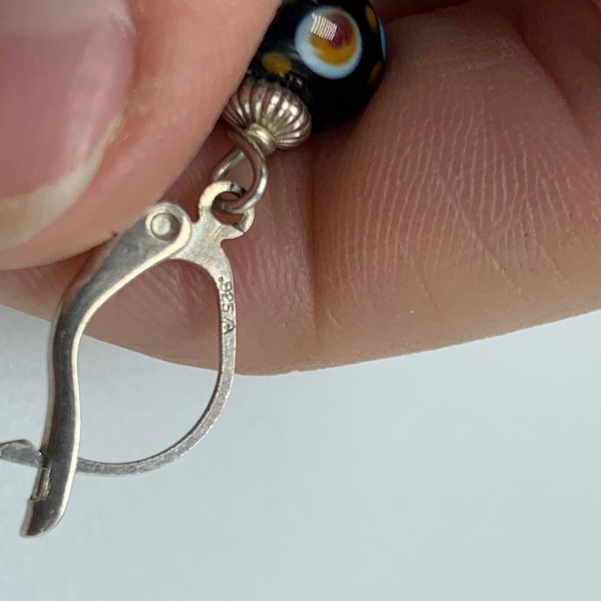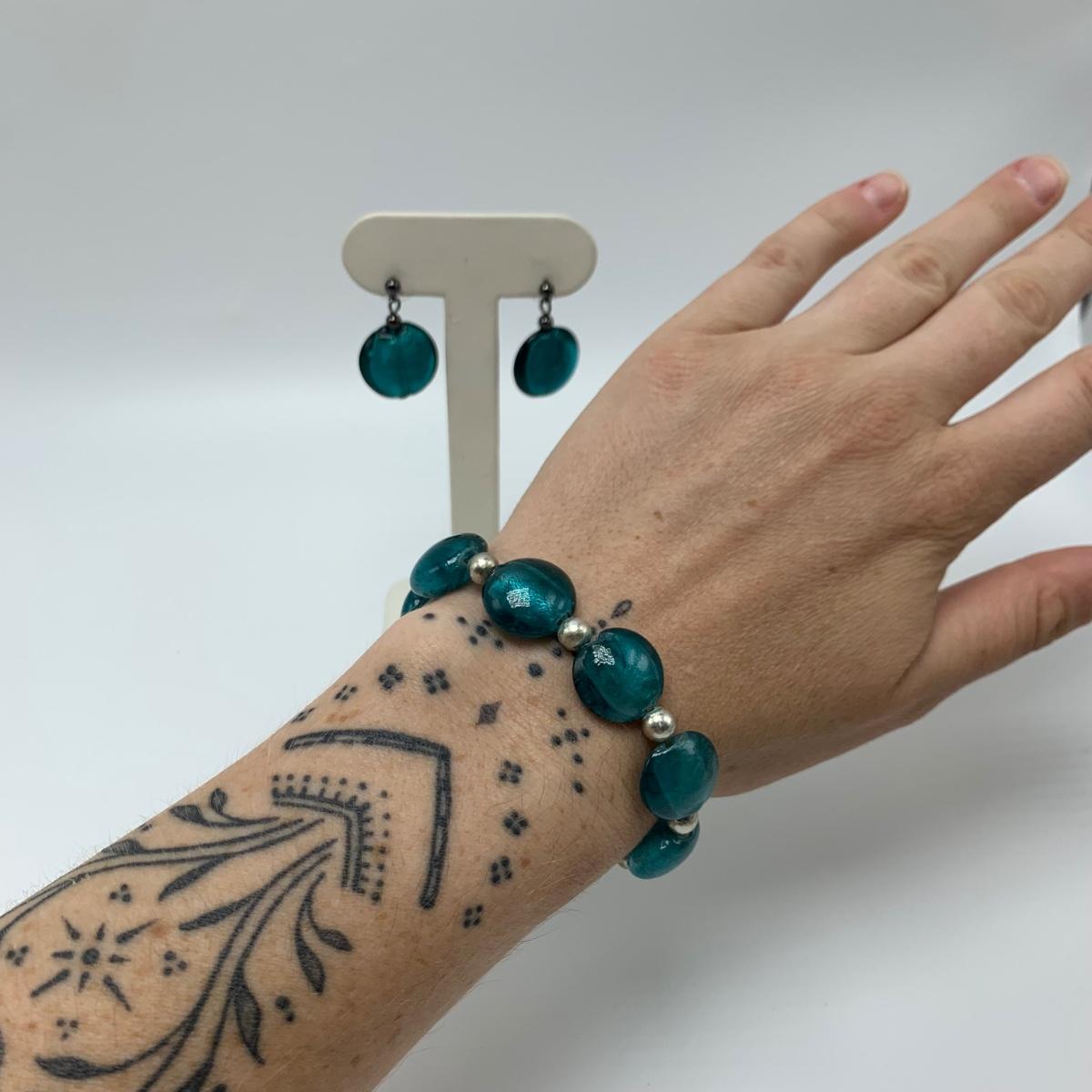 This collection of six jewelry sets has a pair of earrings for pierced ears included in each set. Four of the earring pairs have matching pendants, the fused glass pair has a matching fashion pin, and the teal glass pair has a matching bracelet. The fused glass earrings have a dark iridescent forest green base layer, topped with a diamond shaped black layer and an iridescent purple dot on top. The black set is marked “˜Mexico 925’ and the glass set with polka dots is also marked 925. All sales are final. No returns or refunds. Please bid accordingly.