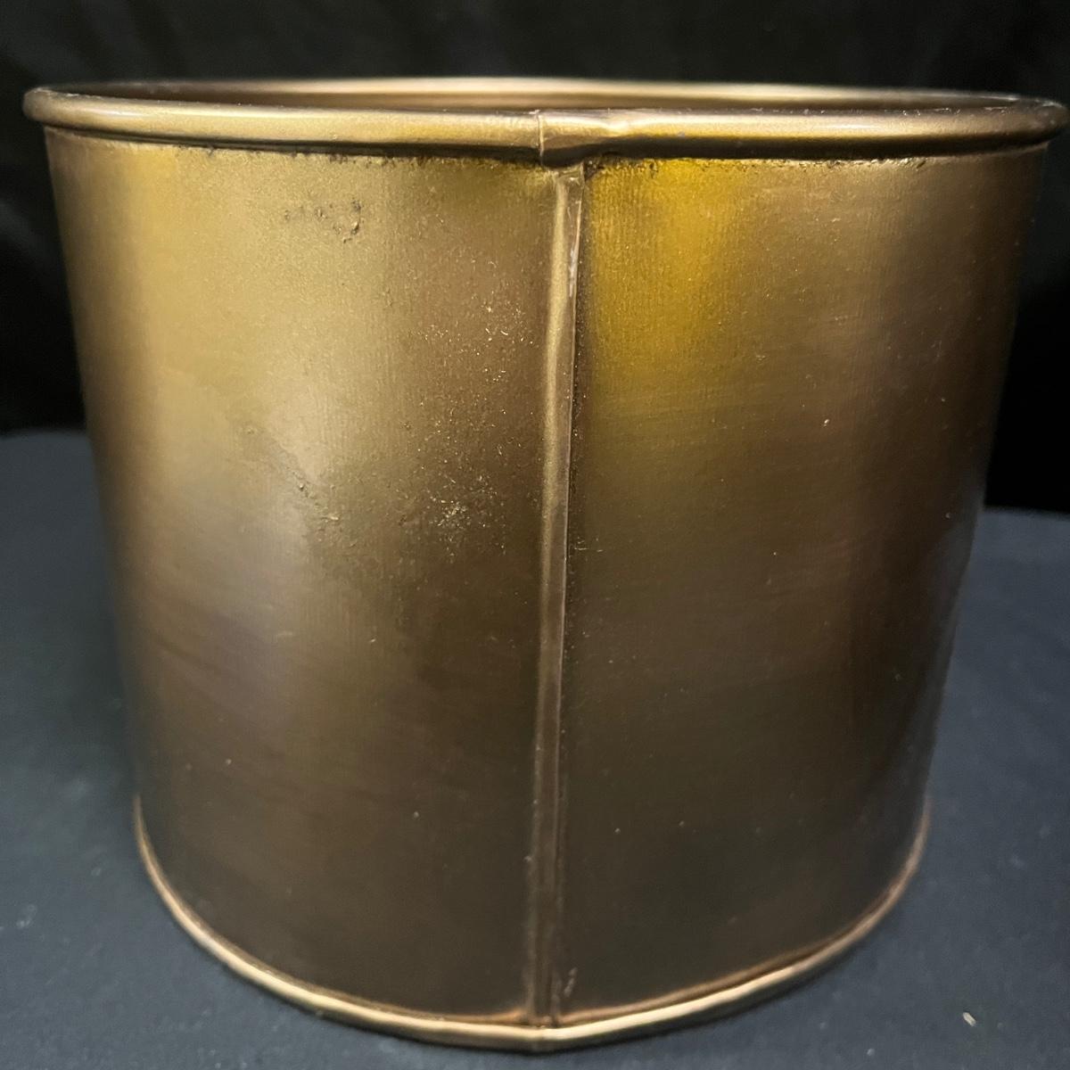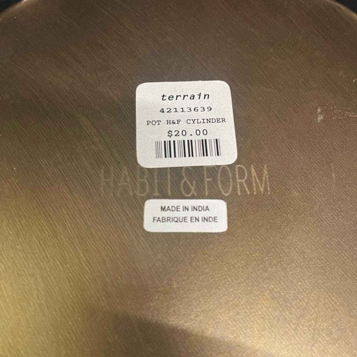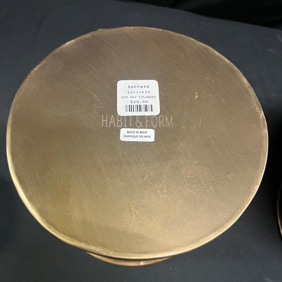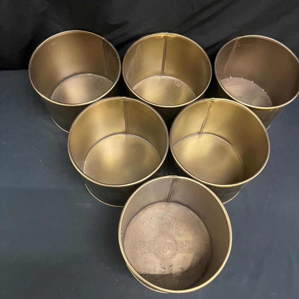 Lot includes six brass colored Habit & Form Metal pots that each measure 7.5”D x 6”H.
