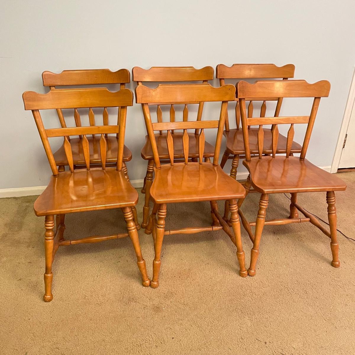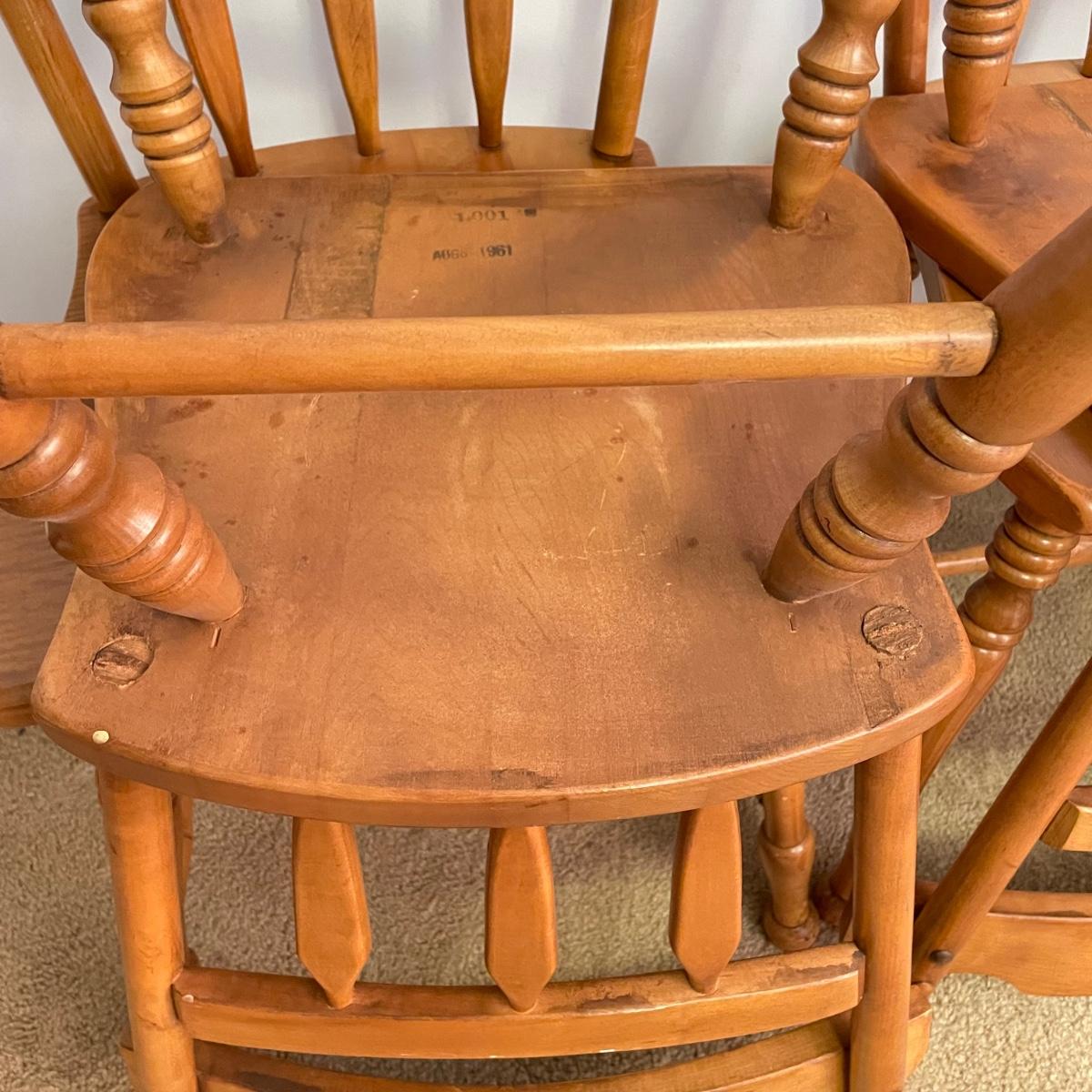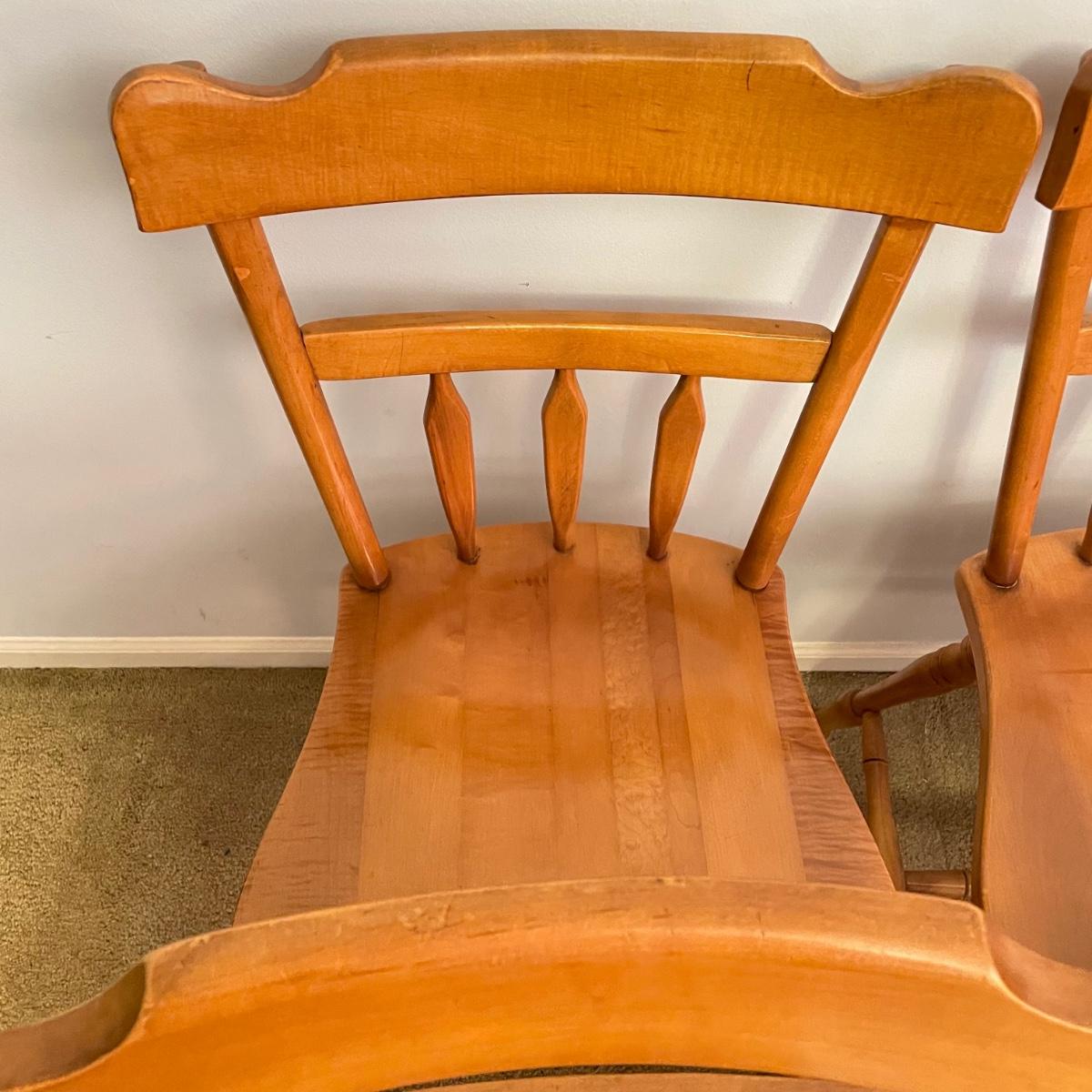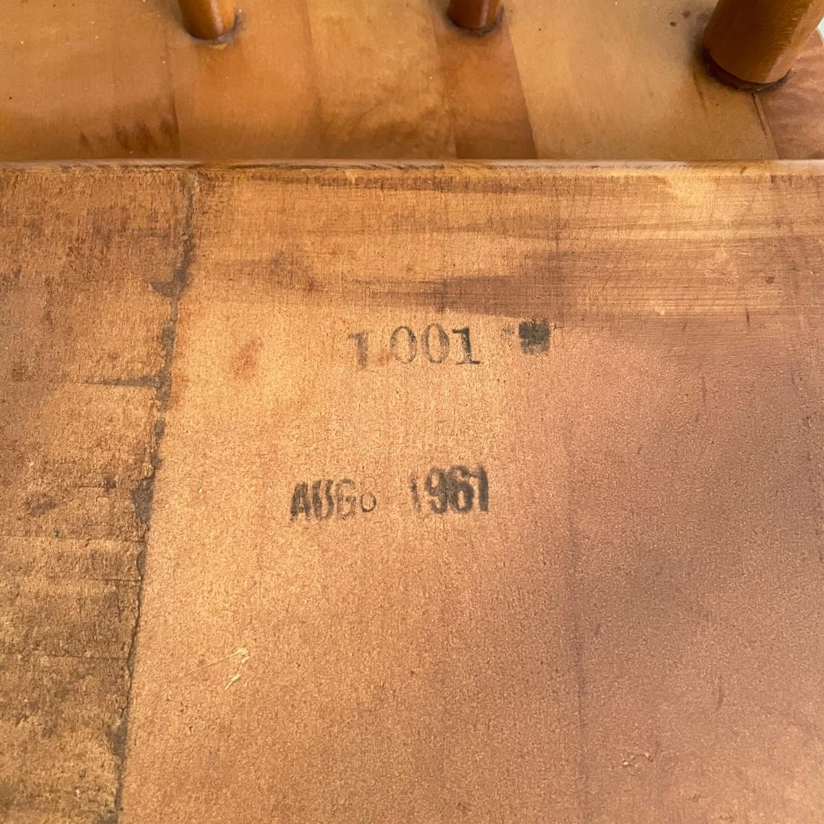 Six dining chairs in very nice condition. Glossy with beautiful wood grain, the owners have stated they are maple hard wood. Each are marked 1001 Aug 8 1961. Chairs measure approximately 17” x 18” x 33.5” with a seat height at 18”. These chairs also pair nicely with the drop-leaf kitchen table in lot 226. See images. Local pick up only.