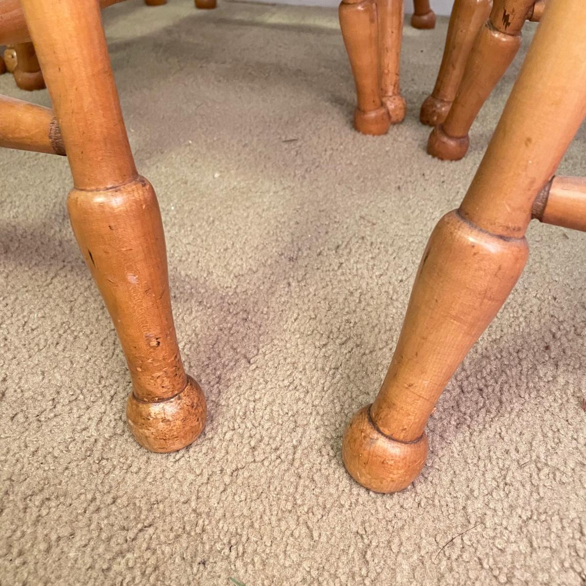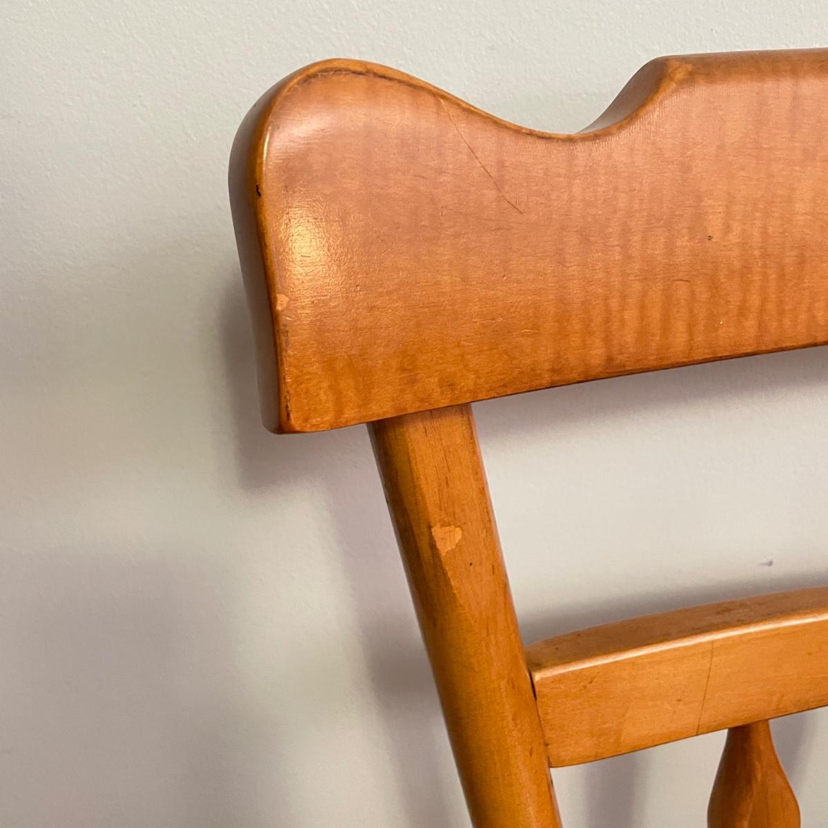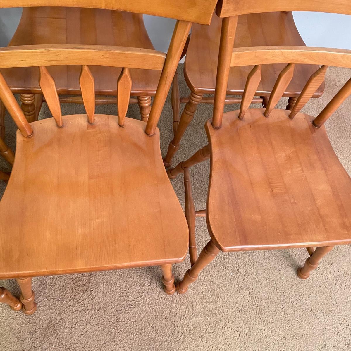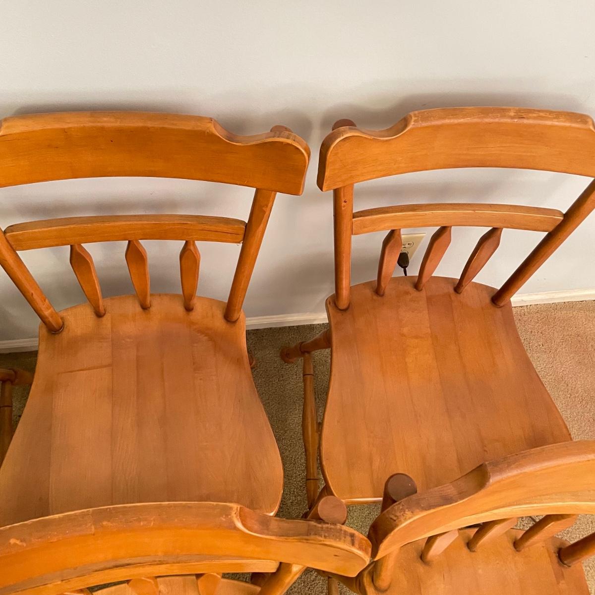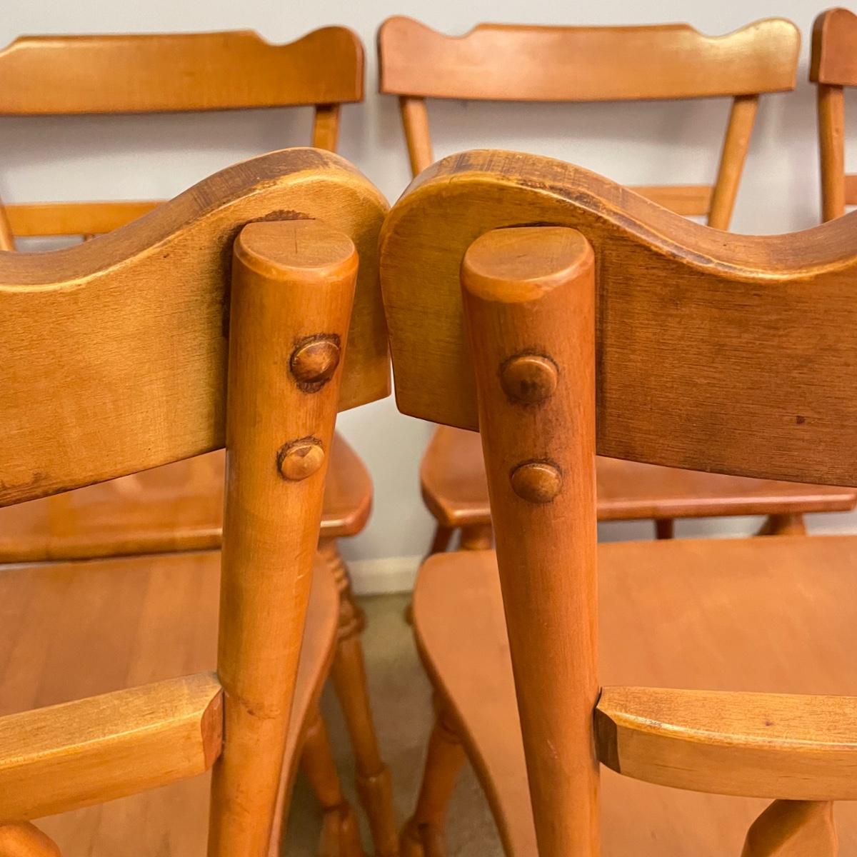 Six dining chairs in very nice condition. Glossy with beautiful wood grain, the owners have stated they are maple hard wood. Each are marked 1001 Aug 8 1961. Chairs measure approximately 17” x 18” x 33.5” with a seat height at 18”. These chairs also pair nicely with the drop-leaf kitchen table in lot 226. See images. Local pick up only.