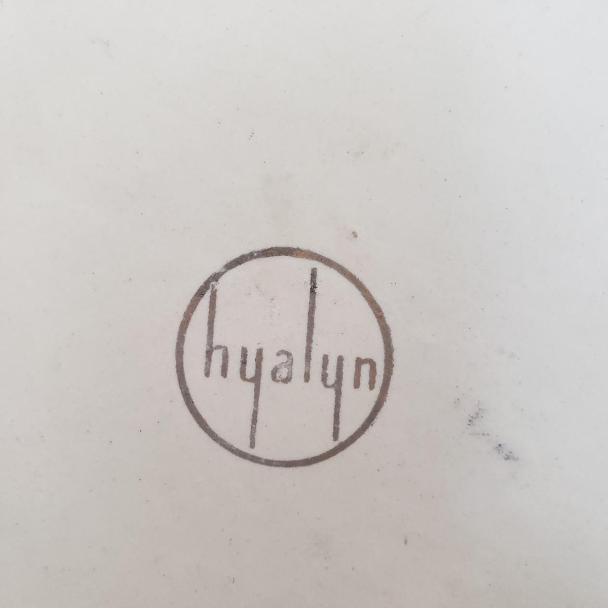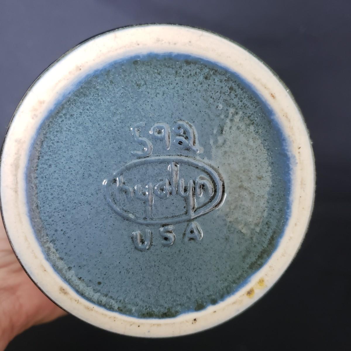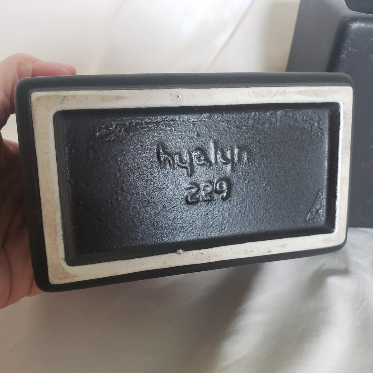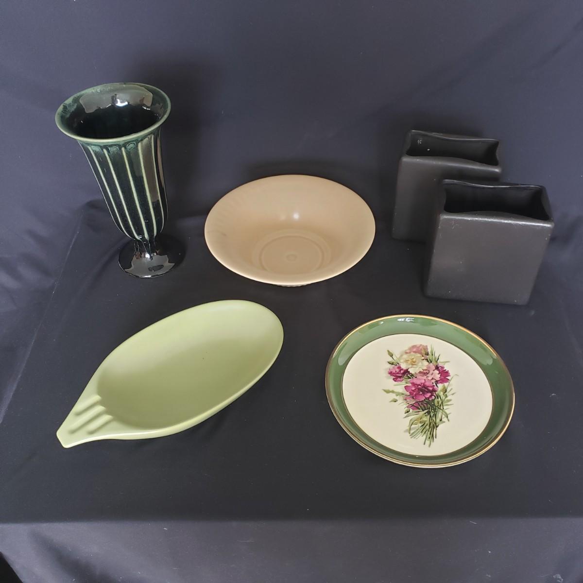 This six piece Hyalyn pottery collection has both smooth matte finishes as well as glossy. The green/black vase measures 9" x 5". Each piece is stamped and some are numbered. See pictures for details. The cream bowl has a blemish but may be able to wash off.