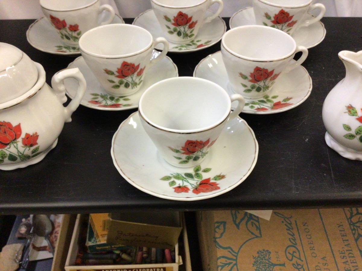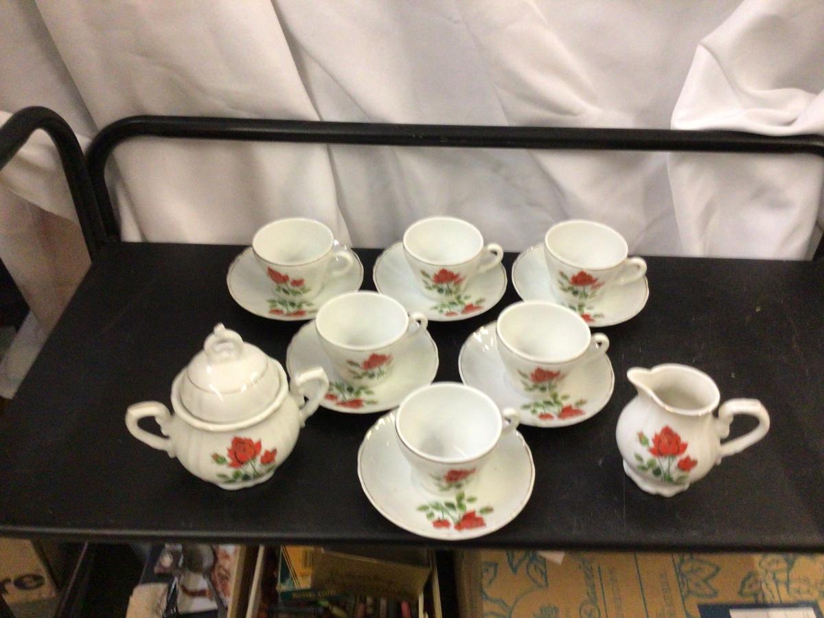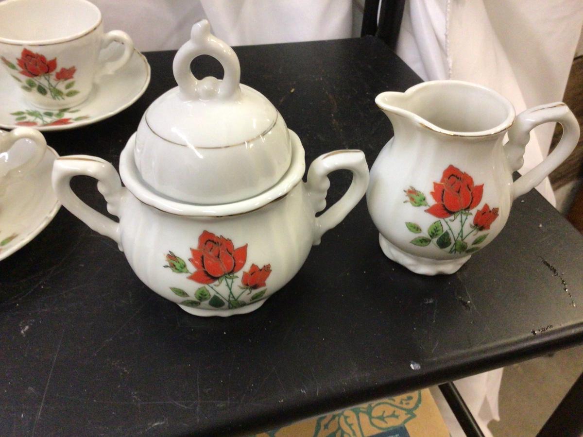 Great six cups and saucer with red roses and matching cream and sugar. They are made in Japan.