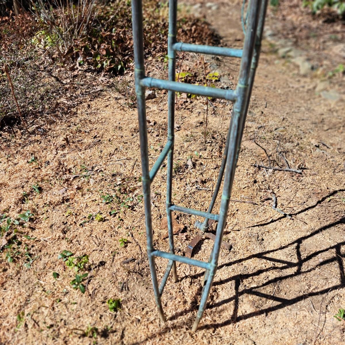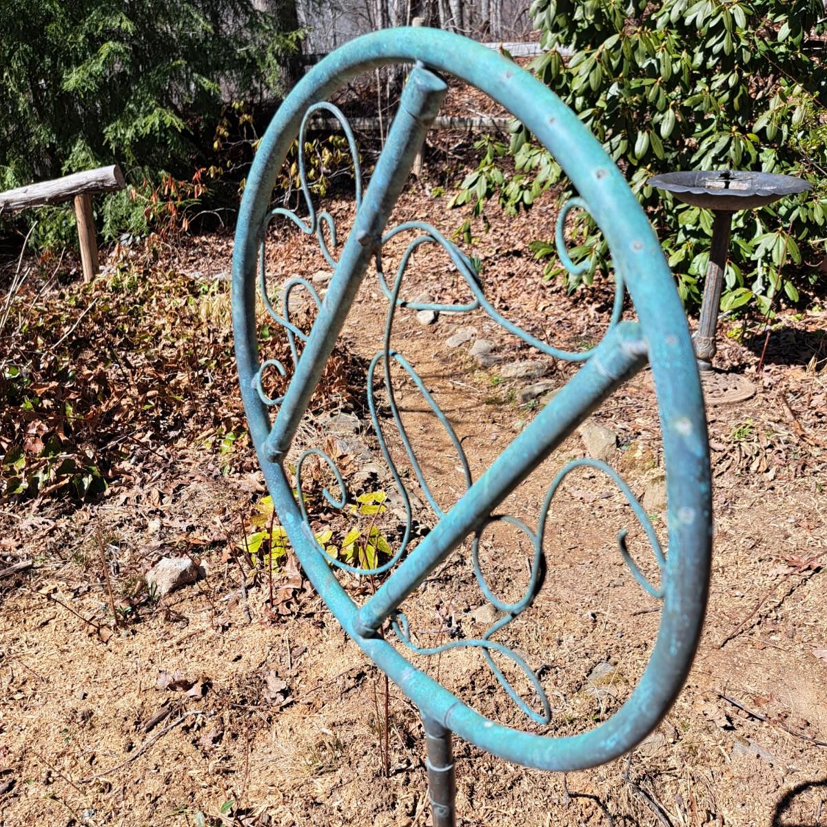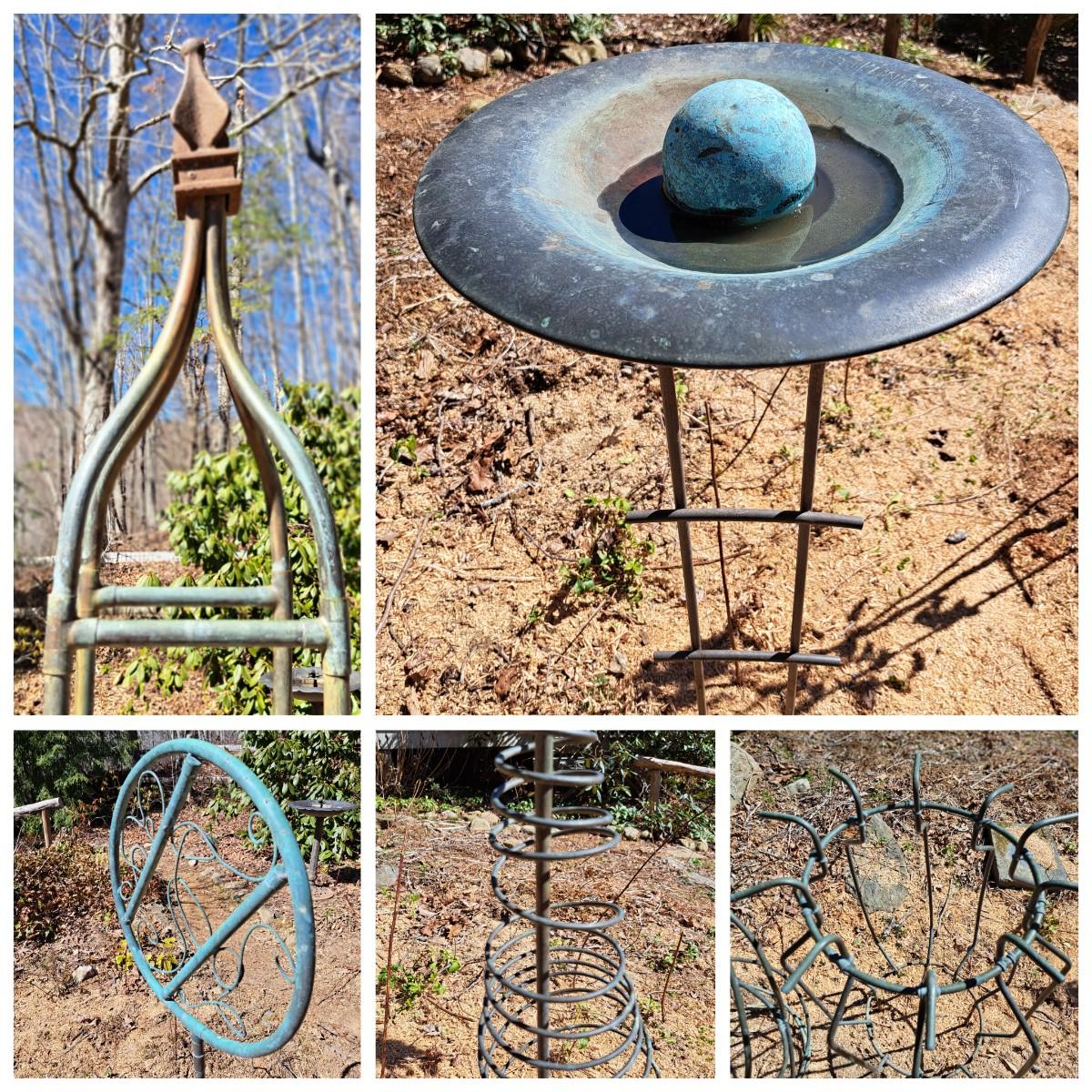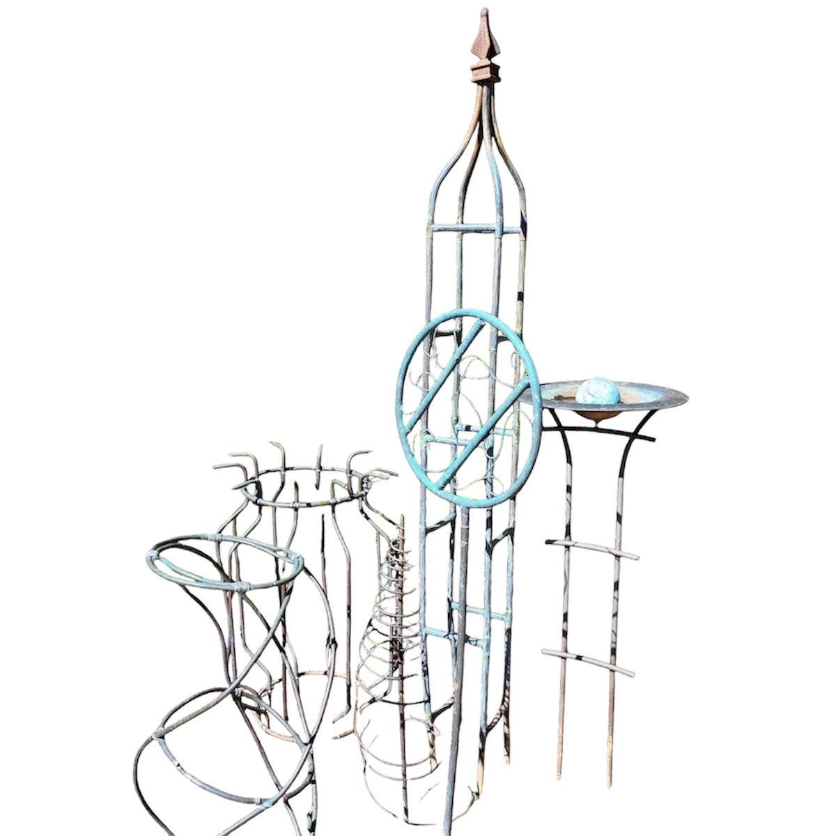 These six lively outdoor sculptures appear to be artisan-made with copper tubing and copper wire and weathered with a deep verdigris patina. They range in size from 32"H to 73"H and feature a spiral tree-shaped sculpture (smallest), a tall, ladder-like tower with a rusted iron finial on top (largest), a circular, shield-like sculpture mounted on a pole that can turn with the wind, an abstract cylindrical form sculpture, a geometric planter-type sculpture and a saucer-shaped sculpture on a fence post with a removable copper ball in center. Local pickup only.