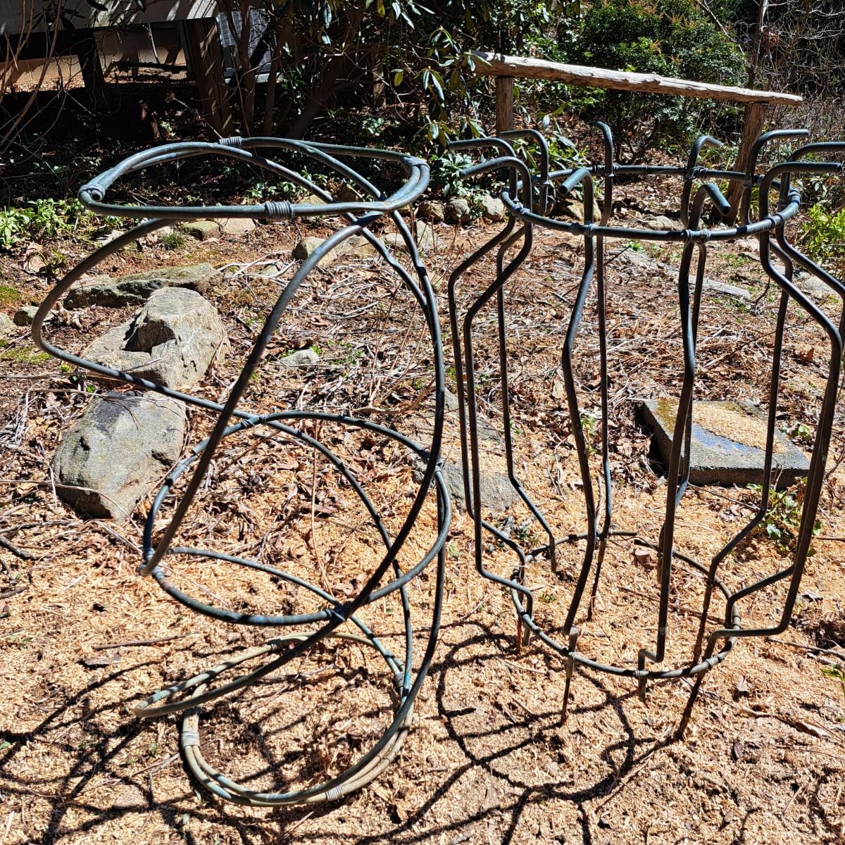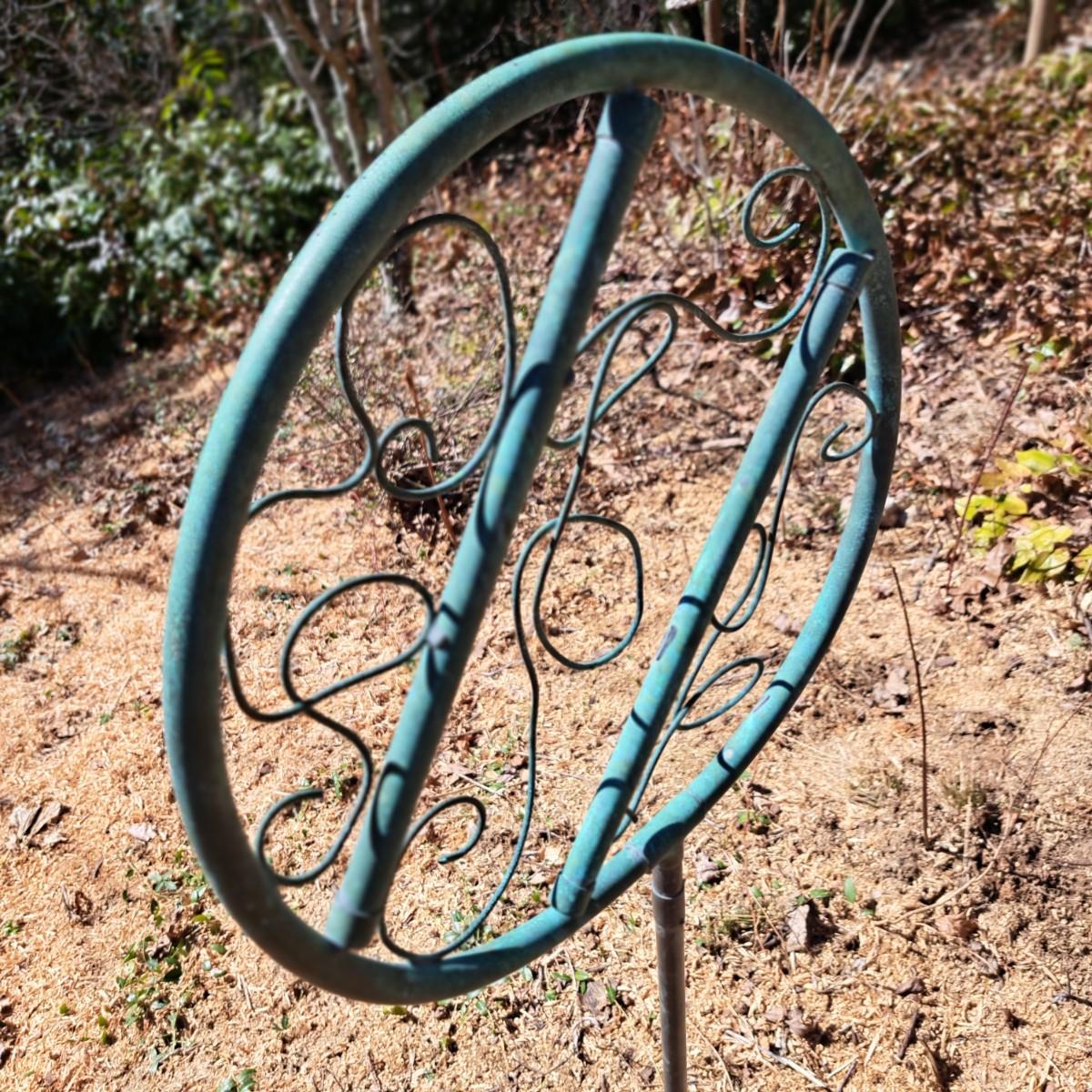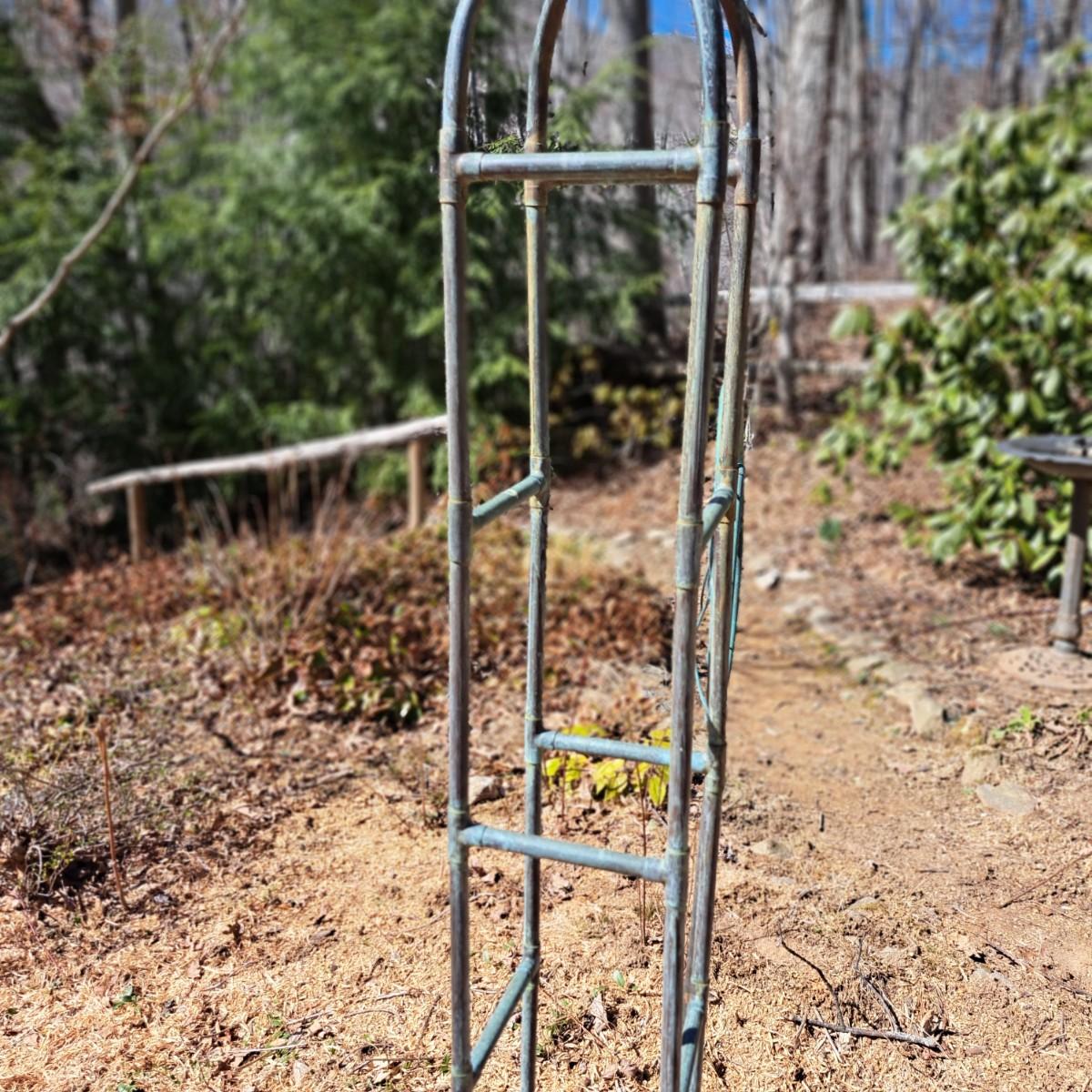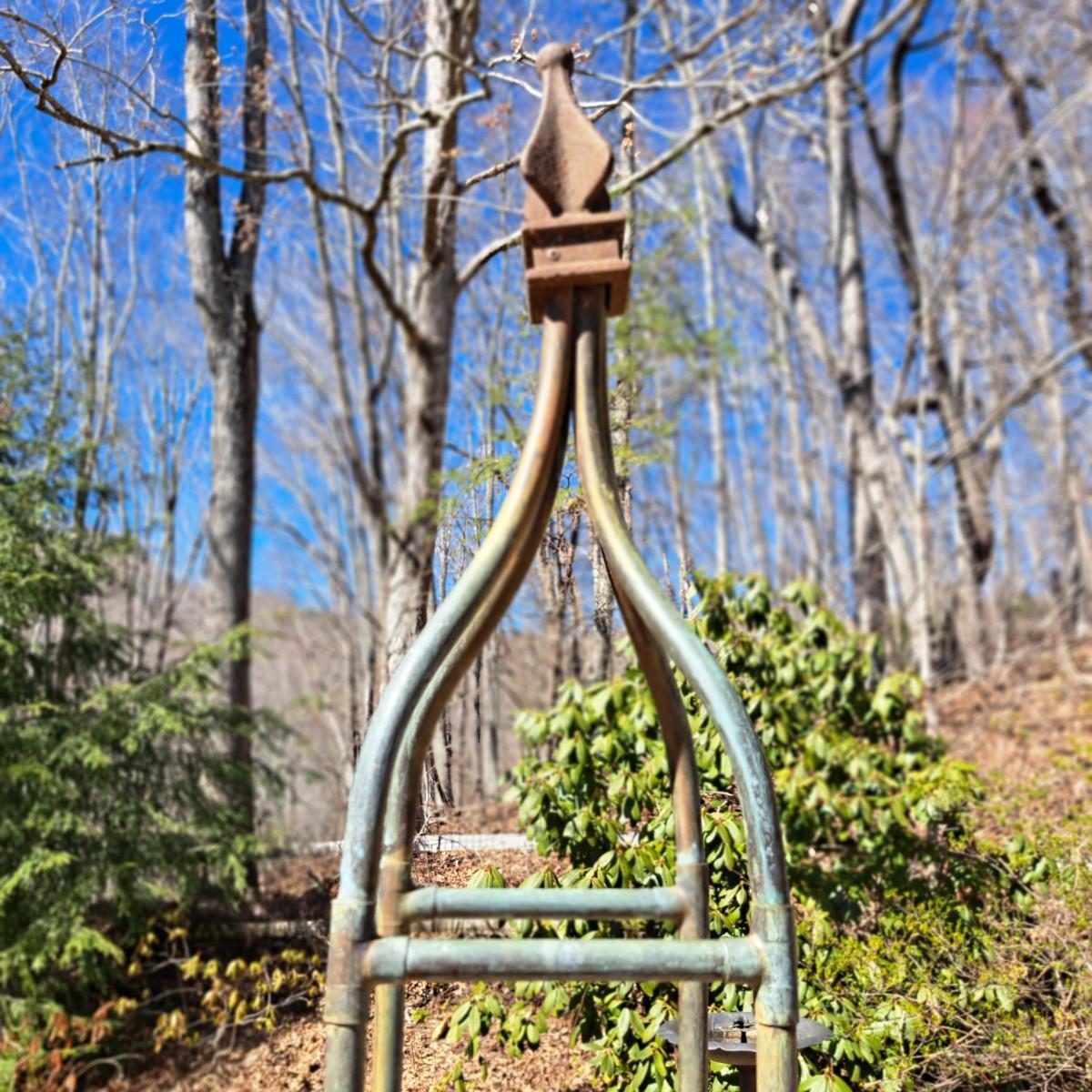 These six lively outdoor sculptures appear to be artisan-made with copper tubing and copper wire and weathered with a deep verdigris patina. They range in size from 32"H to 73"H and feature a spiral tree-shaped sculpture (smallest), a tall, ladder-like tower with a rusted iron finial on top (largest), a circular, shield-like sculpture mounted on a pole that can turn with the wind, an abstract cylindrical form sculpture, a geometric planter-type sculpture and a saucer-shaped sculpture on a fence post with a removable copper ball in center. Local pickup only.
