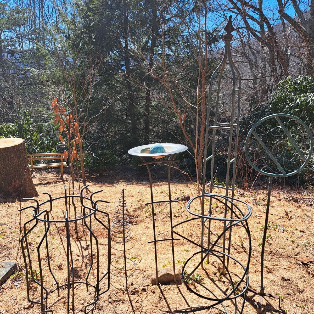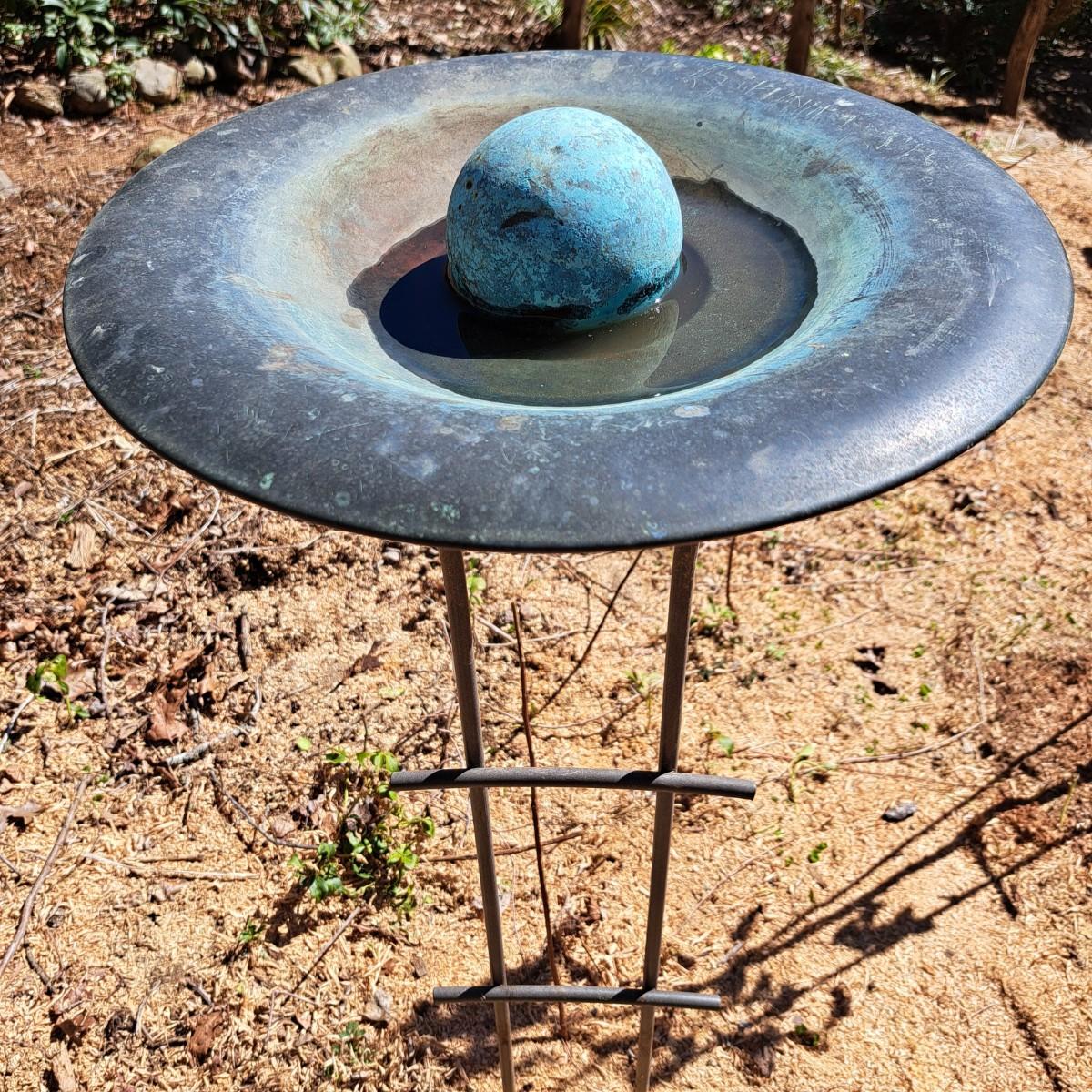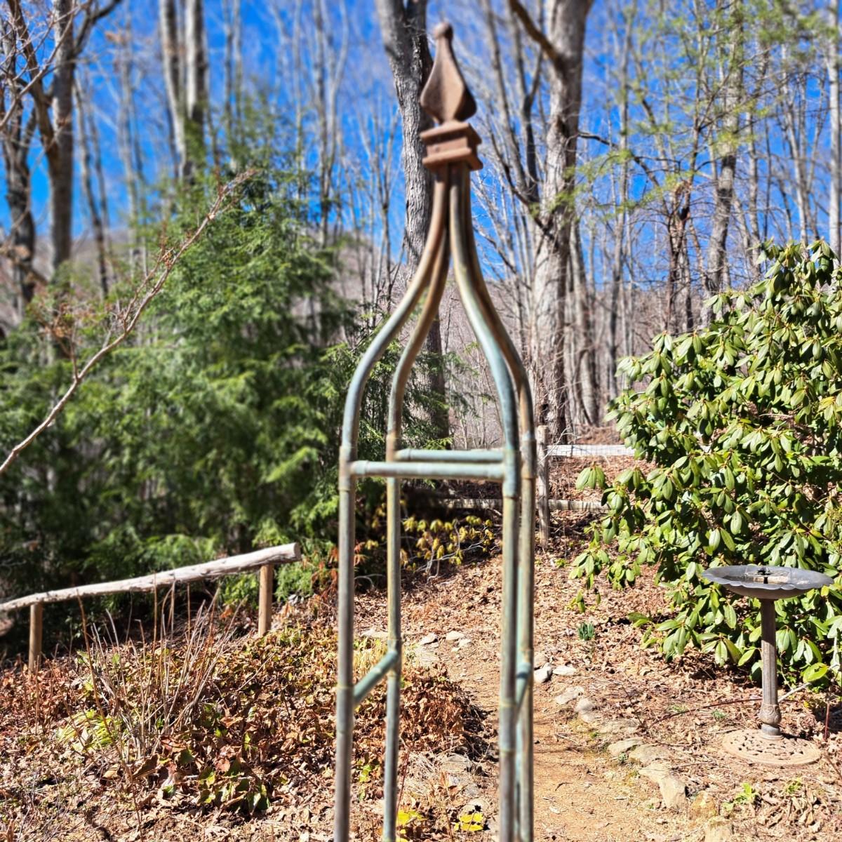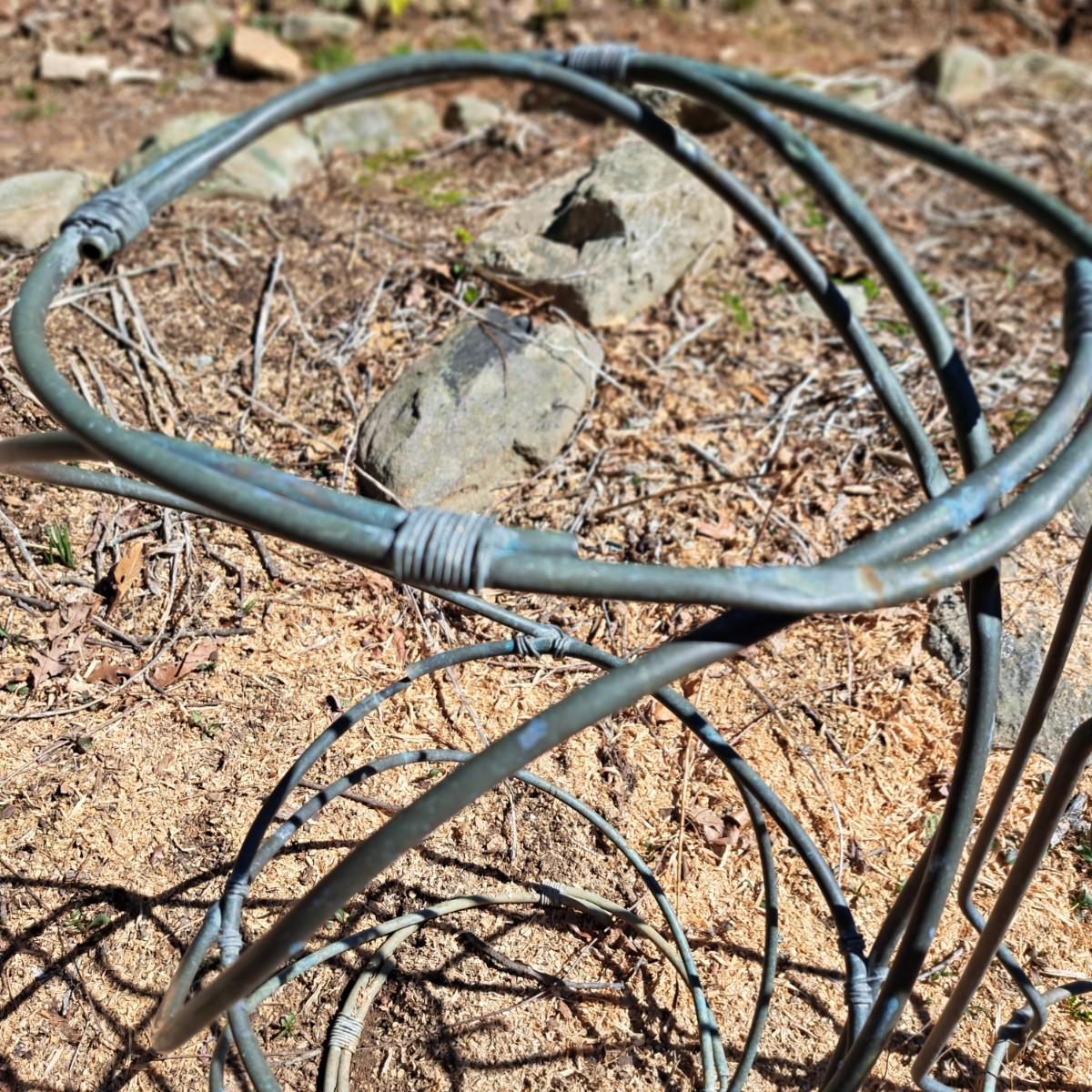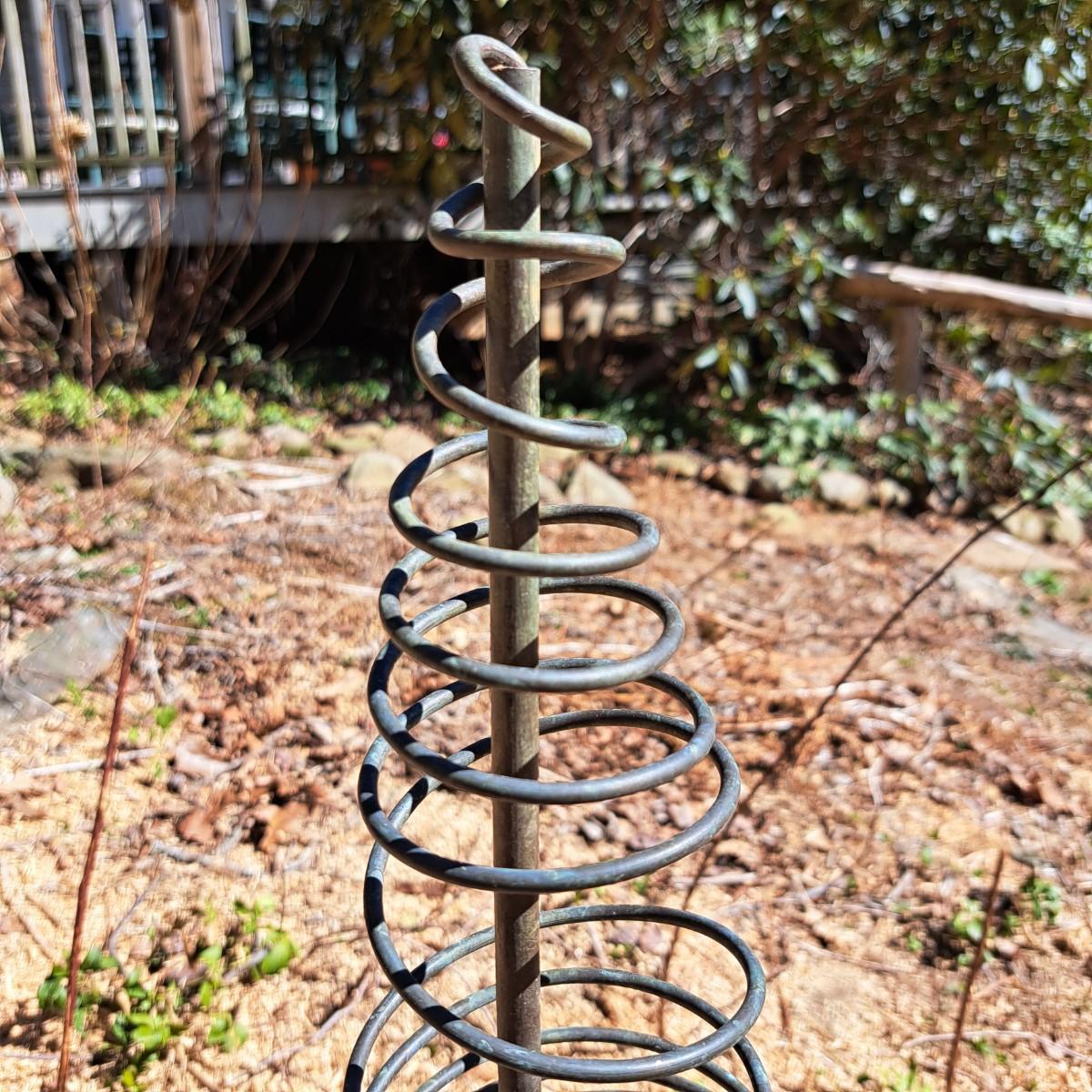 These six lively outdoor sculptures appear to be artisan-made with copper tubing and copper wire and weathered with a deep verdigris patina. They range in size from 32"H to 73"H and feature a spiral tree-shaped sculpture (smallest), a tall, ladder-like tower with a rusted iron finial on top (largest), a circular, shield-like sculpture mounted on a pole that can turn with the wind, an abstract cylindrical form sculpture, a geometric planter-type sculpture and a saucer-shaped sculpture on a fence post with a removable copper ball in center. Local pickup only.