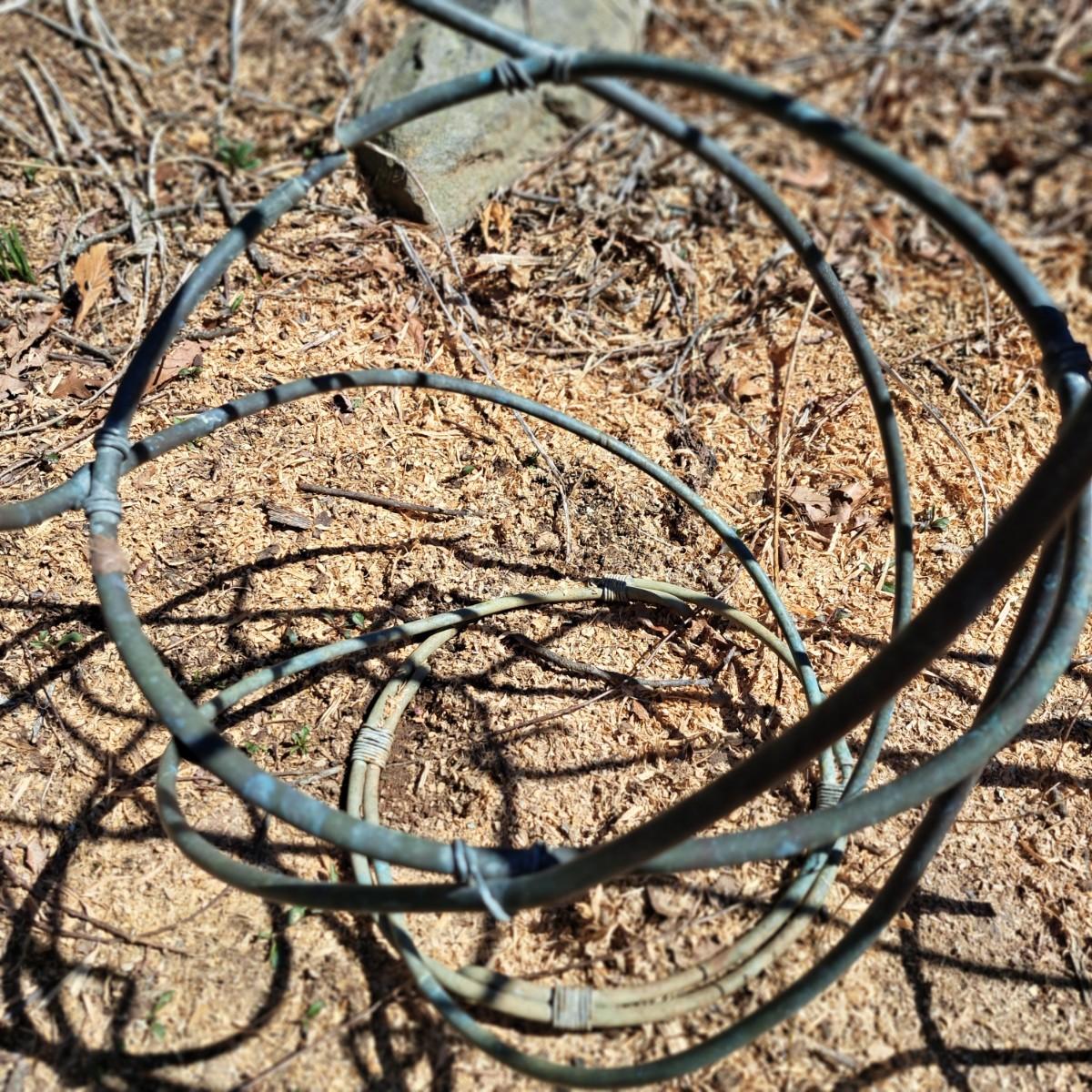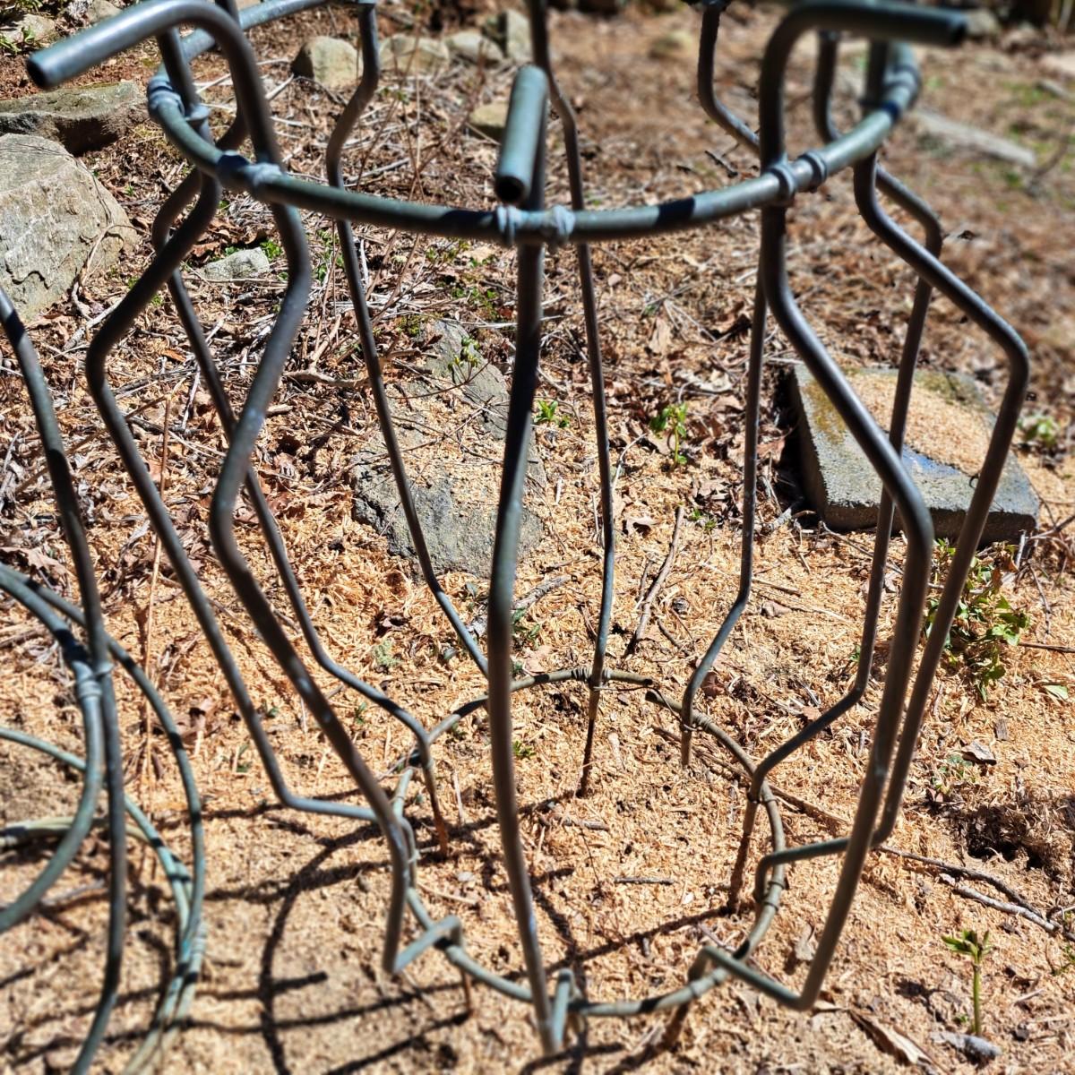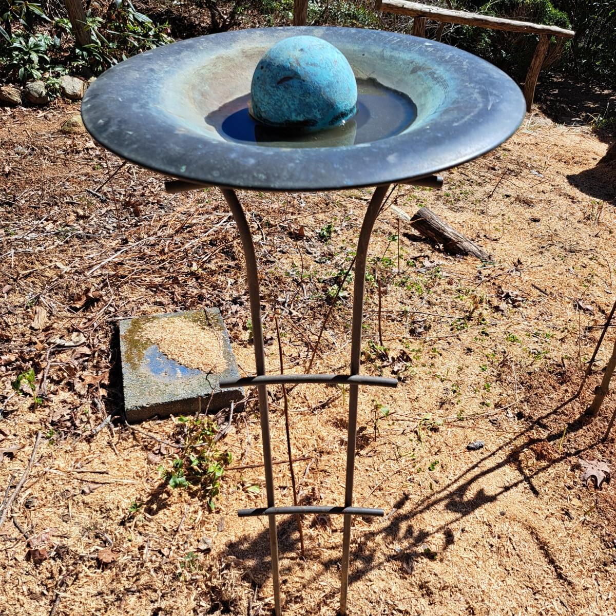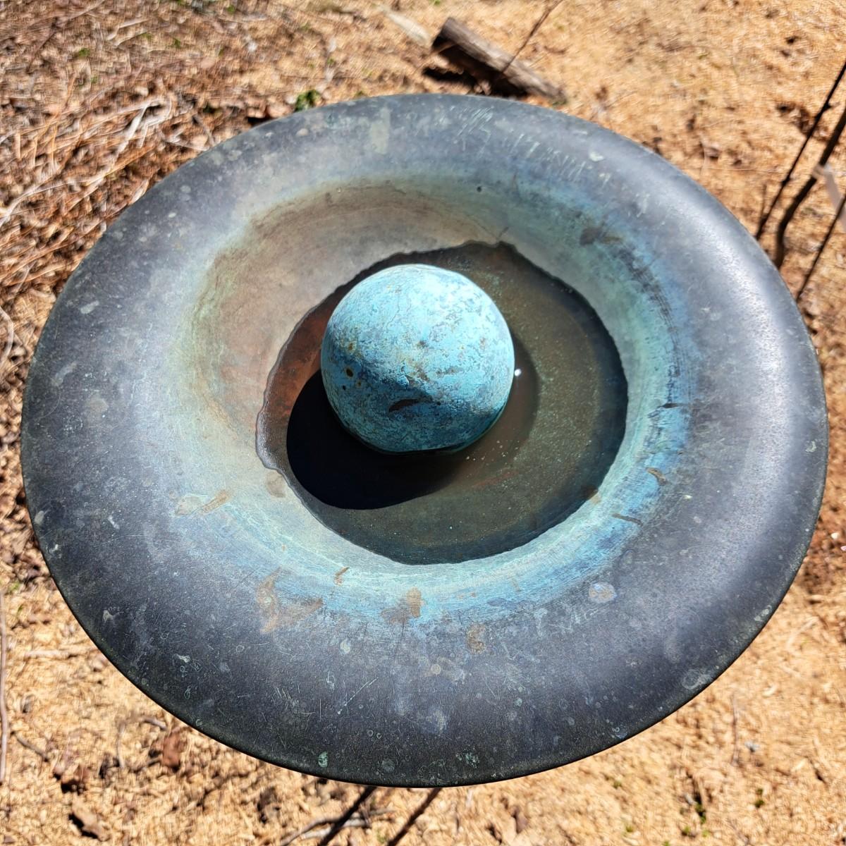 These six lively outdoor sculptures appear to be artisan-made with copper tubing and copper wire and weathered with a deep verdigris patina. They range in size from 32"H to 73"H and feature a spiral tree-shaped sculpture (smallest), a tall, ladder-like tower with a rusted iron finial on top (largest), a circular, shield-like sculpture mounted on a pole that can turn with the wind, an abstract cylindrical form sculpture, a geometric planter-type sculpture and a saucer-shaped sculpture on a fence post with a removable copper ball in center. Local pickup only.