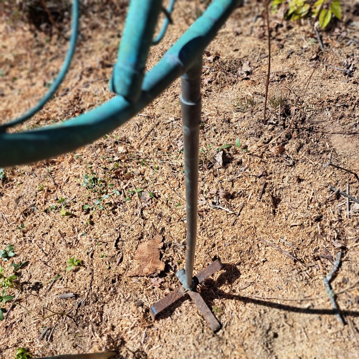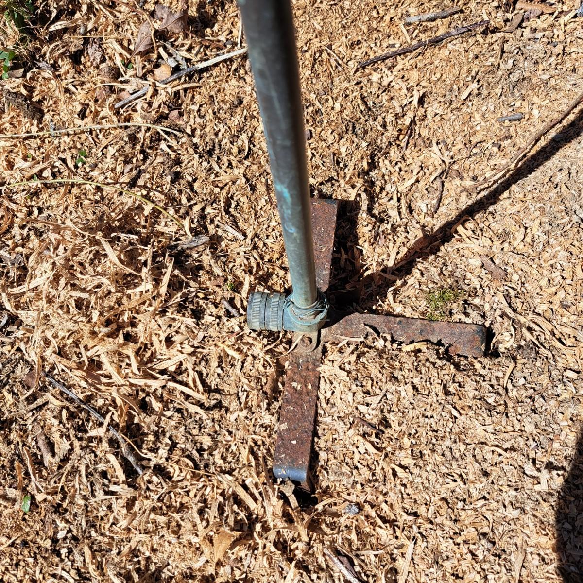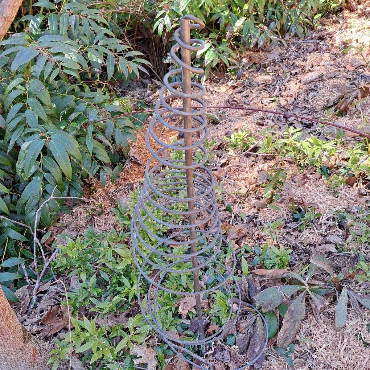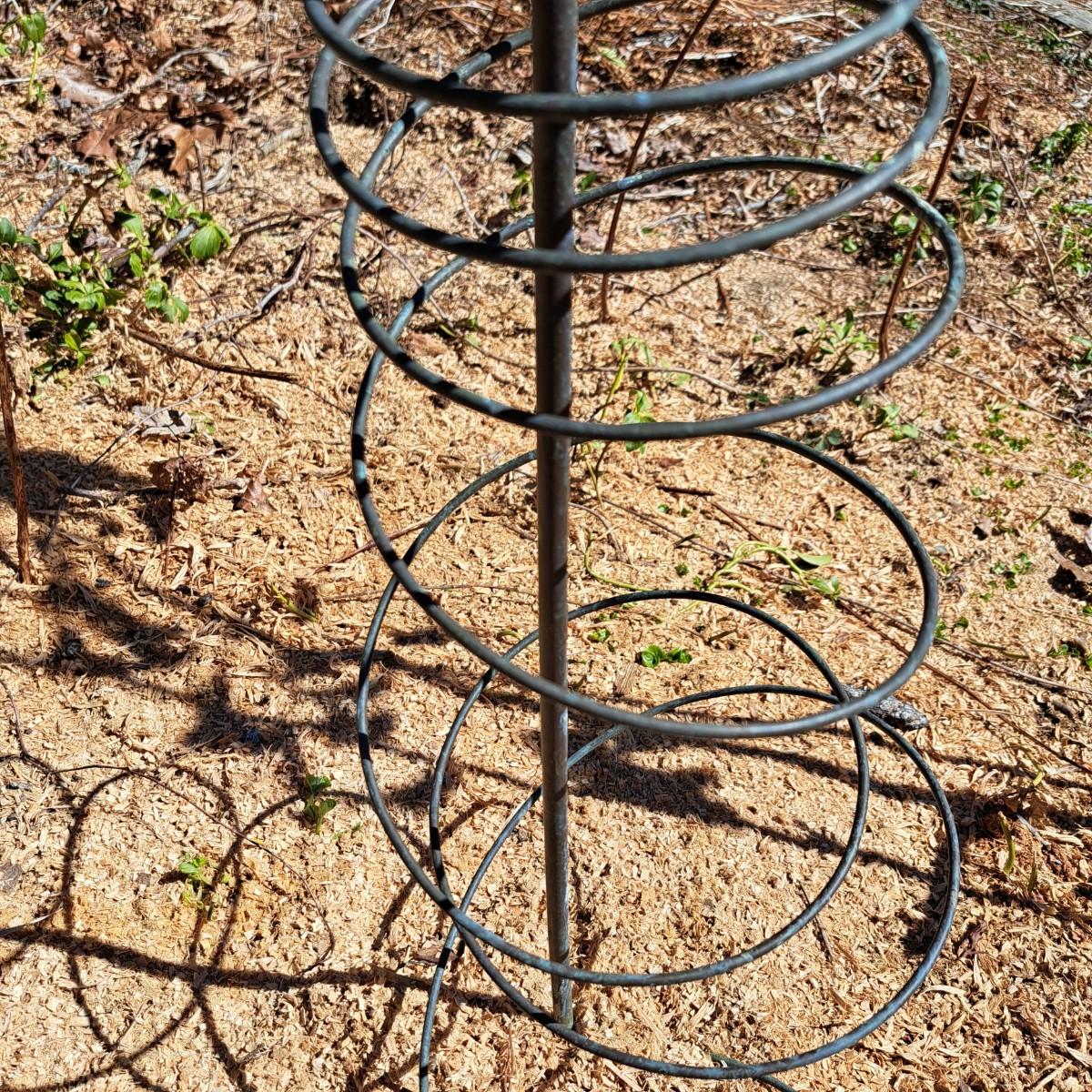 These six lively outdoor sculptures appear to be artisan-made with copper tubing and copper wire and weathered with a deep verdigris patina. They range in size from 32"H to 73"H and feature a spiral tree-shaped sculpture (smallest), a tall, ladder-like tower with a rusted iron finial on top (largest), a circular, shield-like sculpture mounted on a pole that can turn with the wind, an abstract cylindrical form sculpture, a geometric planter-type sculpture and a saucer-shaped sculpture on a fence post with a removable copper ball in center. Local pickup only.