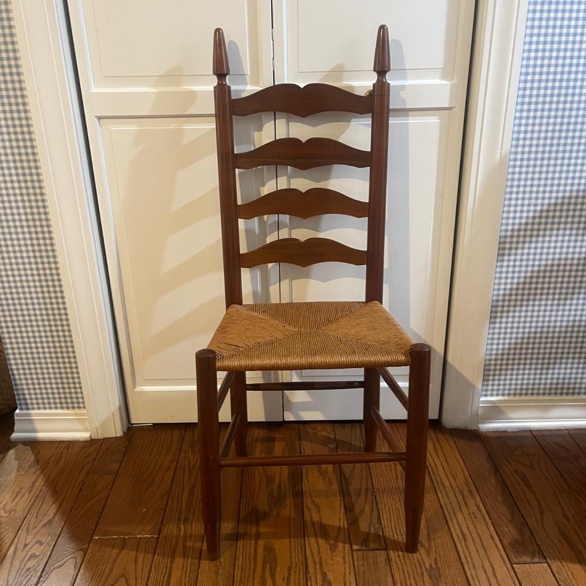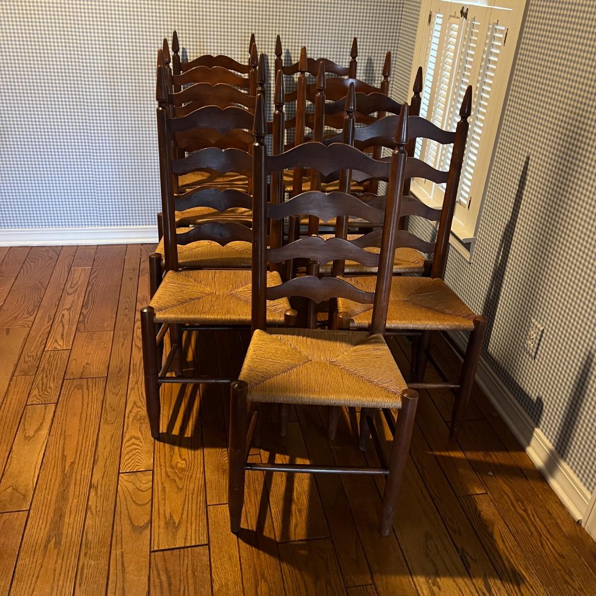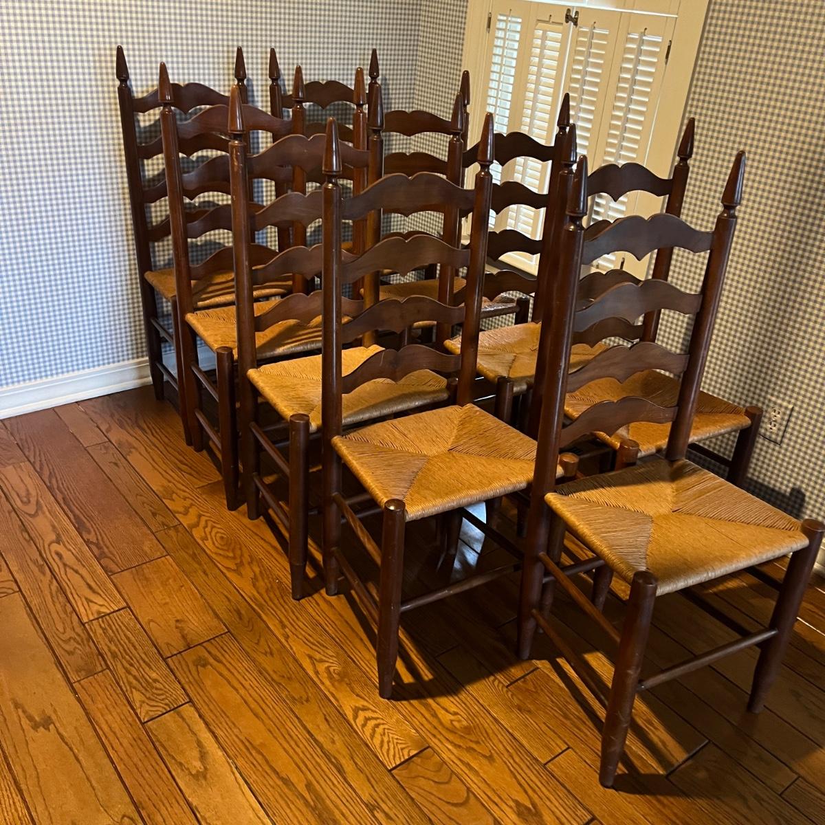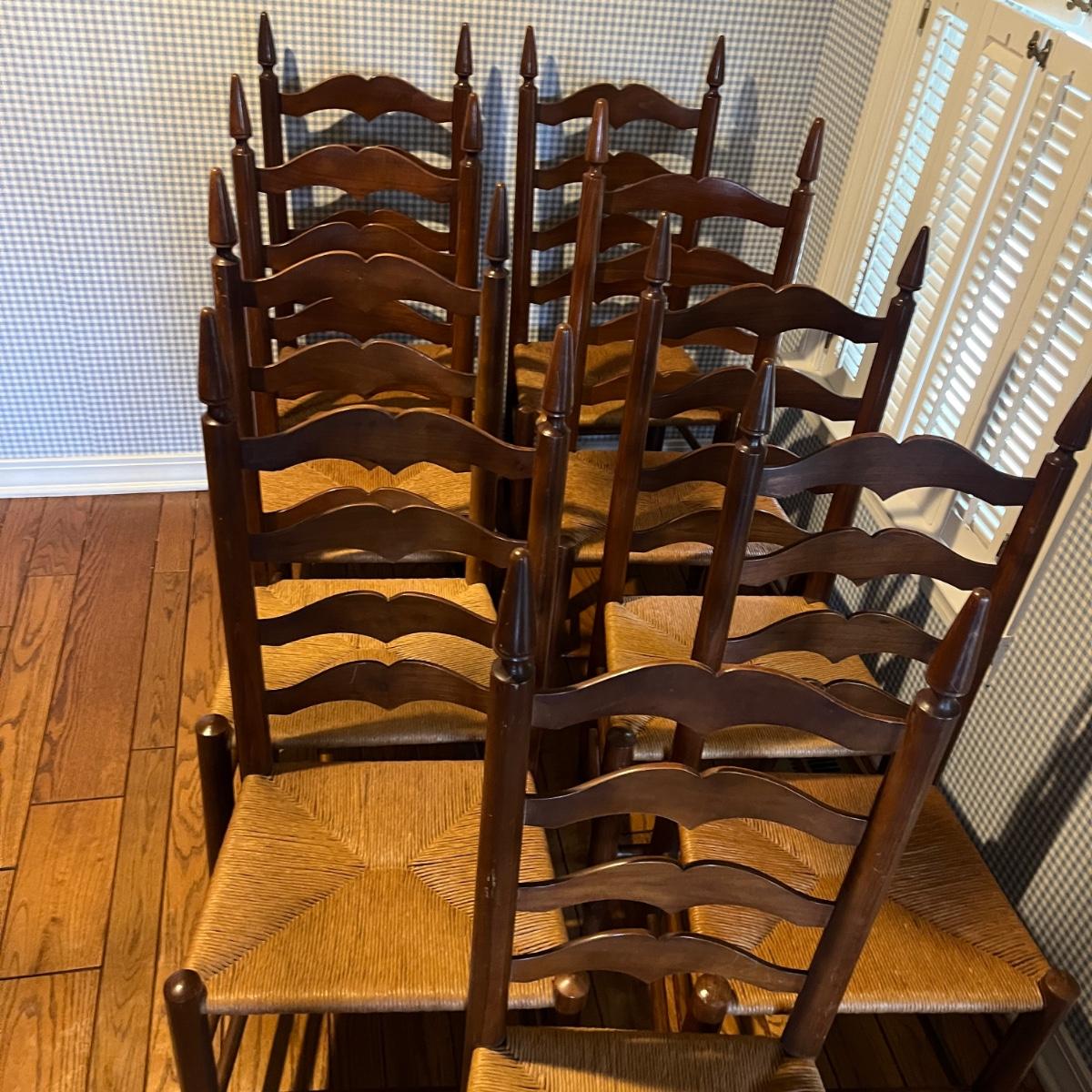 Lot includes nine wooden ladder back chairs with rush seats. Each chair measures 18” x 18” x 42.5”H with a 18” seat height.