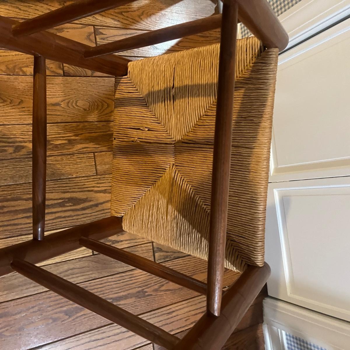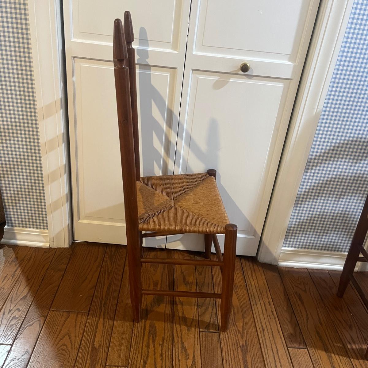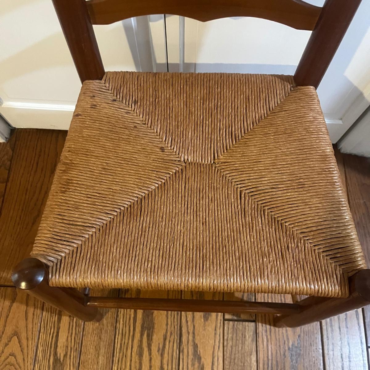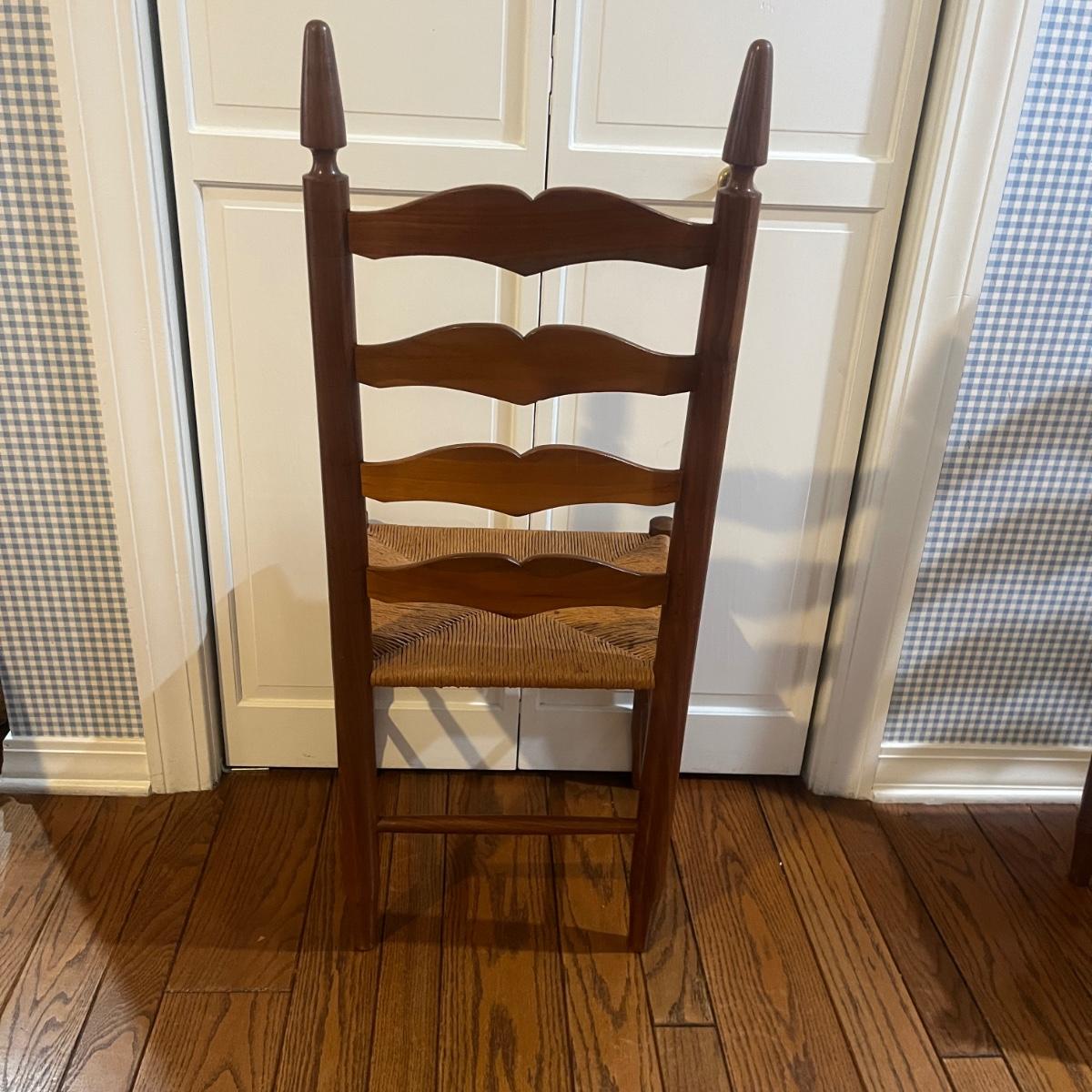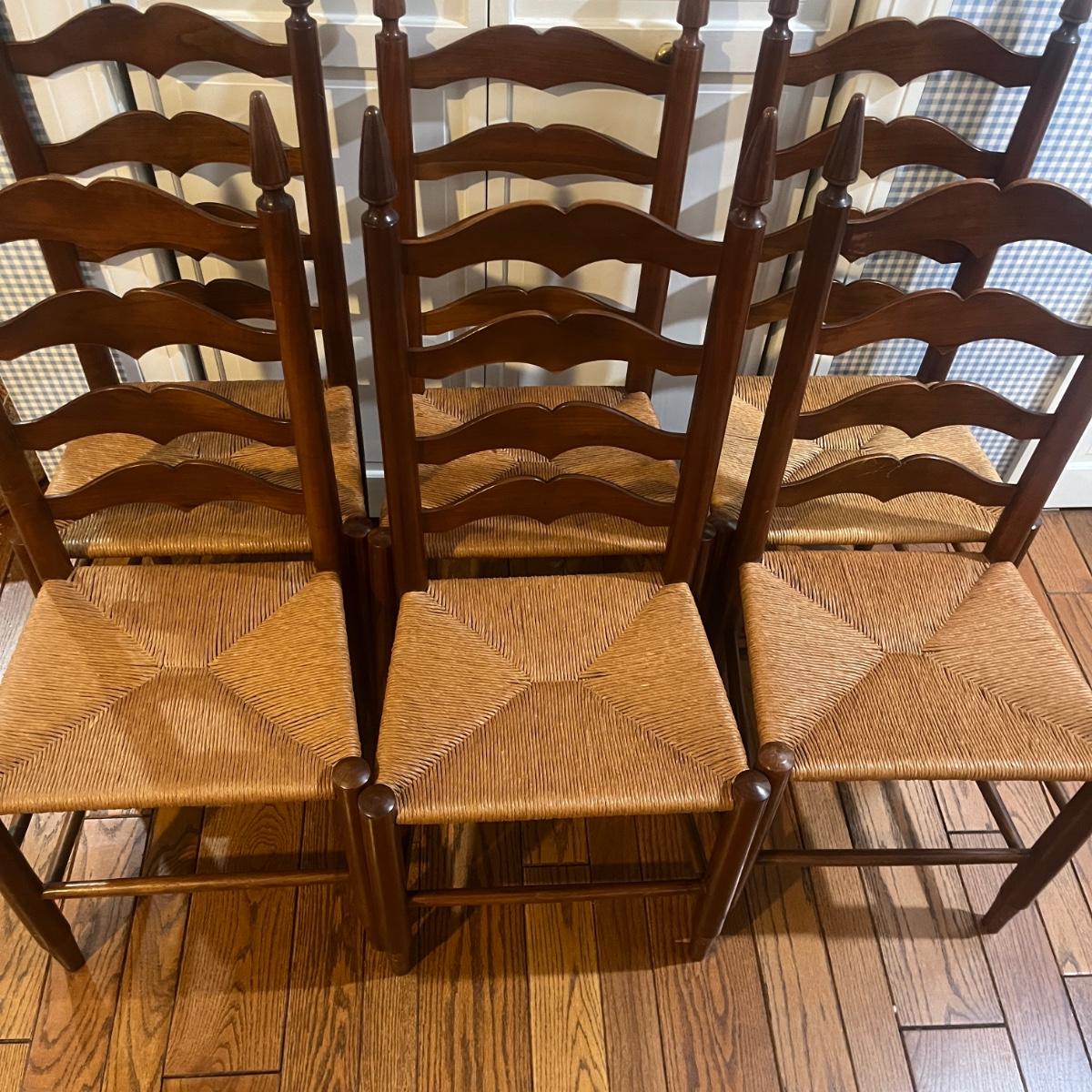 Lot includes nine wooden ladder back chairs with rush seats. Each chair measures 18” x 18” x 42.5”H with a 18” seat height.