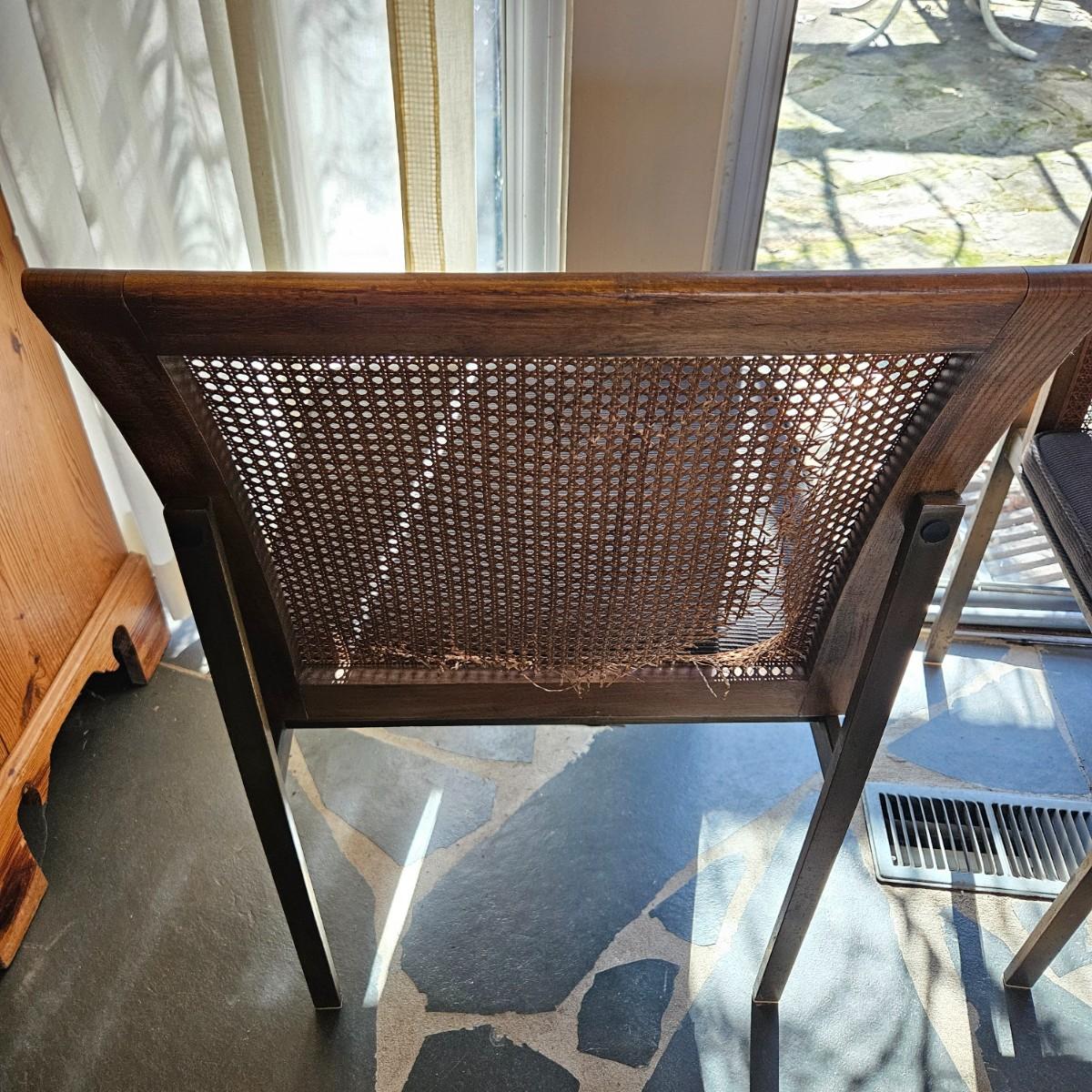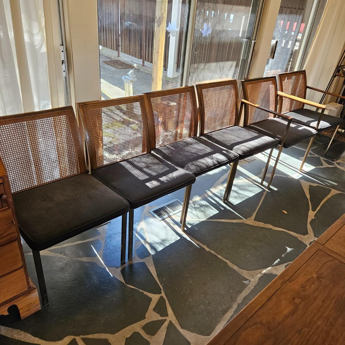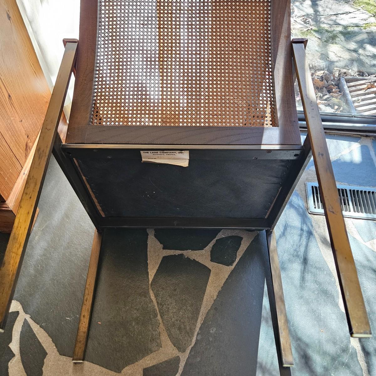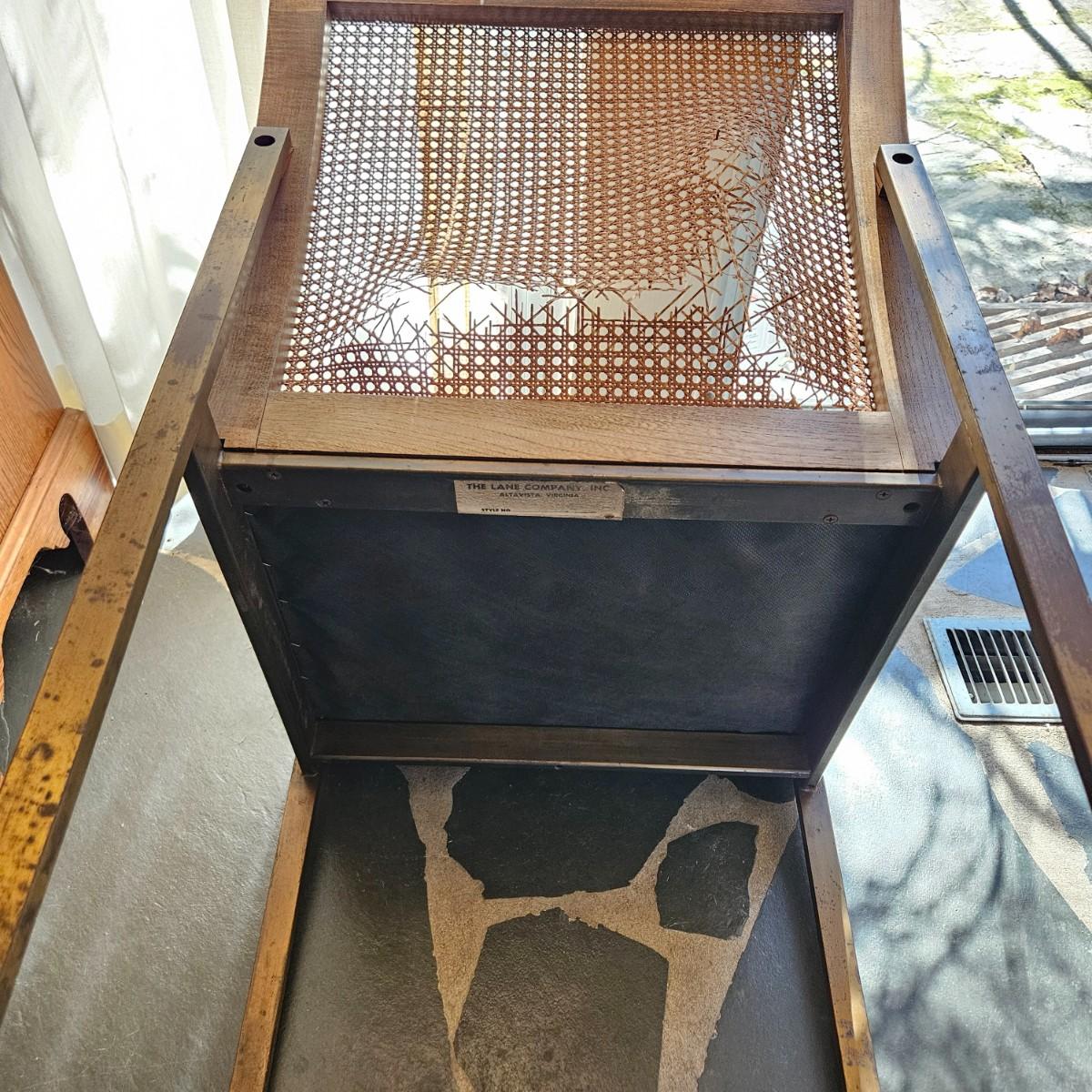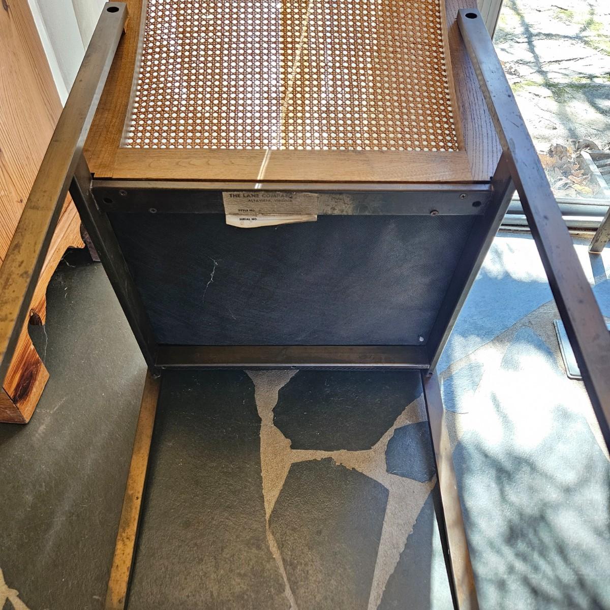 A set of six Lane MCM dining room chairs. These chairs feature woven cane backs, with a black fabric seats and metal legs. The chairs with arms measure approximately 22.5" x 22.5" x 30.5"H with a seat height of 17". Two of the chairs have damaged backs that will likely need replacing. There is also a small split on the arm of one chair and some light discoloration in the seat fabric, see images. Local pickup only