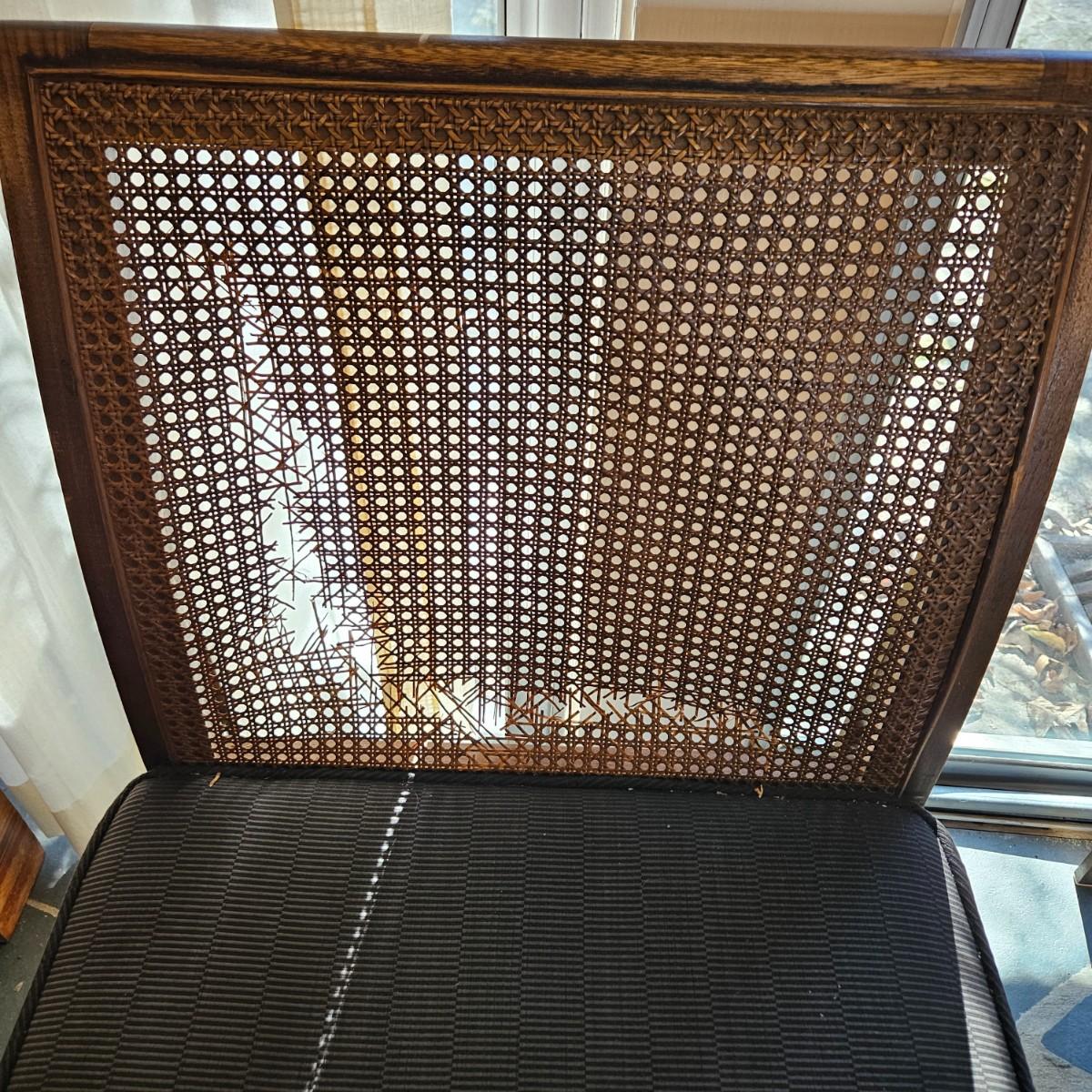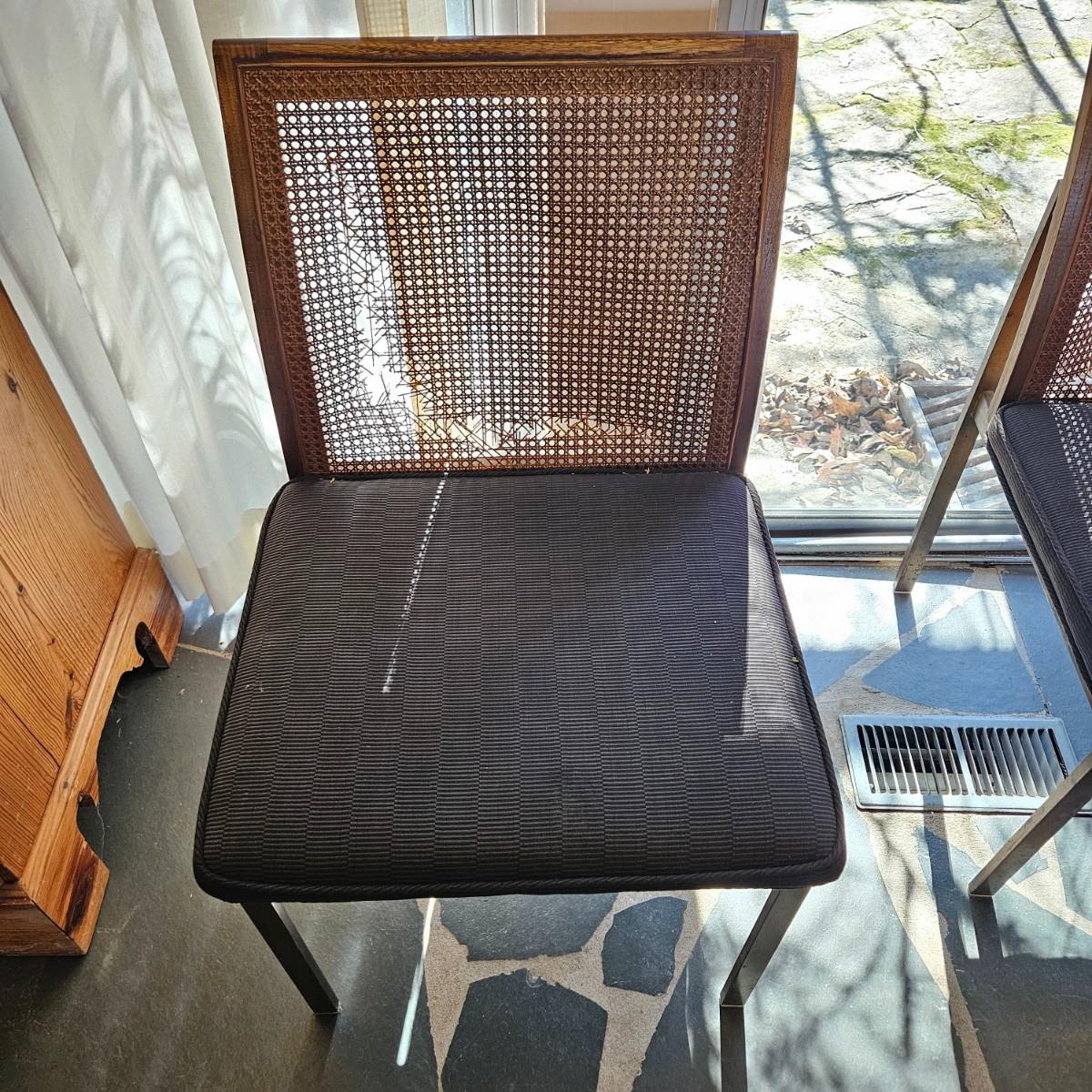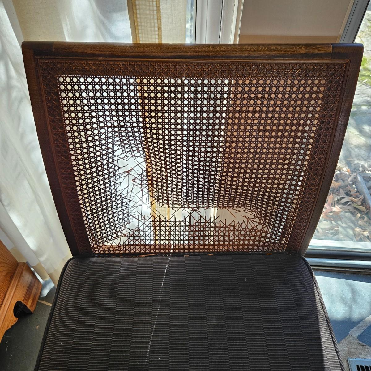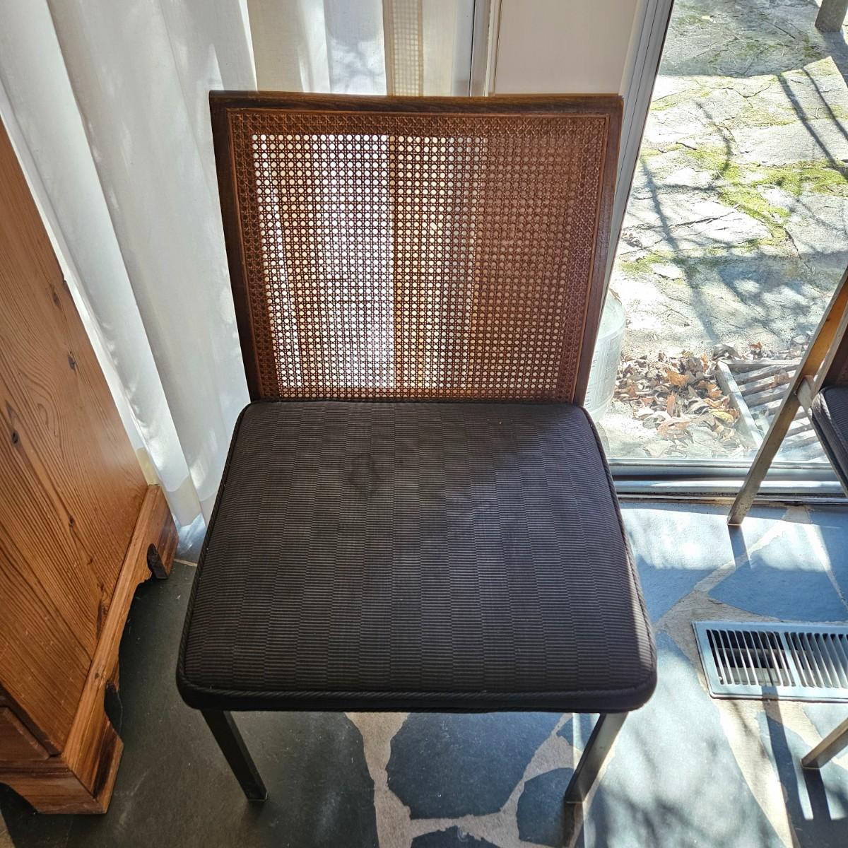A set of six Lane MCM dining room chairs. These chairs feature woven cane backs, with a black fabric seats and metal legs. The chairs with arms measure approximately 22.5" x 22.5" x 30.5"H with a seat height of 17". Two of the chairs have damaged backs that will likely need replacing. There is also a small split on the arm of one chair and some light discoloration in the seat fabric, see images. Local pickup only