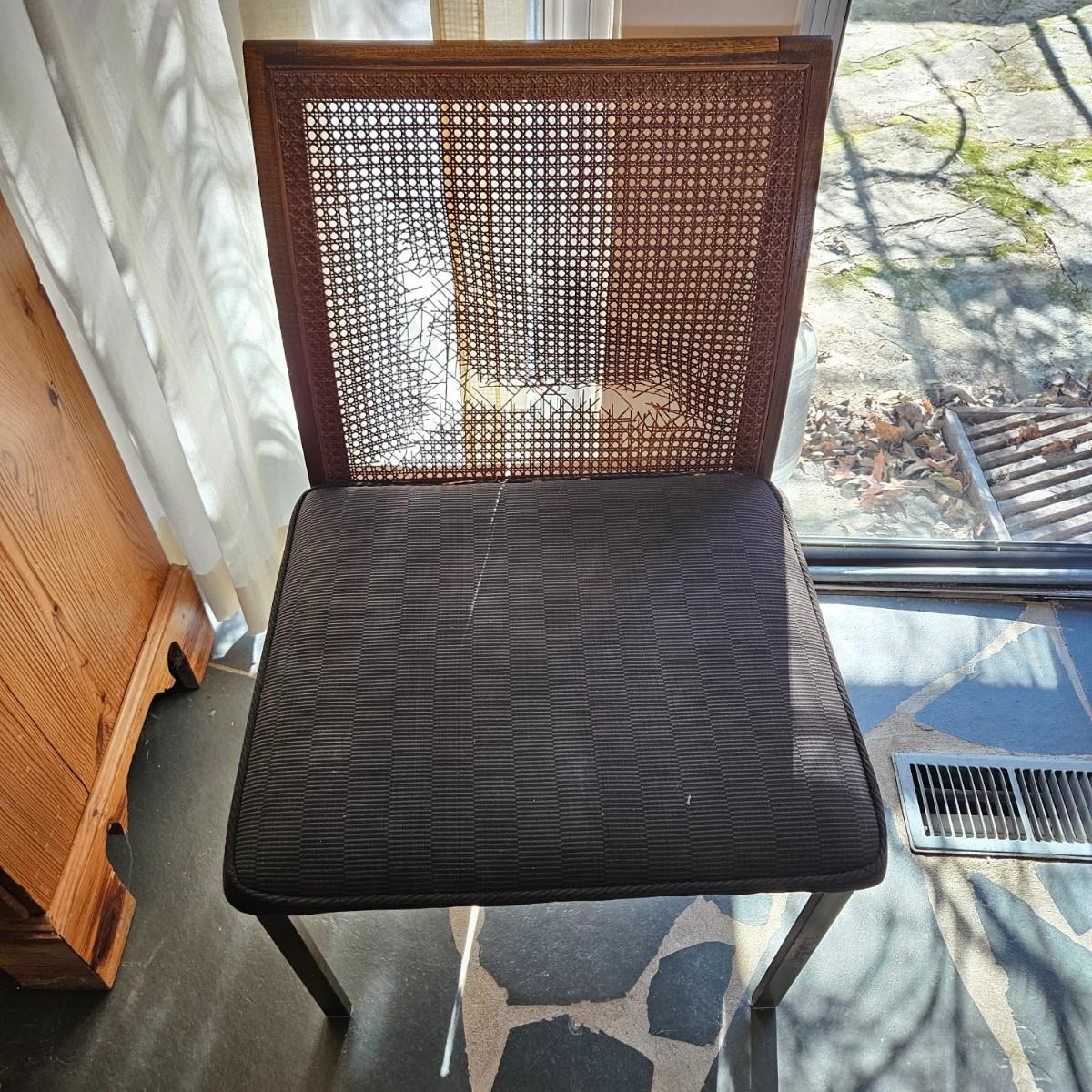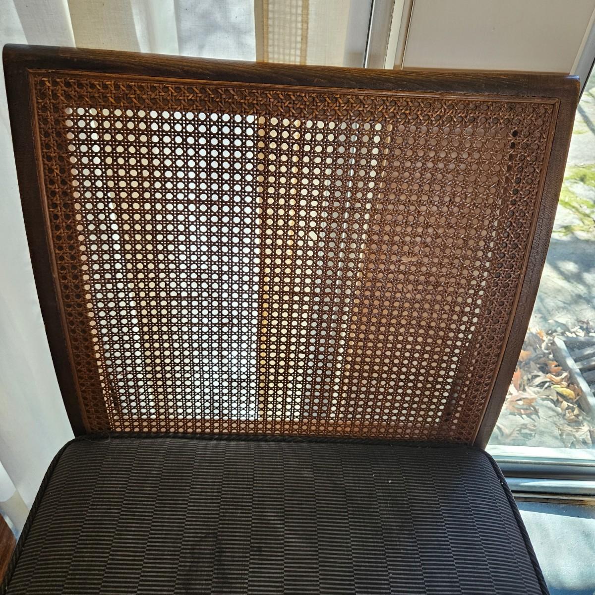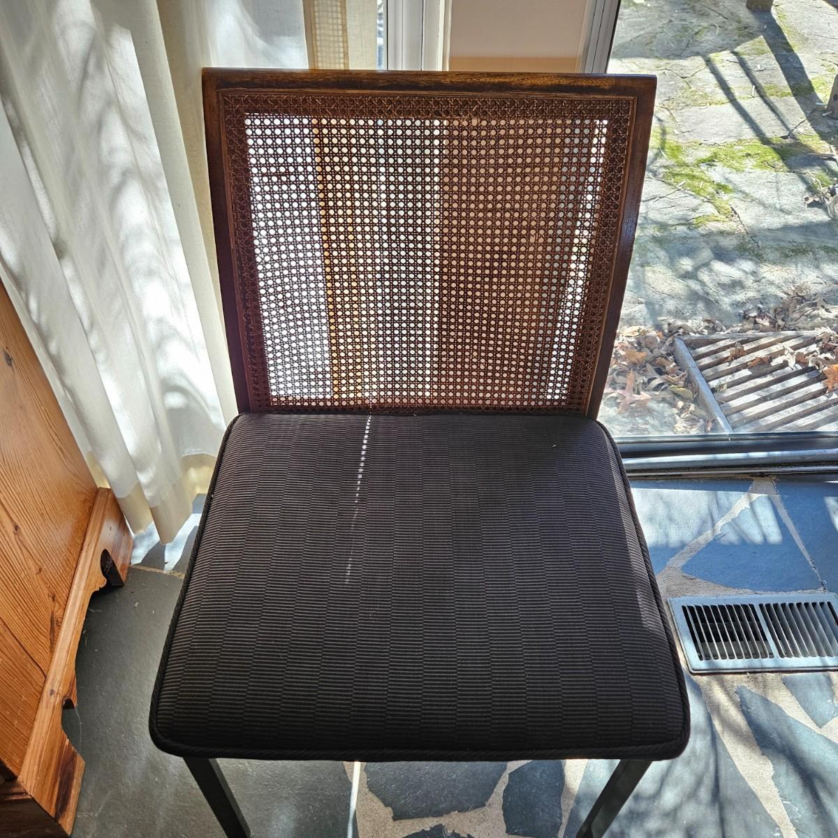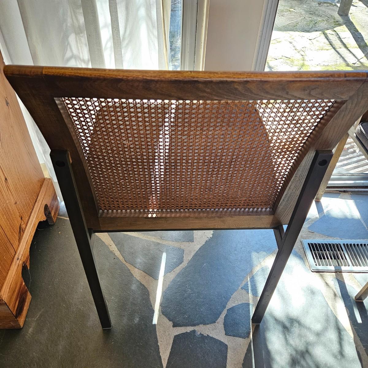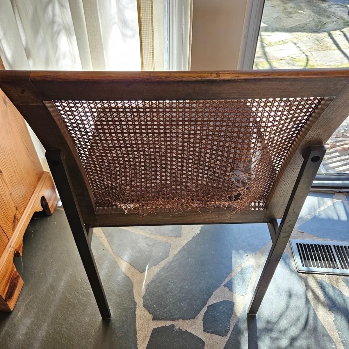A set of six Lane MCM dining room chairs. These chairs feature woven cane backs, with a black fabric seats and metal legs. The chairs with arms measure approximately 22.5" x 22.5" x 30.5"H with a seat height of 17". Two of the chairs have damaged backs that will likely need replacing. There is also a small split on the arm of one chair and some light discoloration in the seat fabric, see images. Local pickup only