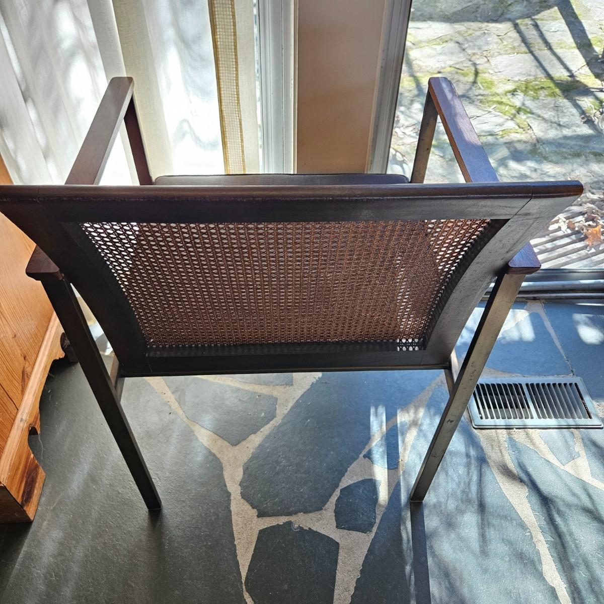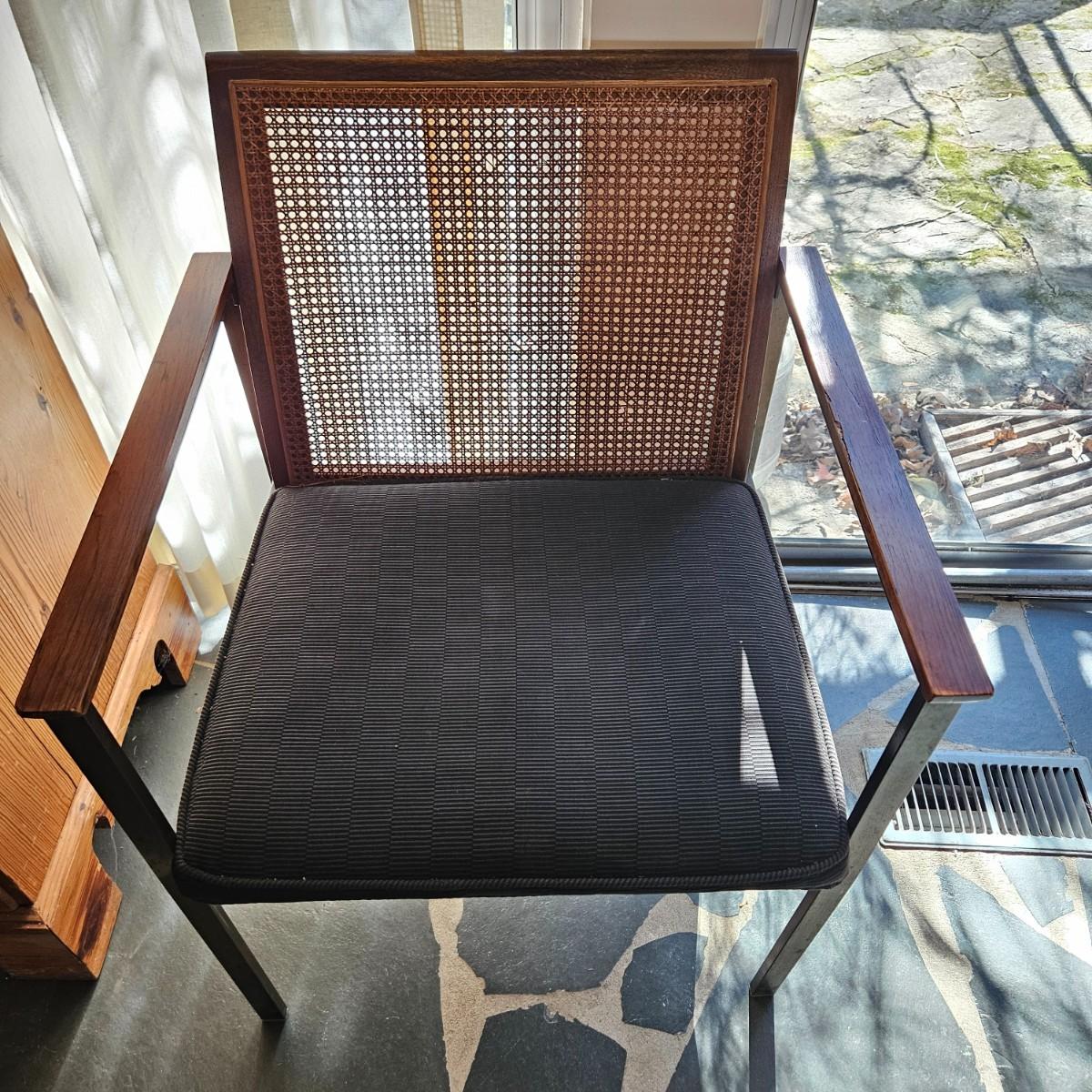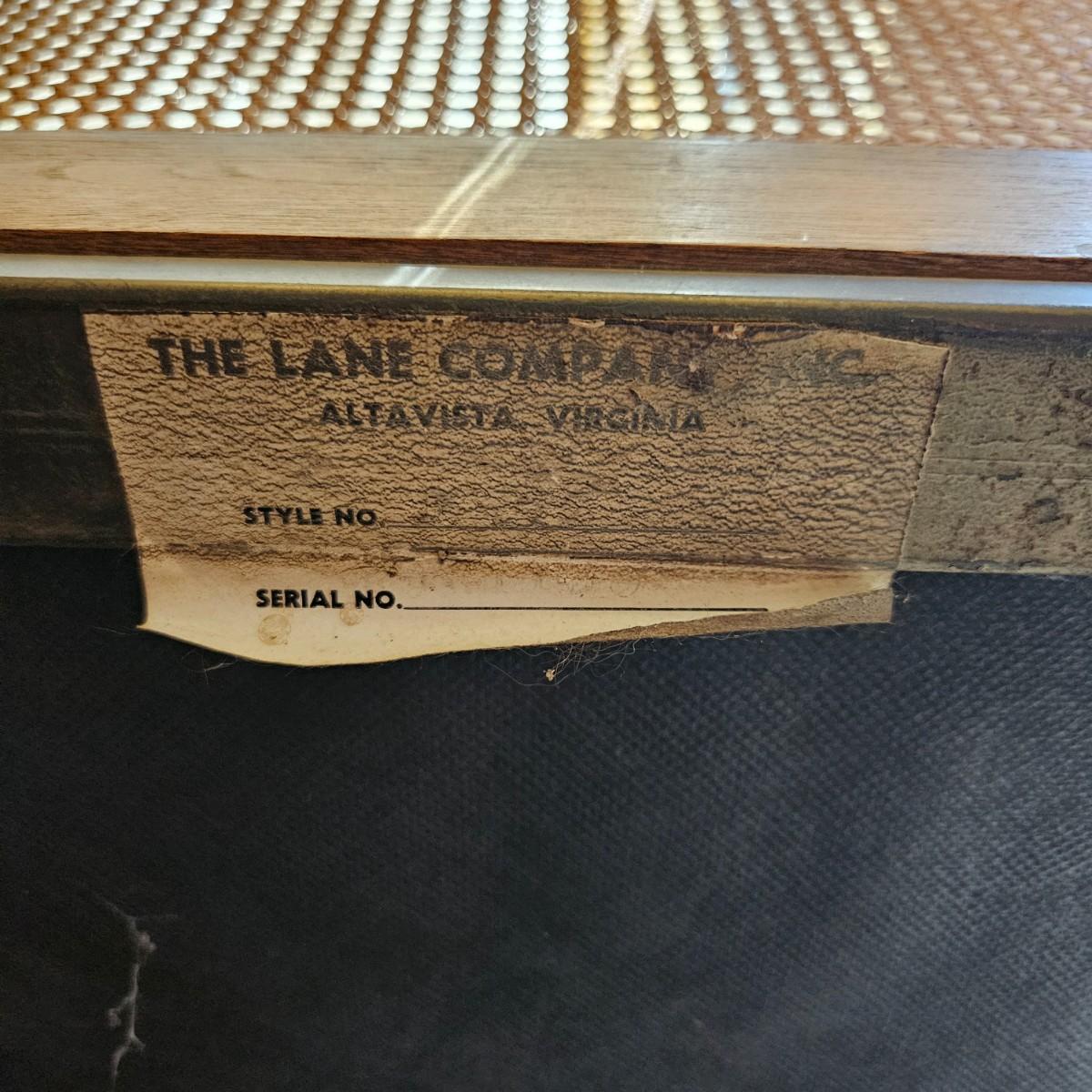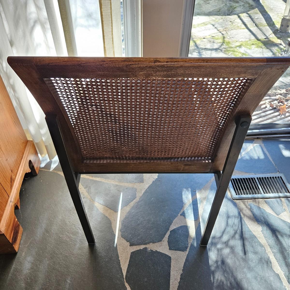 A set of six Lane MCM dining room chairs. These chairs feature woven cane backs, with a black fabric seats and metal legs. The chairs with arms measure approximately 22.5" x 22.5" x 30.5"H with a seat height of 17". Two of the chairs have damaged backs that will likely need replacing. There is also a small split on the arm of one chair and some light discoloration in the seat fabric, see images. Local pickup only
