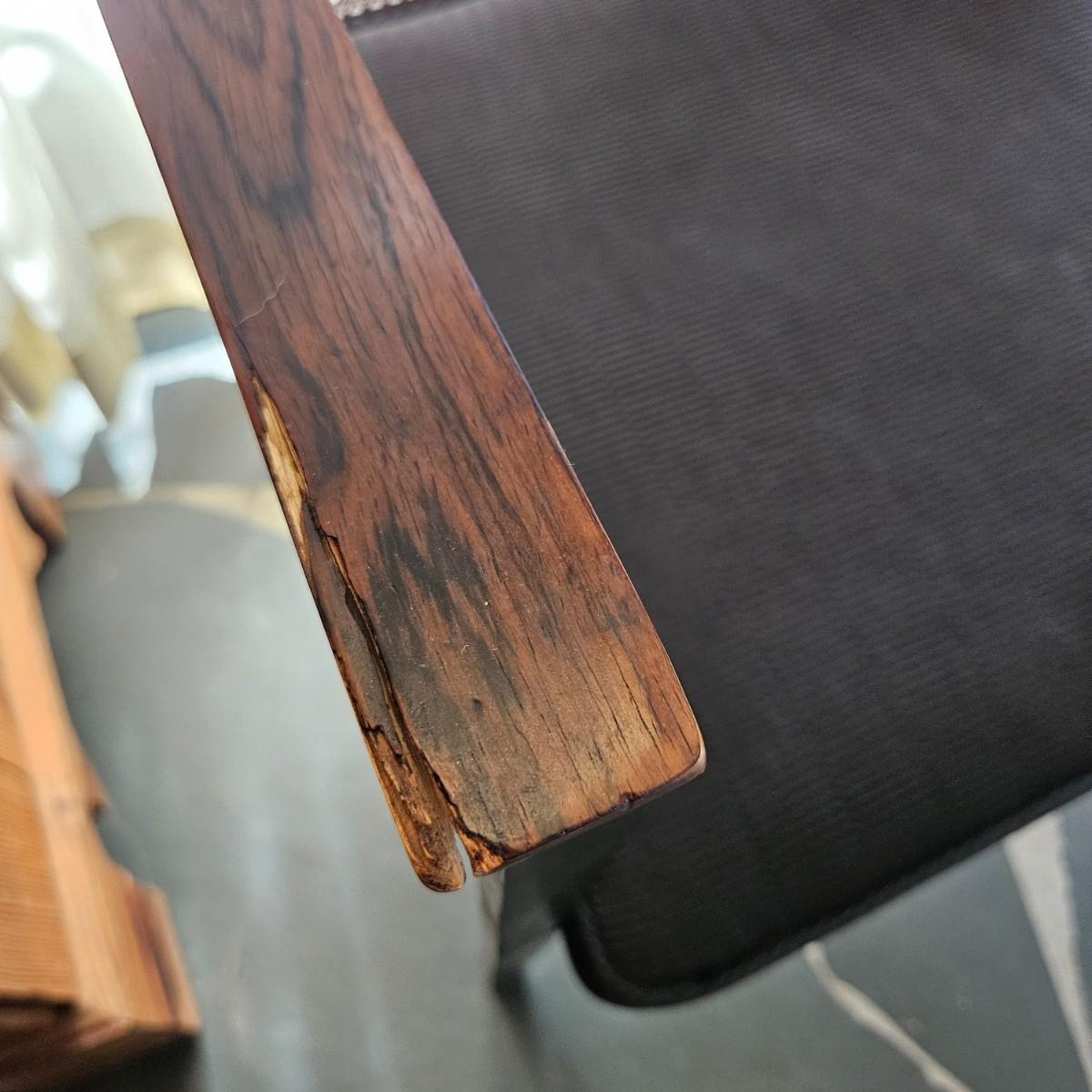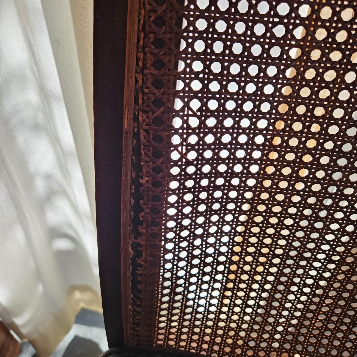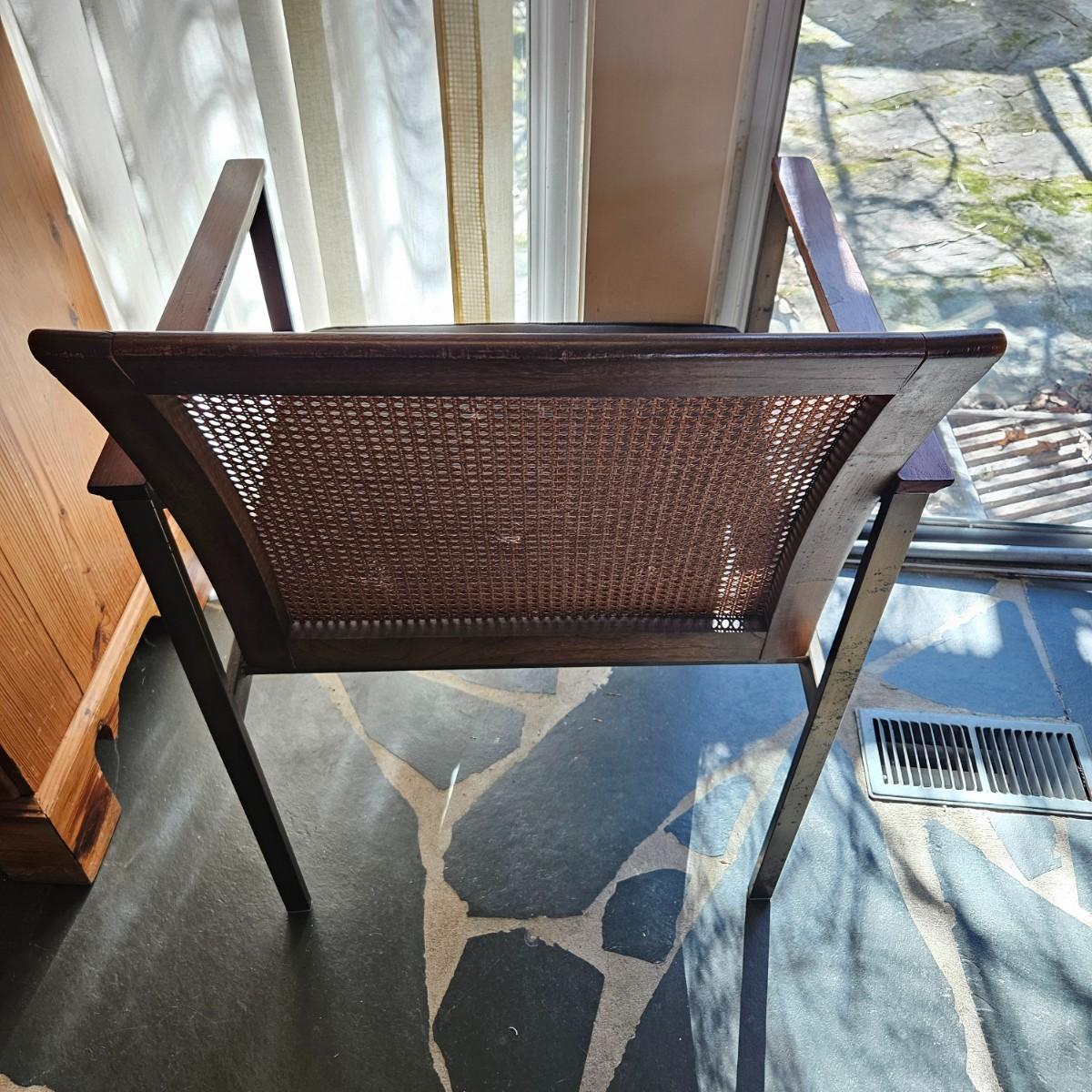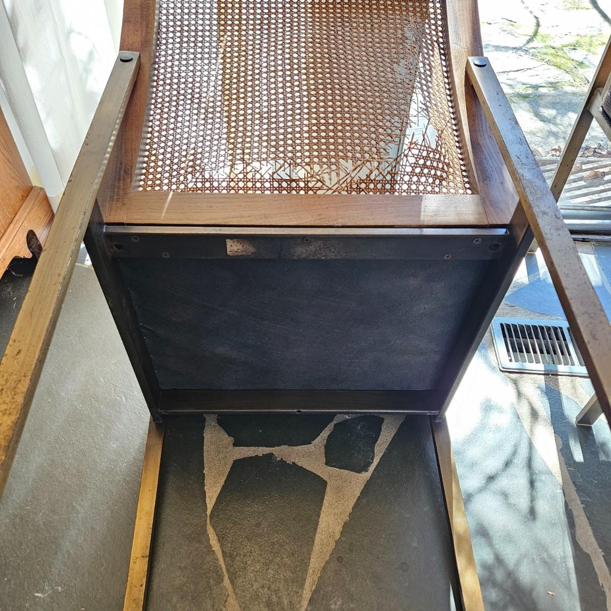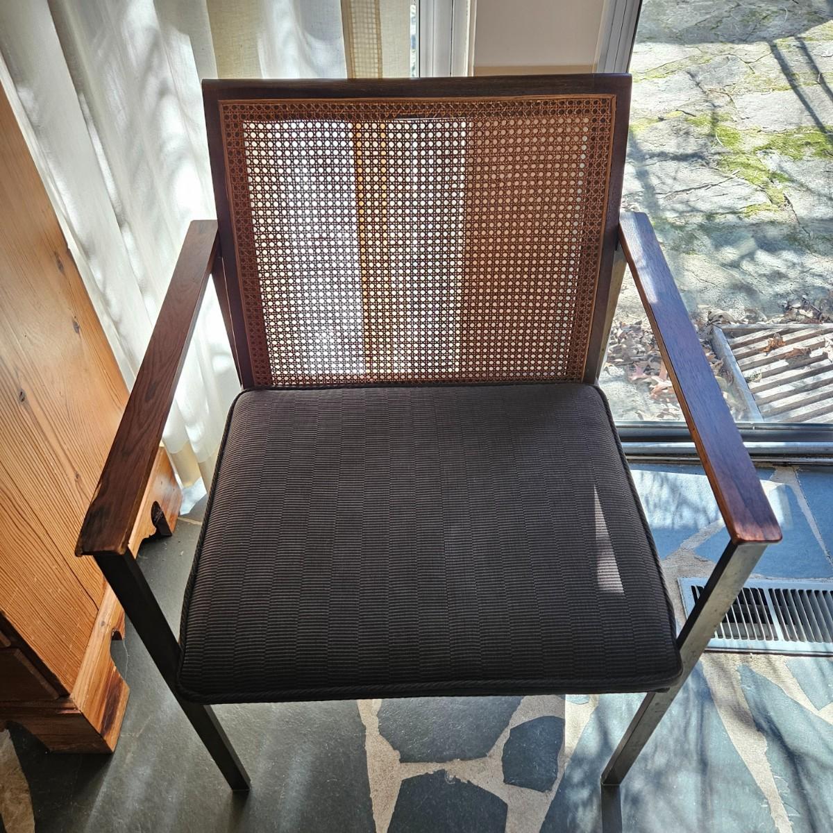 A set of six Lane MCM dining room chairs. These chairs feature woven cane backs, with a black fabric seats and metal legs. The chairs with arms measure approximately 22.5" x 22.5" x 30.5"H with a seat height of 17". Two of the chairs have damaged backs that will likely need replacing. There is also a small split on the arm of one chair and some light discoloration in the seat fabric, see images. Local pickup only