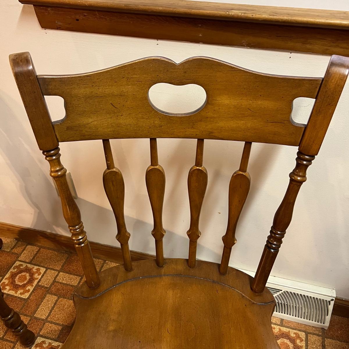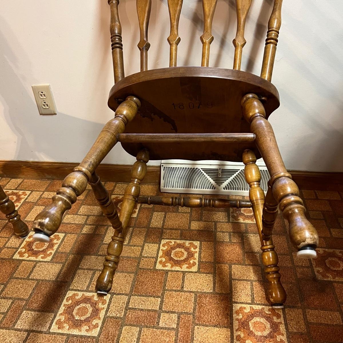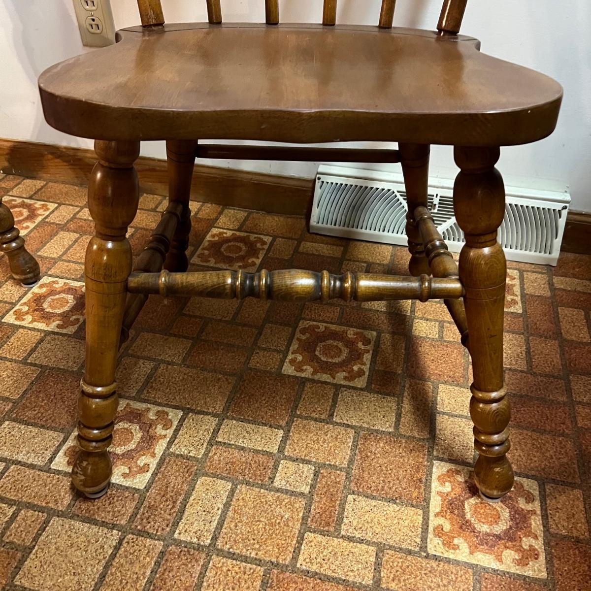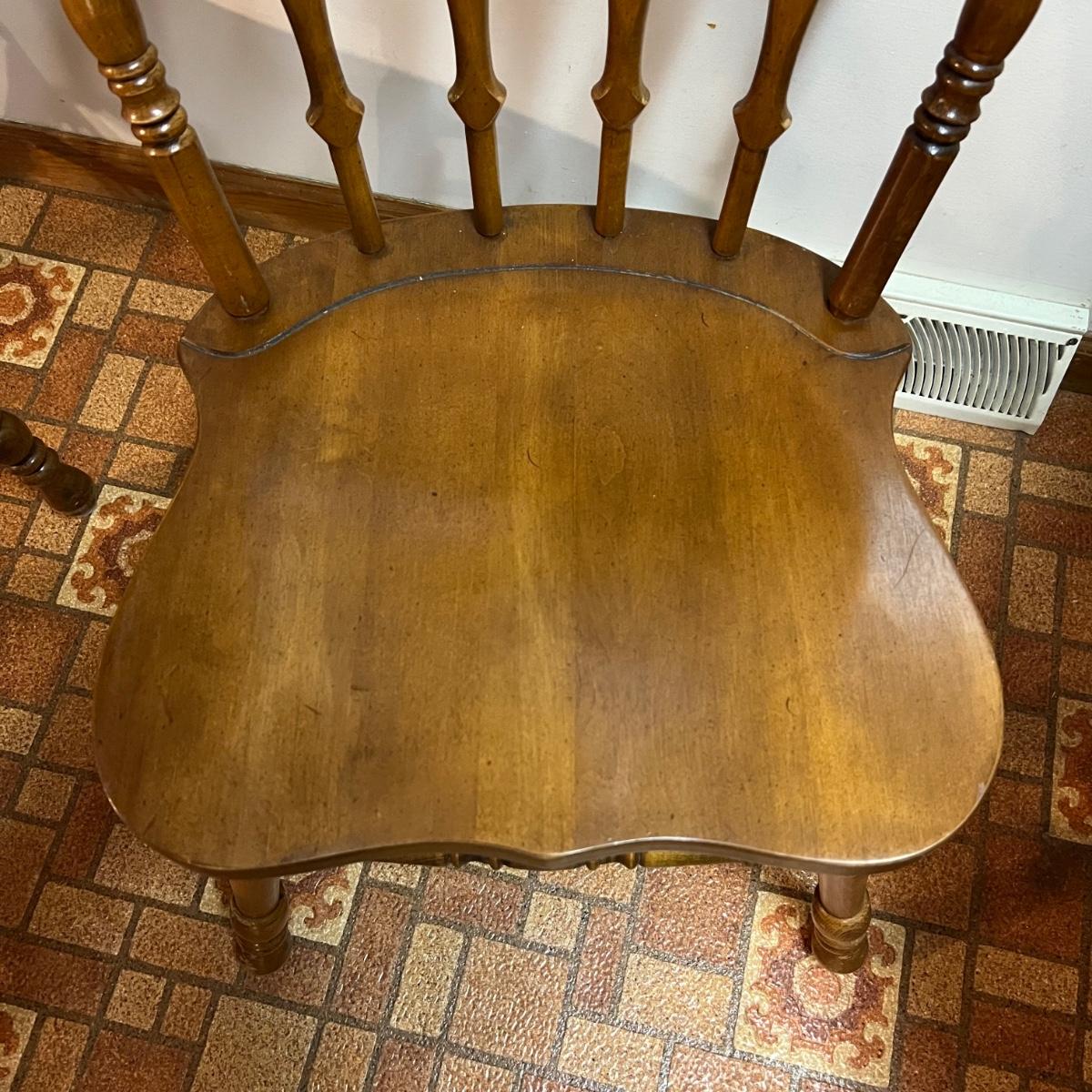 These solid wood chairs are made by Cochrane and are good and sturdy spindle back chairs. Chairs have a few minor scratches, see images.