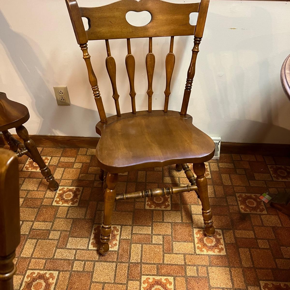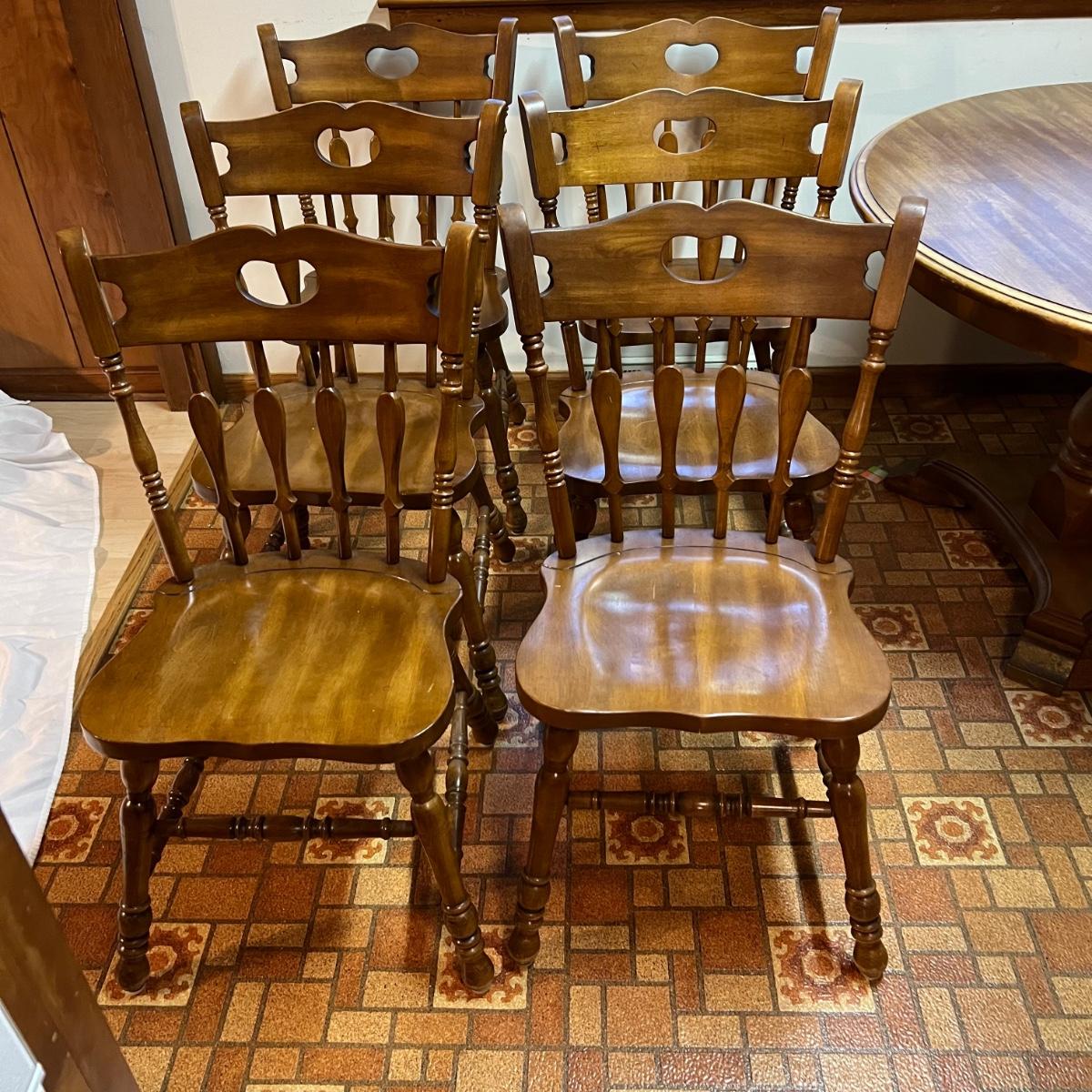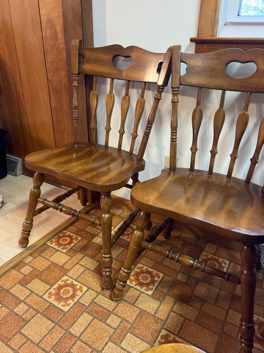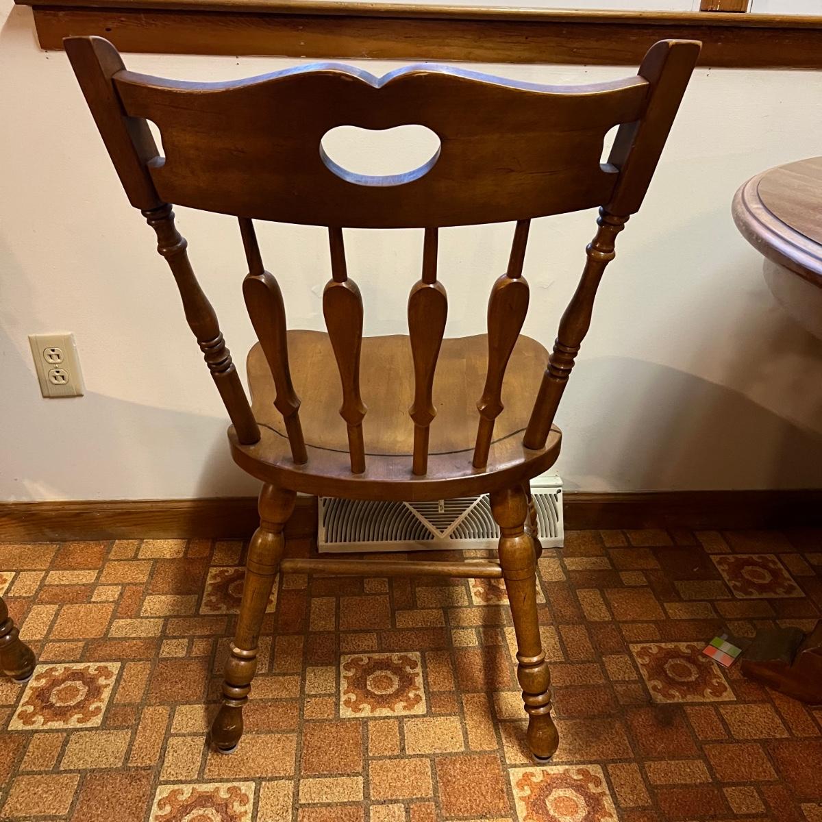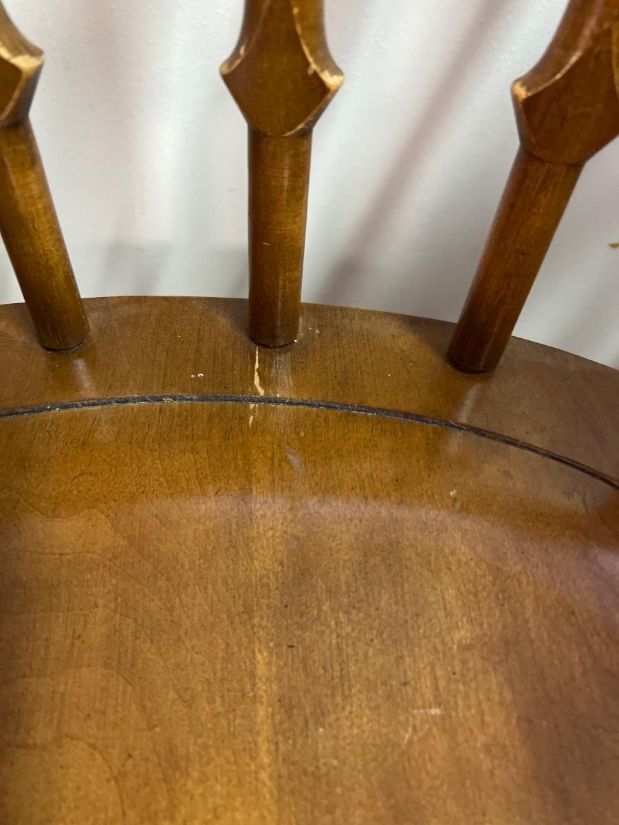 These solid wood chairs are made by Cochrane and are good and sturdy spindle back chairs. Chairs have a few minor scratches, see images.
