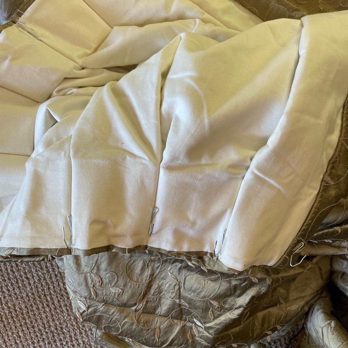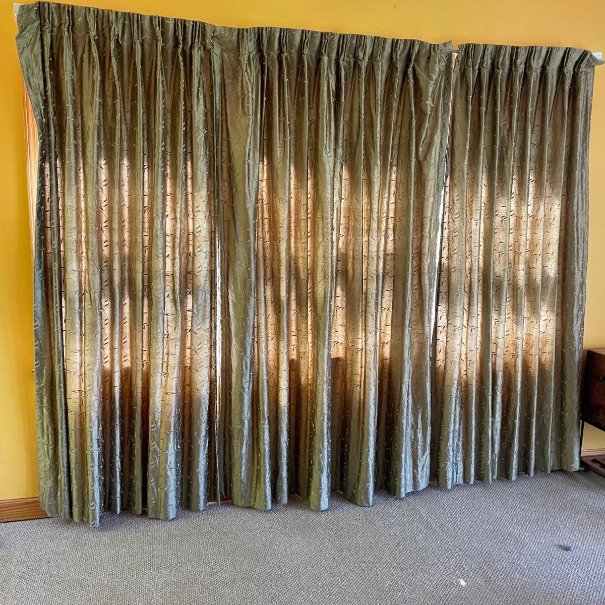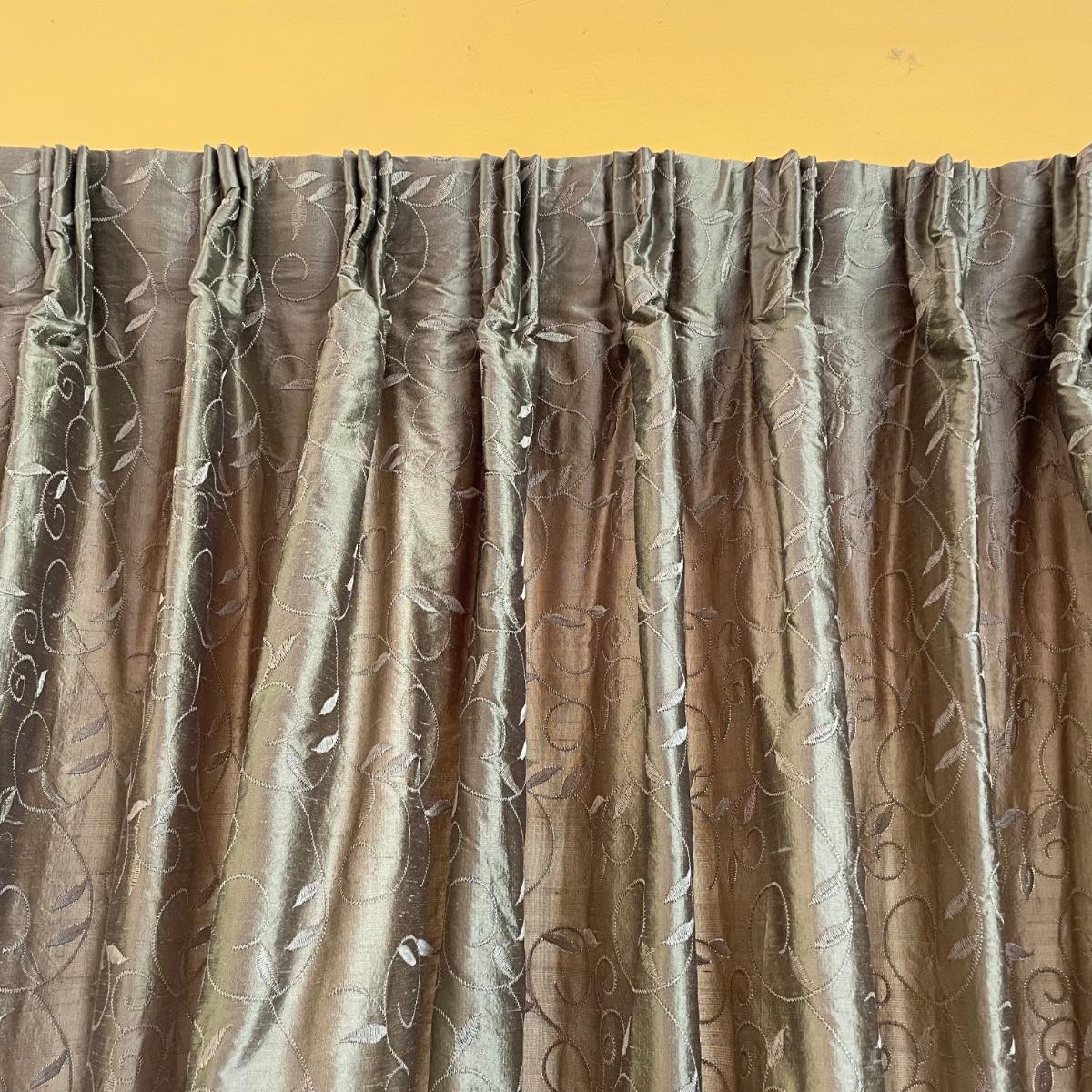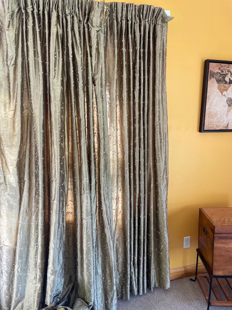 These attractive matching drapes are lined and are a silk like material that’s an olive green with a leaf design. All six are the same size measuring approximately 88” long and 32” wide when hung, actual width is 90” wide. Images were taken on a very sunny day with full and direct sunlight. Only one panel has metal hanging hooks.