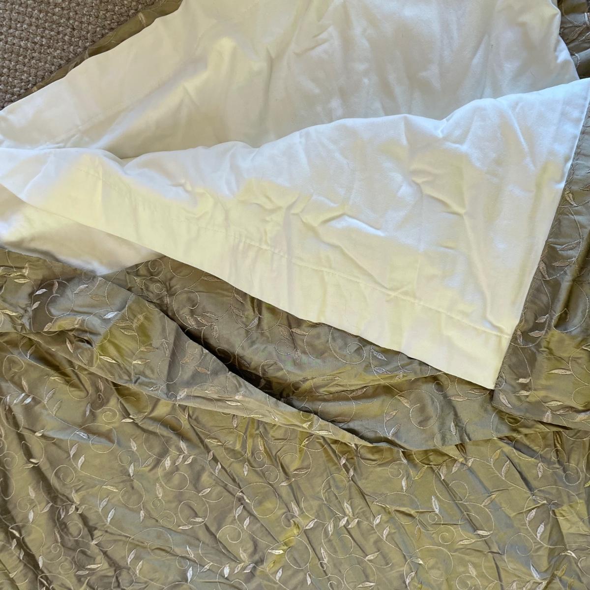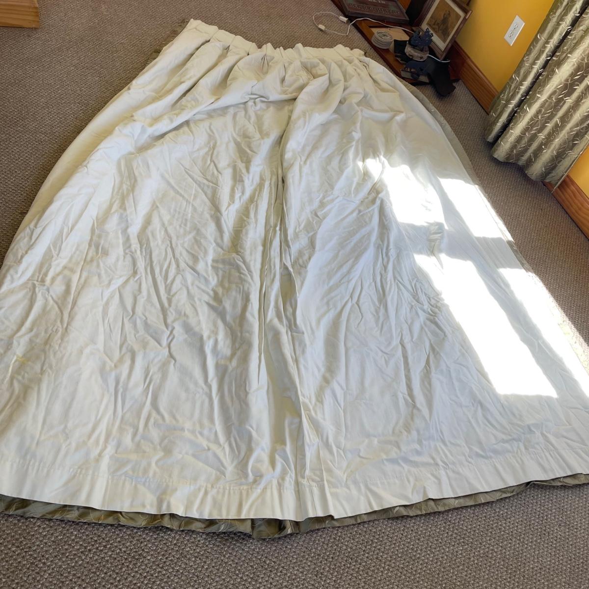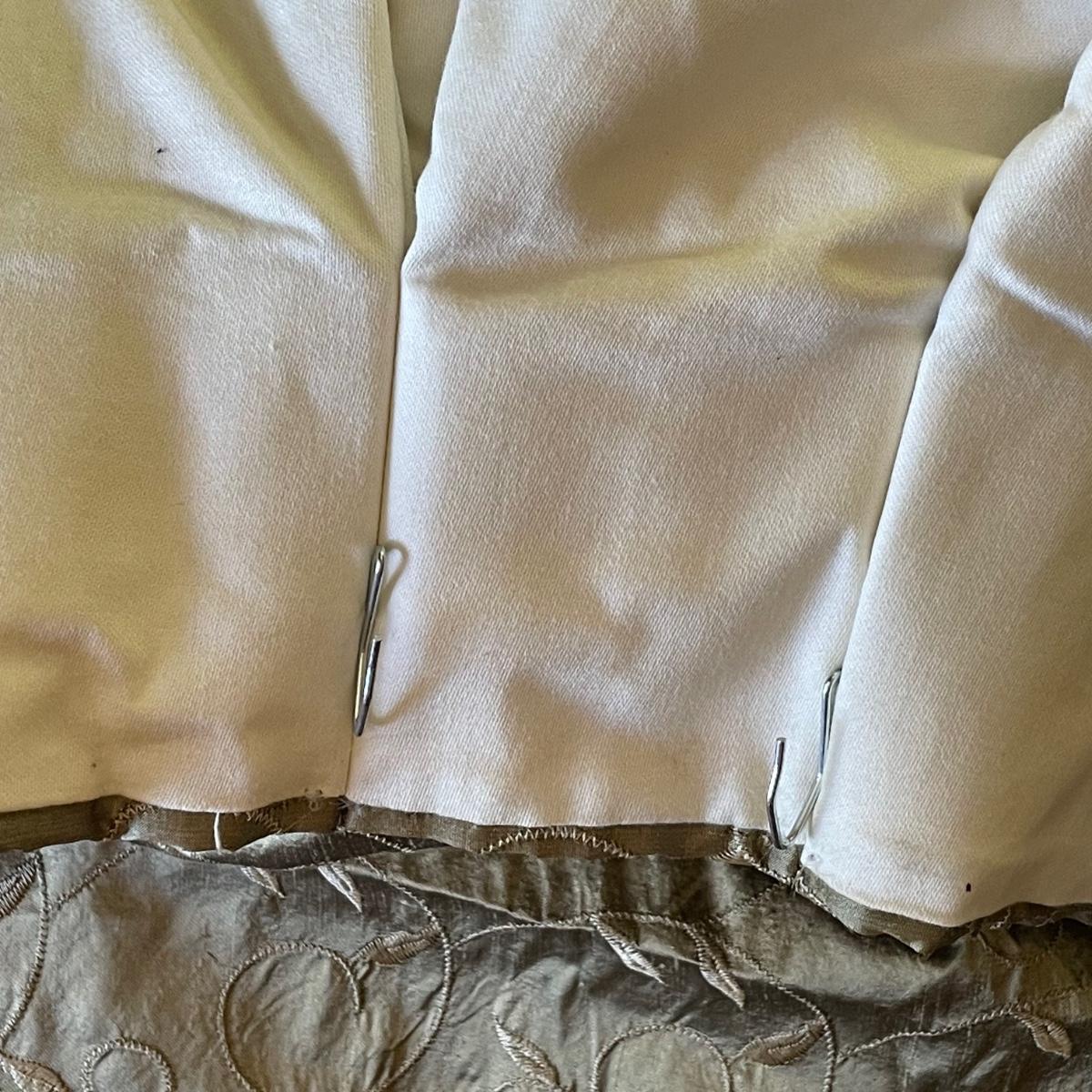 These attractive matching drapes are lined and are a silk like material that’s an olive green with a leaf design. All six are the same size measuring approximately 88” long and 32” wide when hung, actual width is 90” wide. Images were taken on a very sunny day with full and direct sunlight. Only one panel has metal hanging hooks.