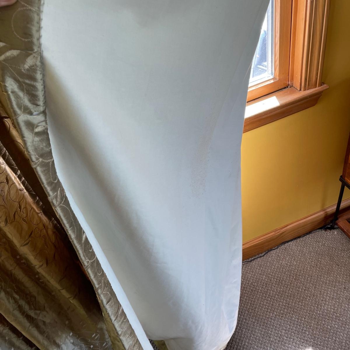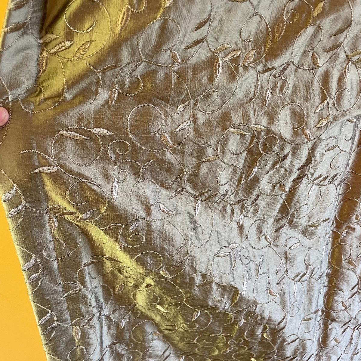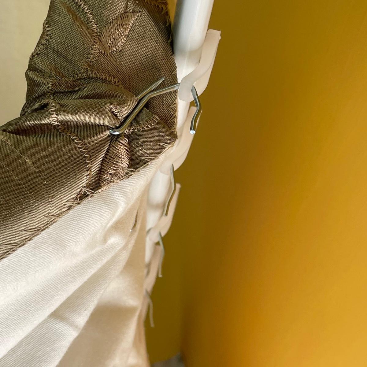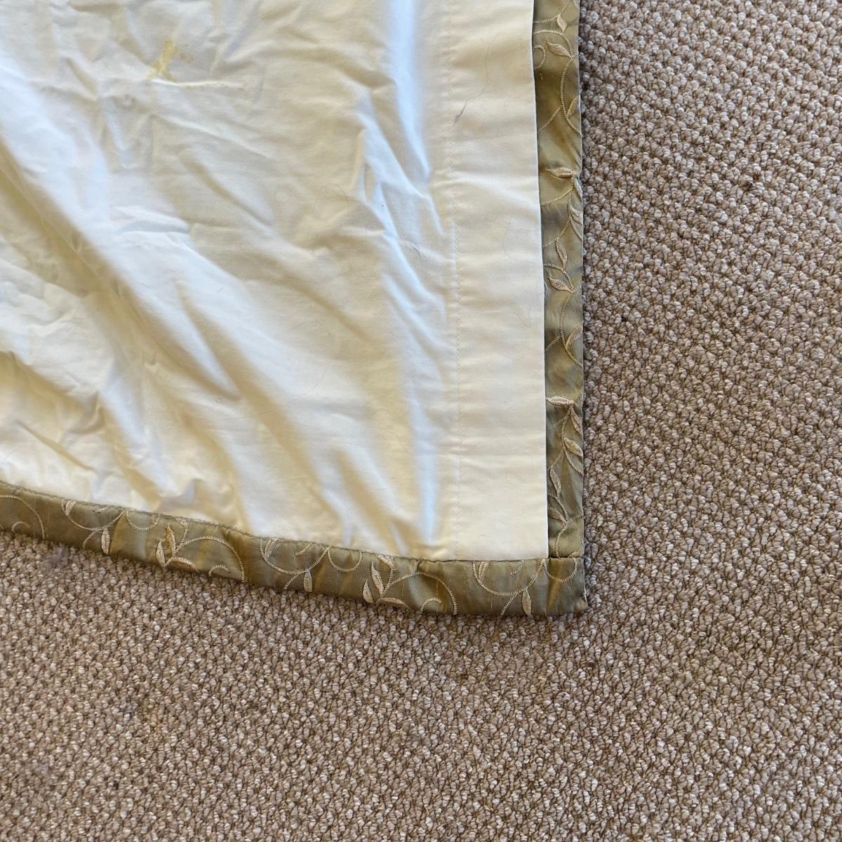 These attractive matching drapes are lined and are a silk like material that’s an olive green with a leaf design. All six are the same size measuring approximately 88” long and 32” wide when hung, actual width is 90” wide. Images were taken on a very sunny day with full and direct sunlight. Only one panel has metal hanging hooks.