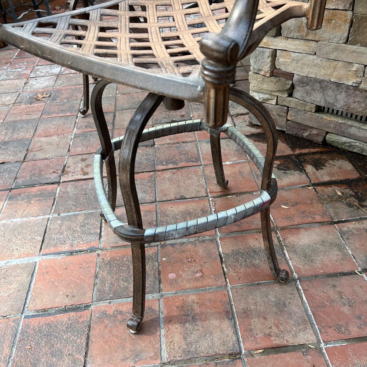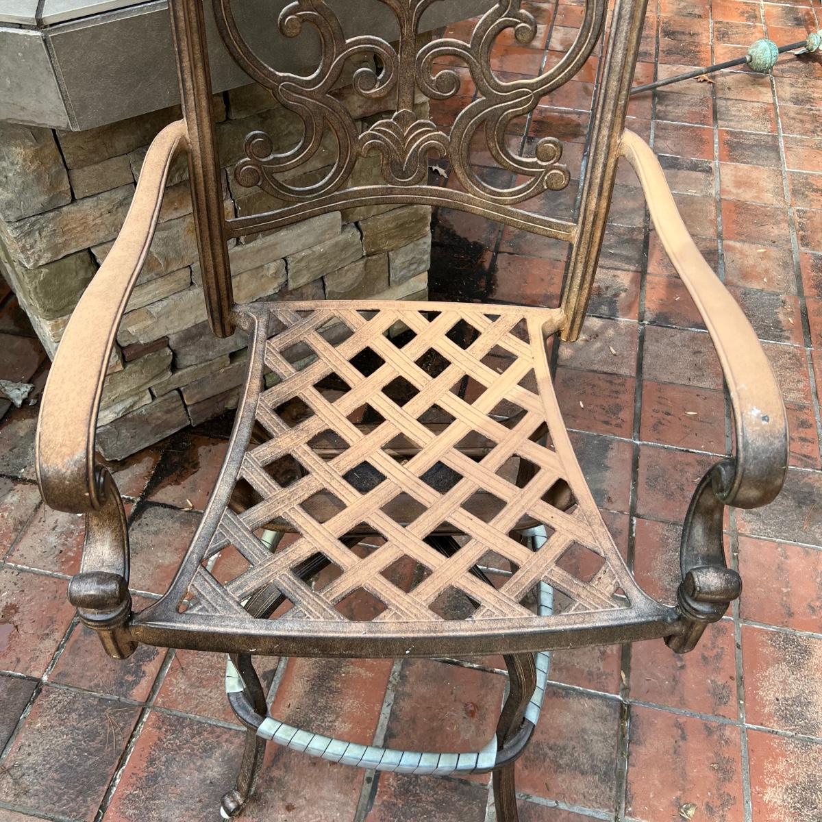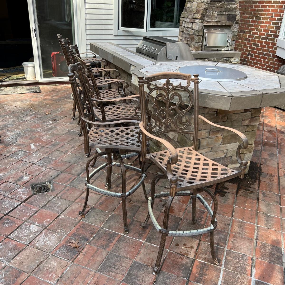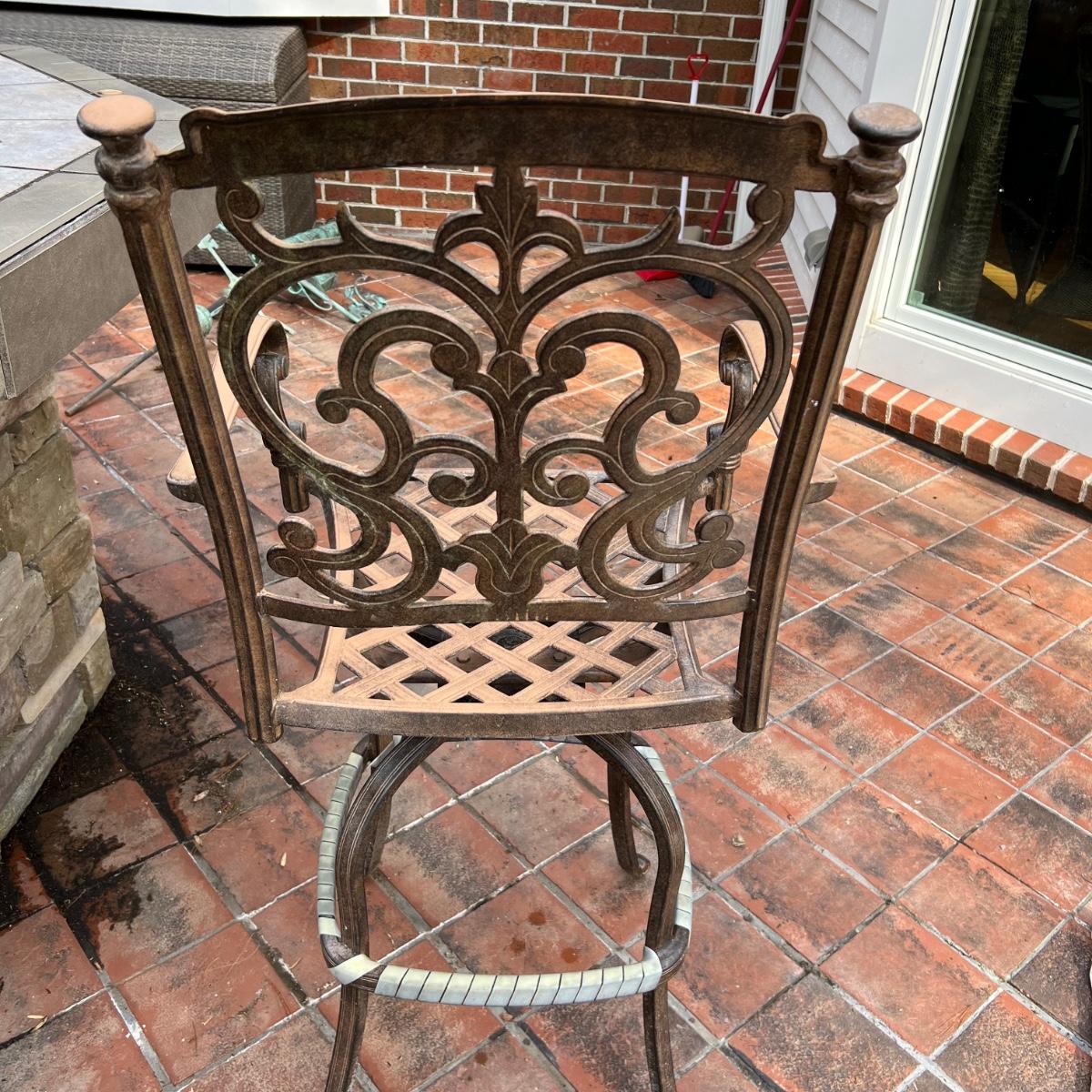 A matching set of six bar stools/chairs that are finished in a rust brown. All chairs swivel easily. The only blemishes found are on two chairs which are shown in images, they include some hardened grout on one and a small rub mark on another. All chairs have a thick plastic wrapped around the lower section which is probably for protection and could be removed.